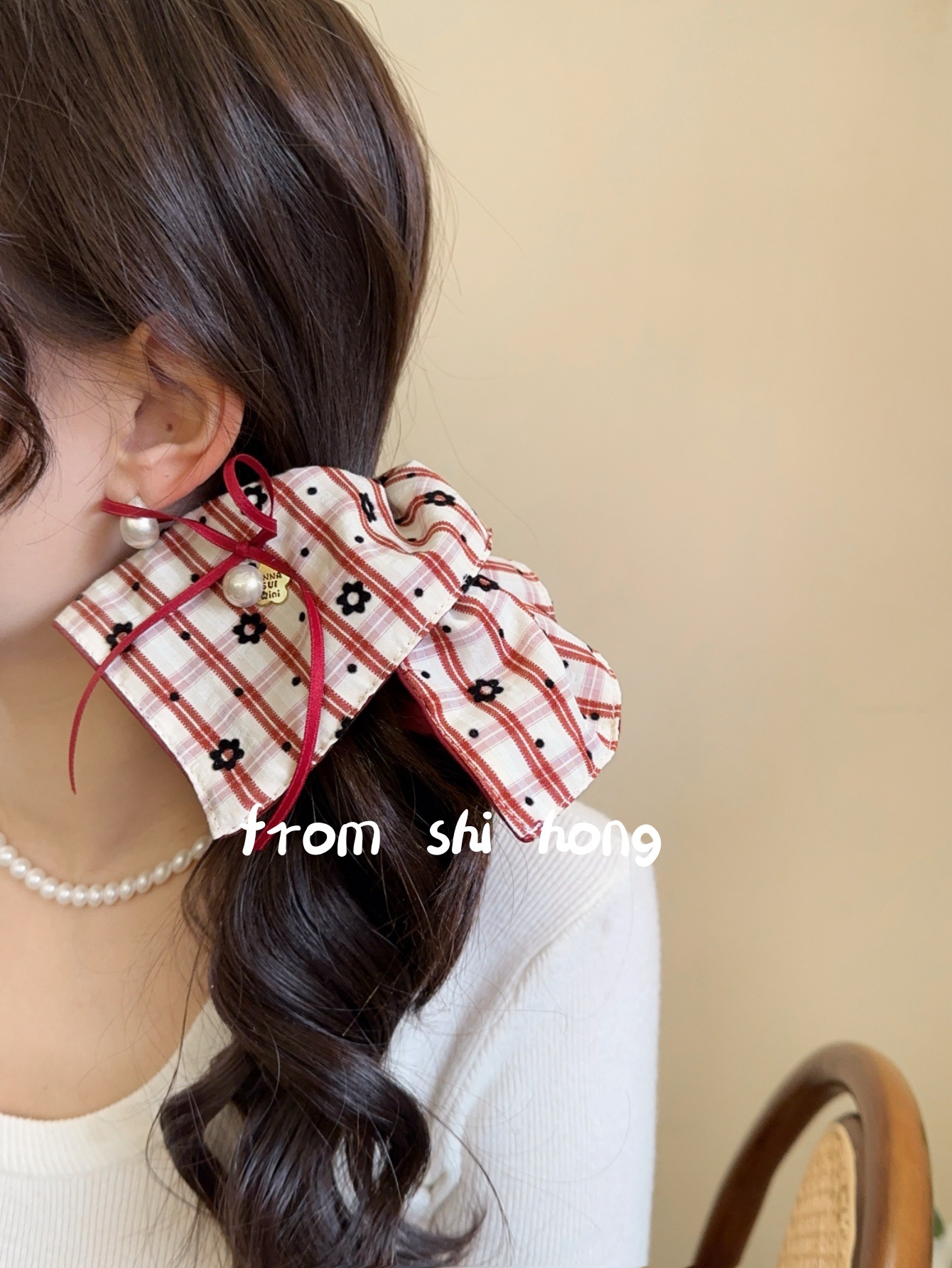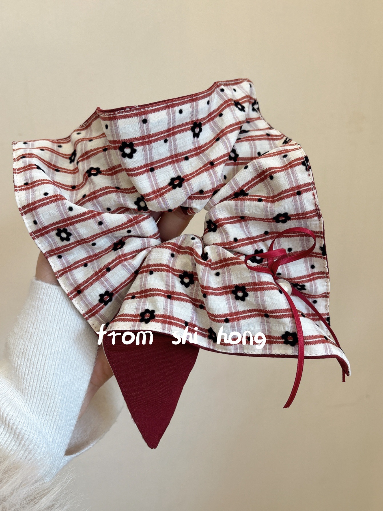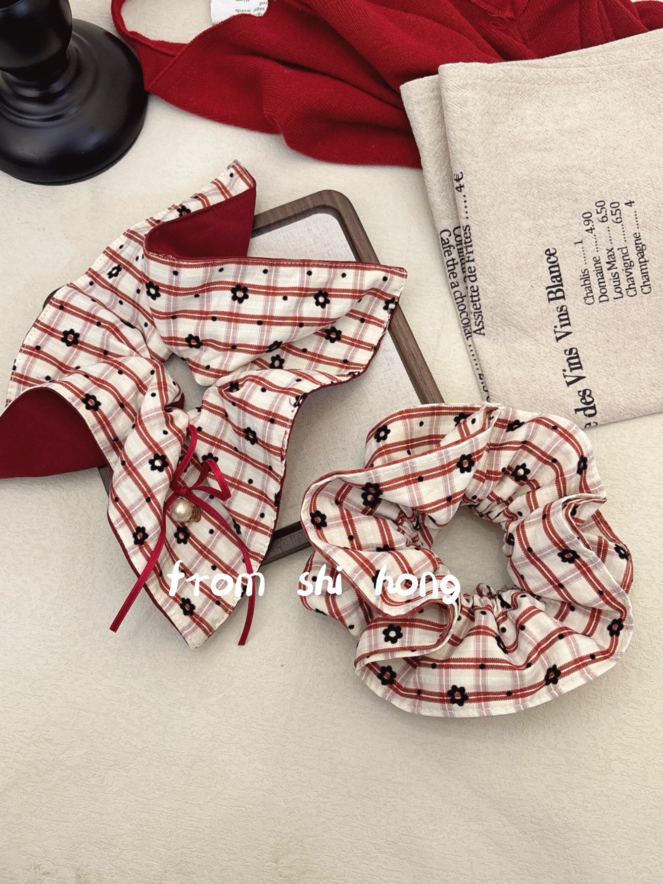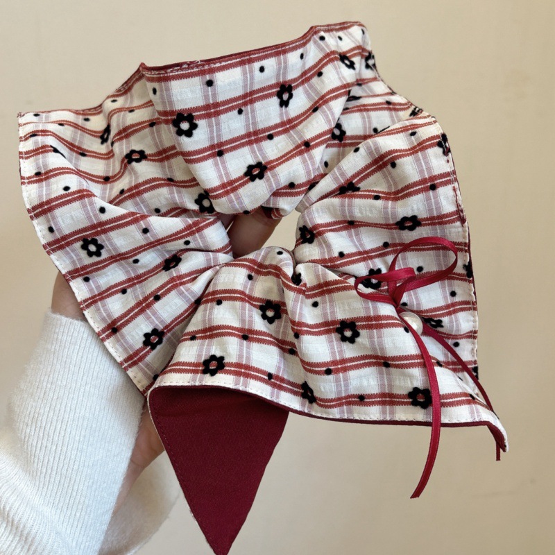 • 붉은 격자 무늬 - 플로킹 꽃 사각 스카프 머리끈