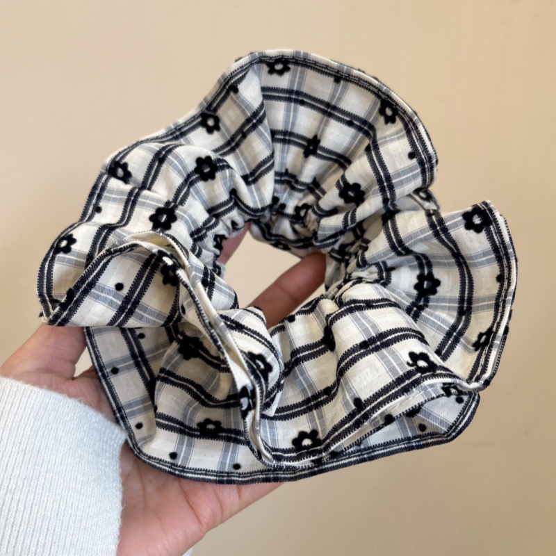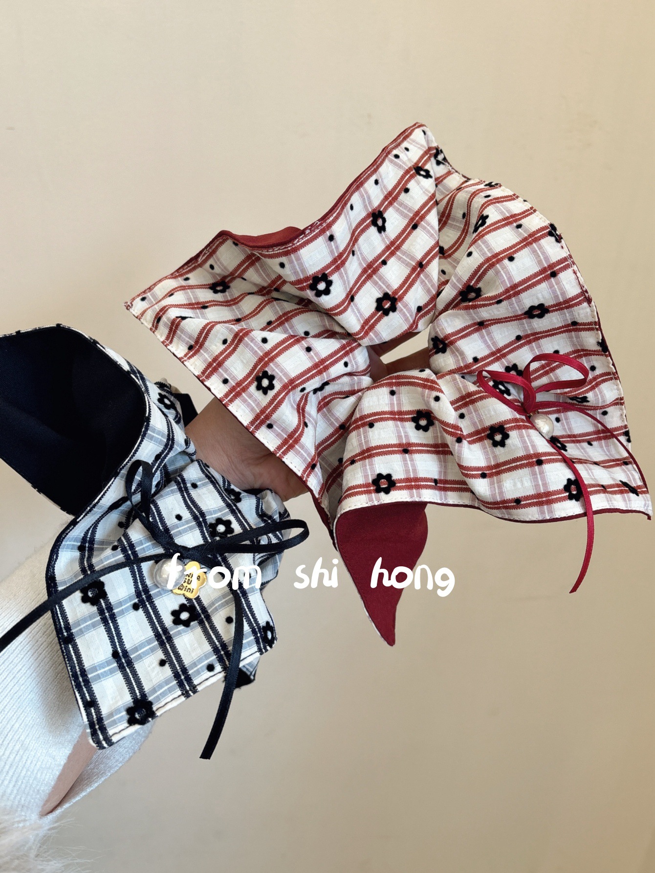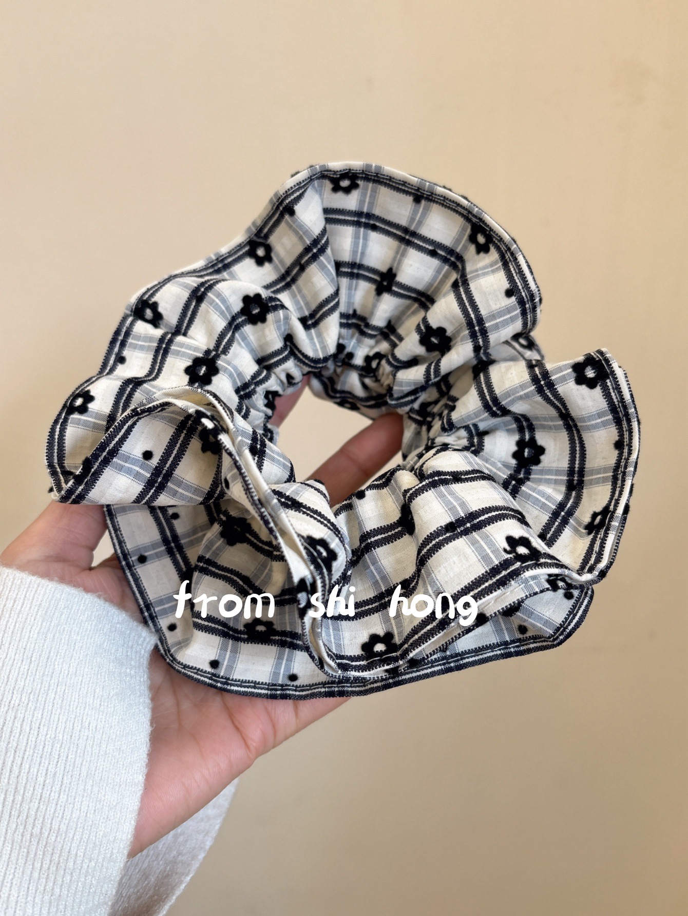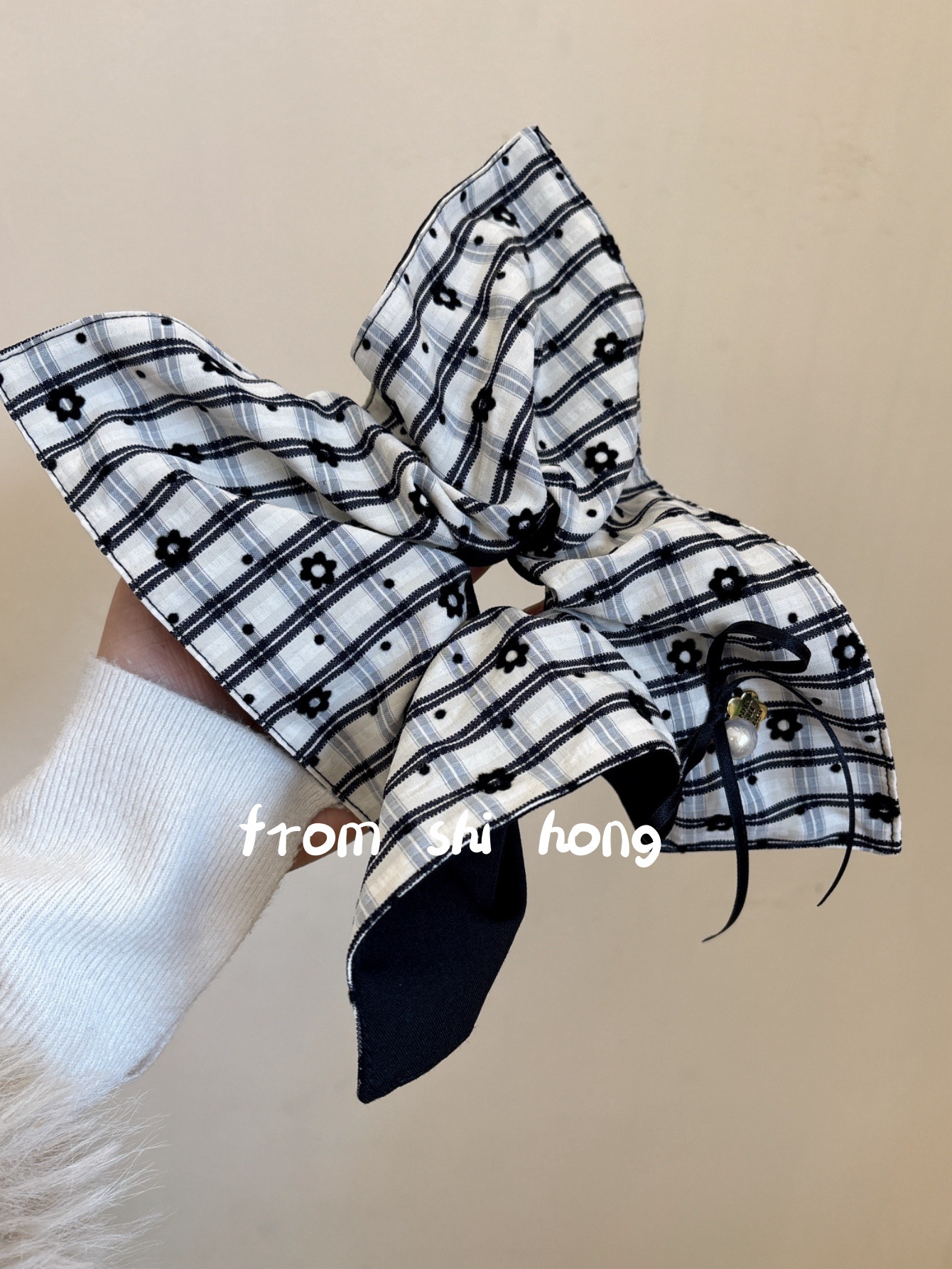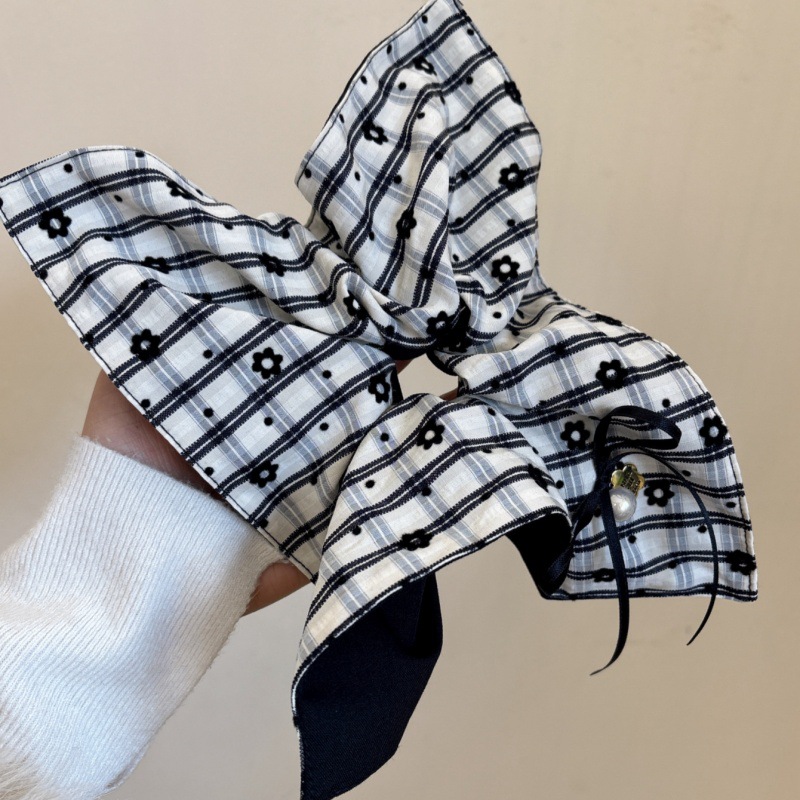 • 블랙 체크 무늬 - 플로킹 플라워 스퀘어 스카프 머리끈