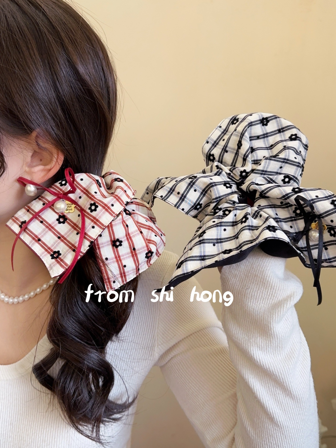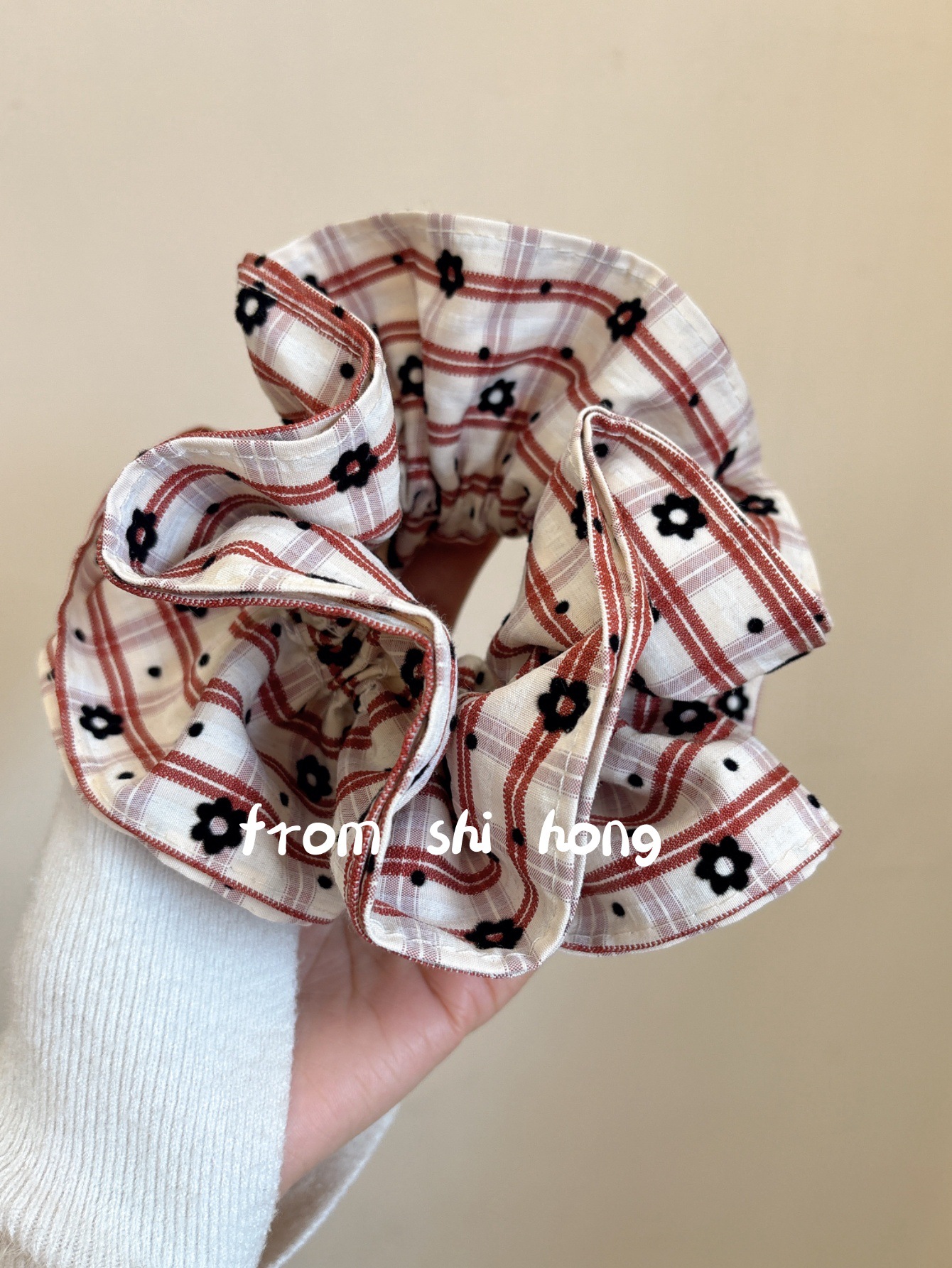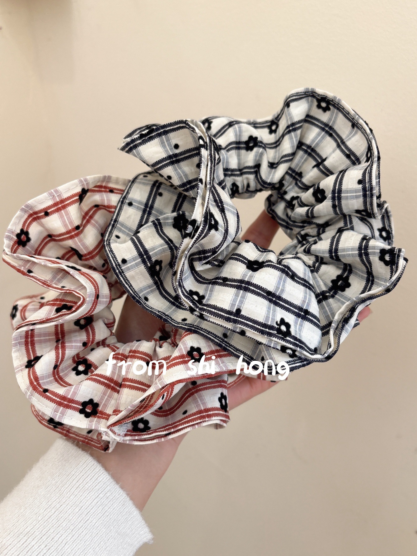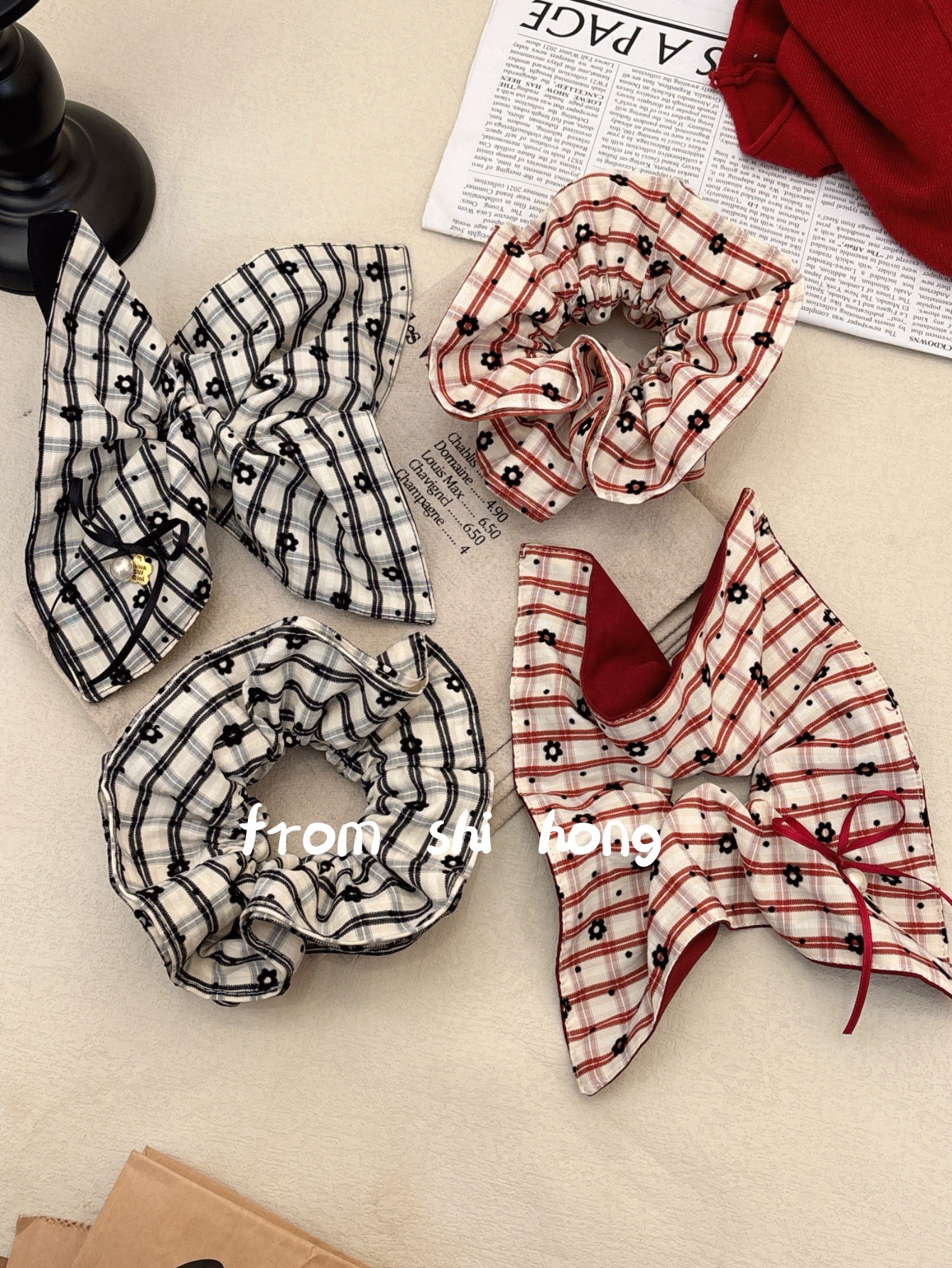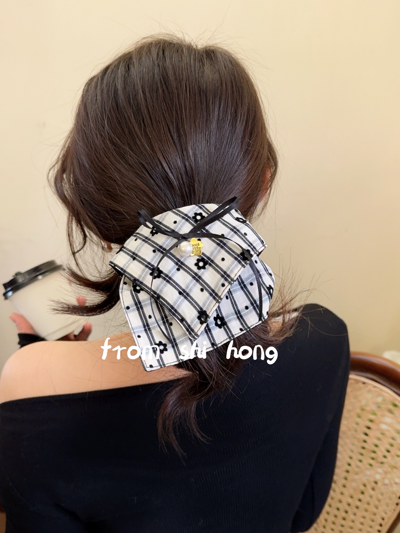 • 블랙 체크 무늬 - 플로킹 플라워 스퀘어 스카프 머리끈