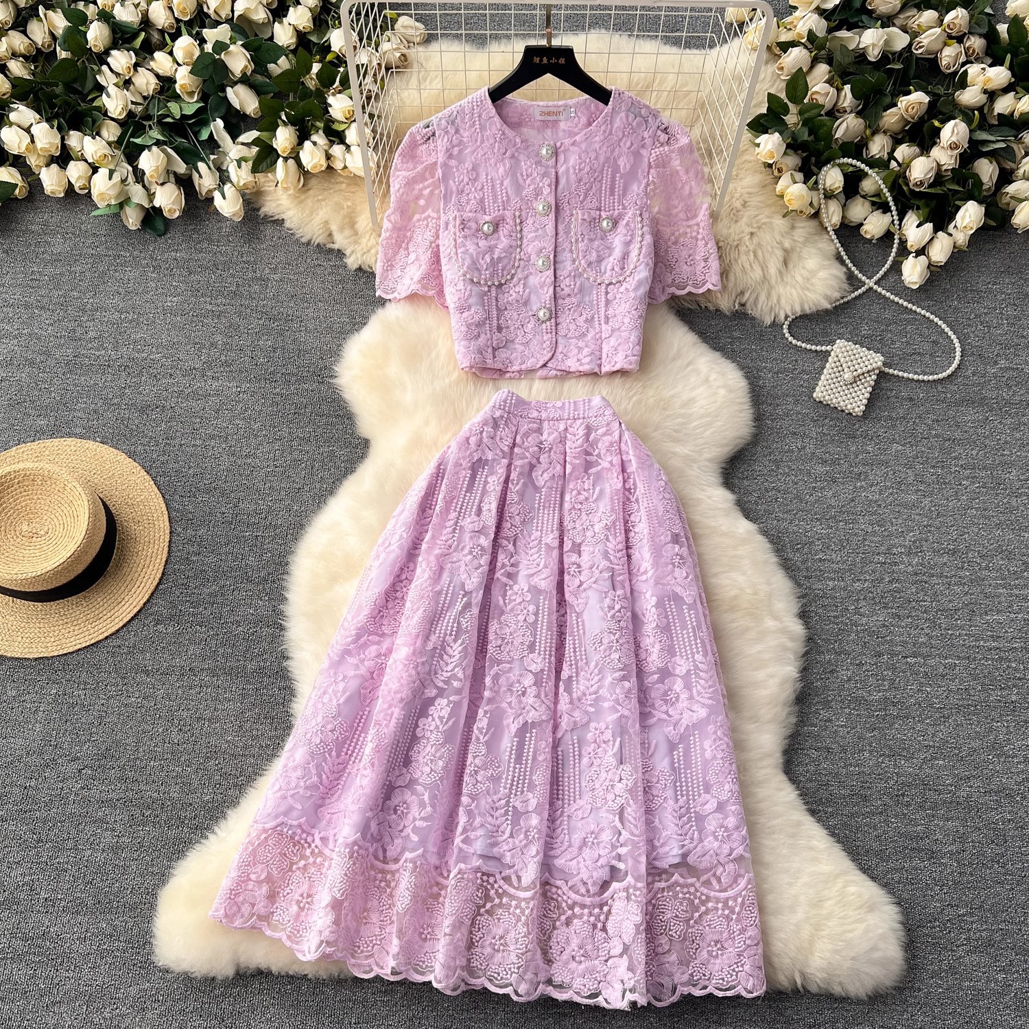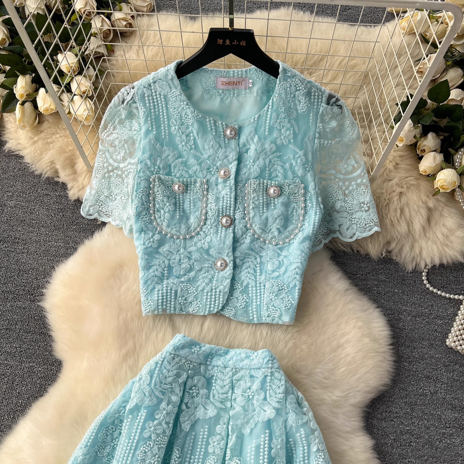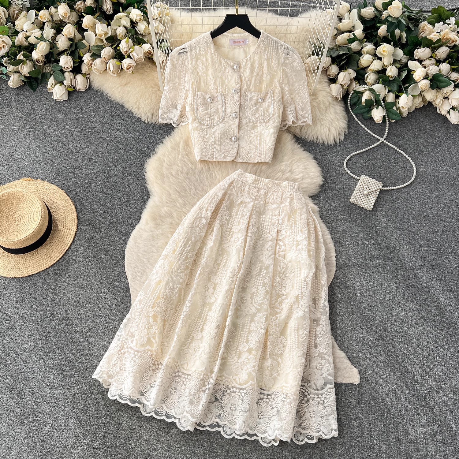 고급 사교계 스타일 세트 여성용 프랑스 레이스 크로 셰 퍼프 소매 셔츠 투피스 세트 높은 허리 슬리밍 스커트