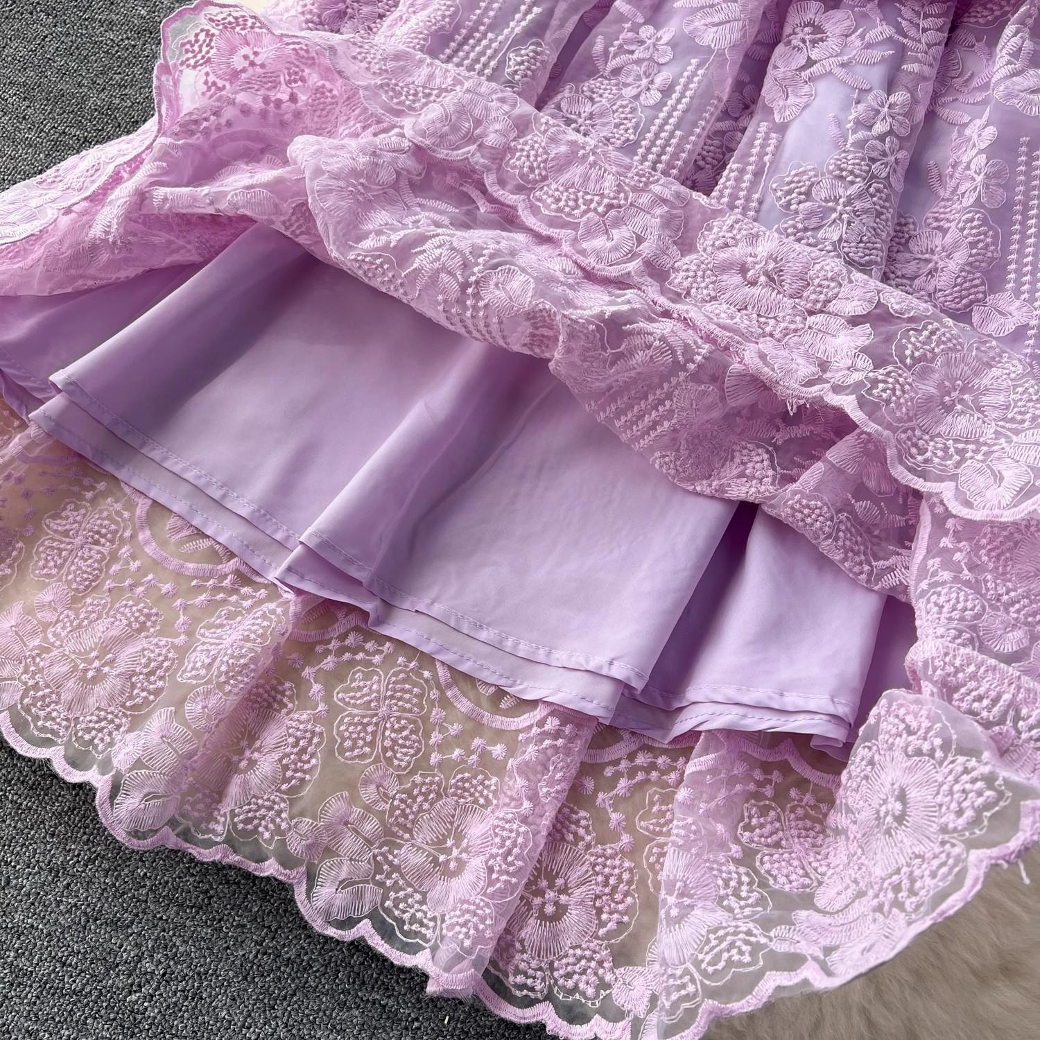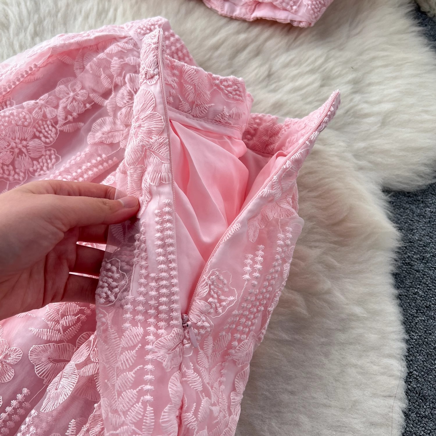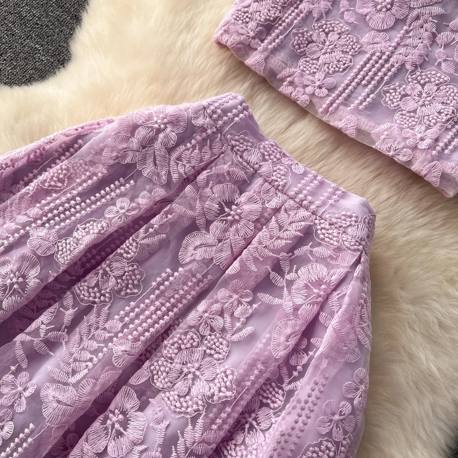 고급 사교계 스타일 세트 여성용 프랑스 레이스 크로 셰 퍼프 소매 셔츠 투피스 세트 높은 허리 슬리밍 스커트