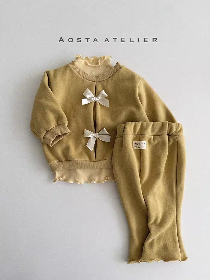 한국 아동복 25 봄과 가을 소녀 나무 귀 단색 기본 올 매치 탑 바지 투피스 활 세트