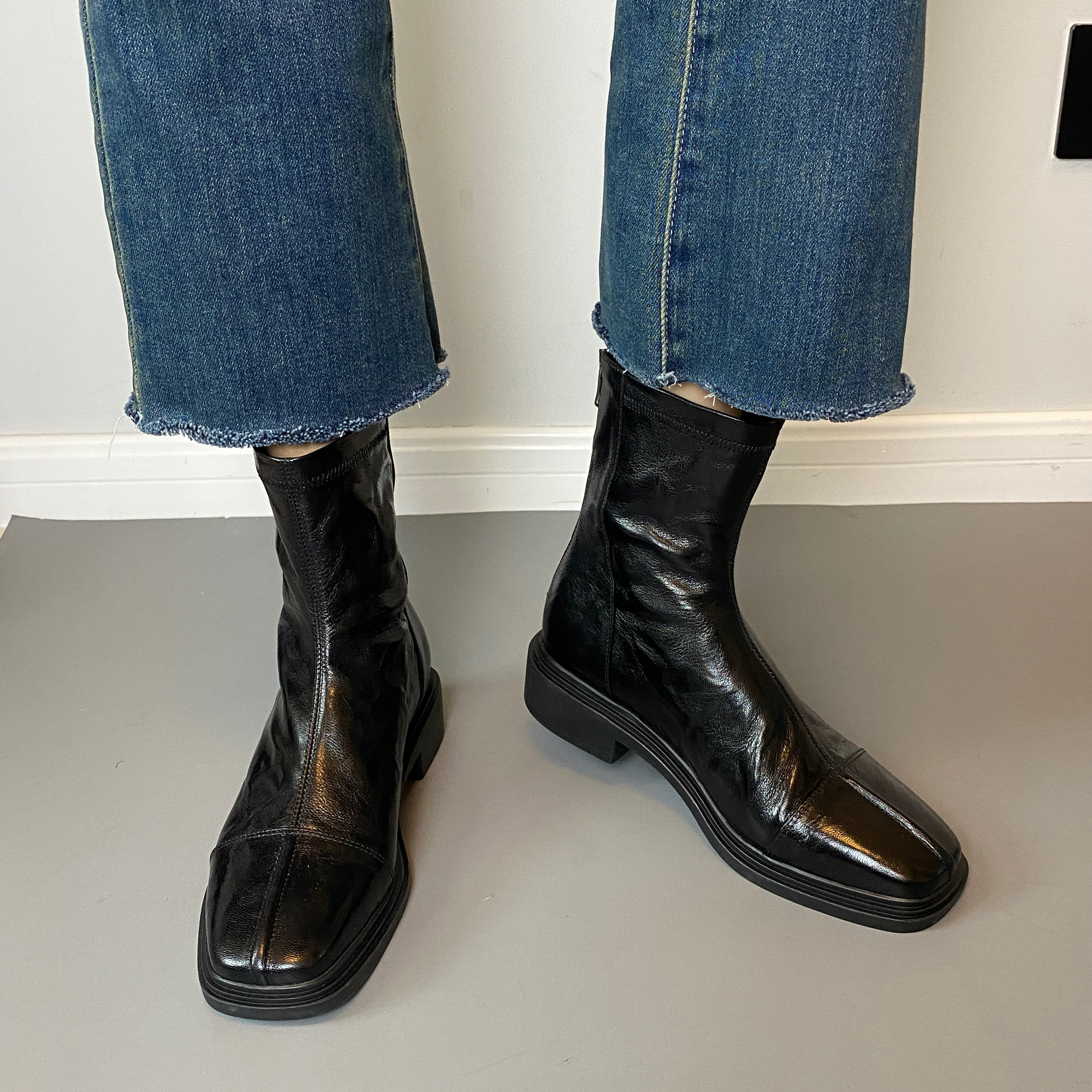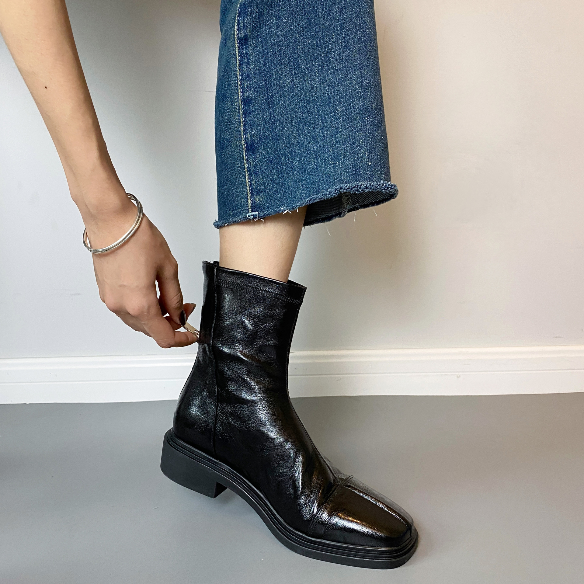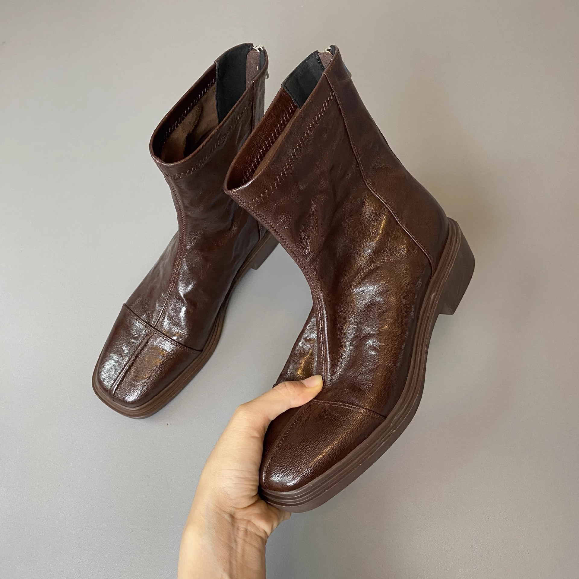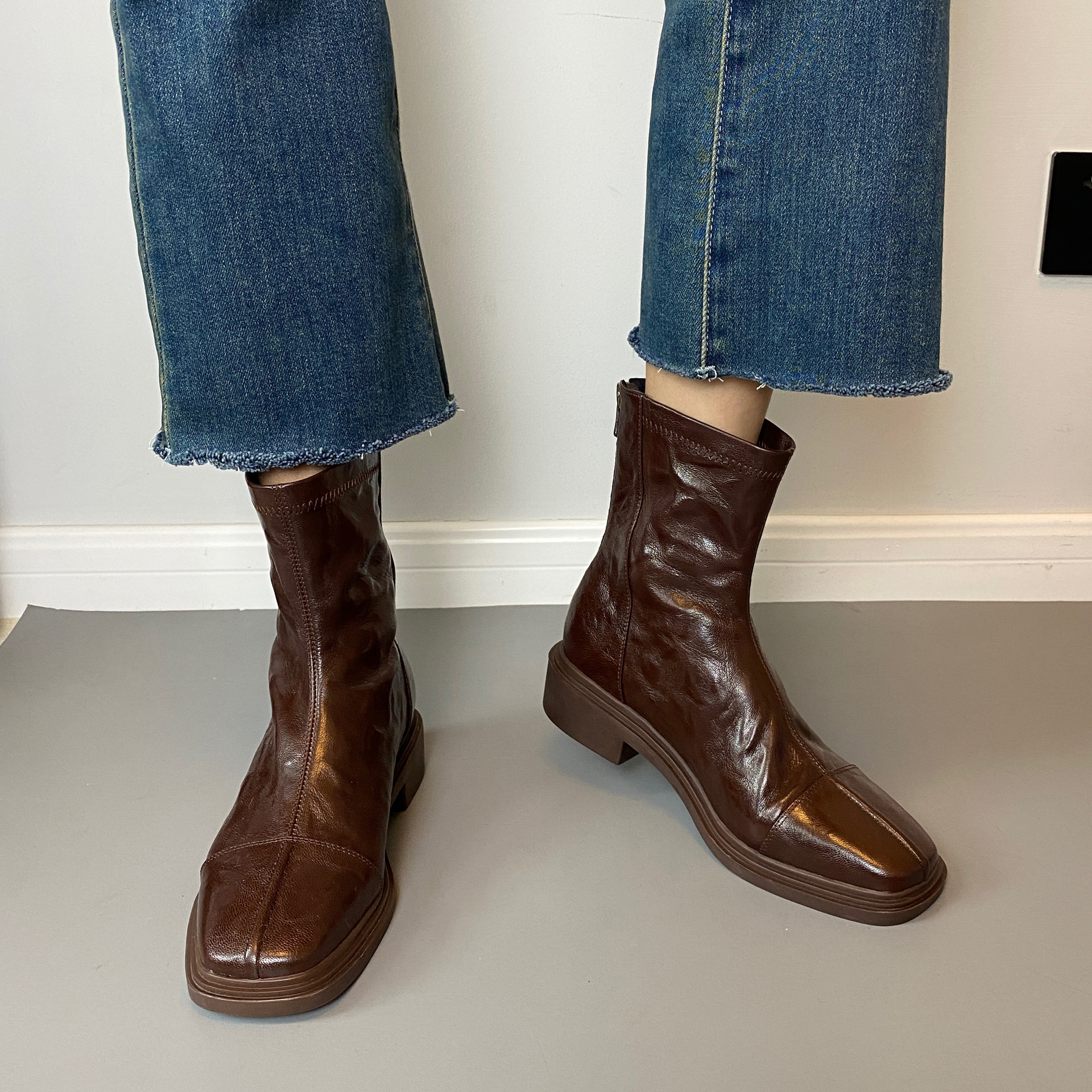Cowhide 버전 ~ 부드러운 바닥 로우 힐 짧은 부츠 여성 스퀘어 헤드 백 지퍼 부츠 가을과 겨울 2024 새로운 빈티지 마틴 부츠