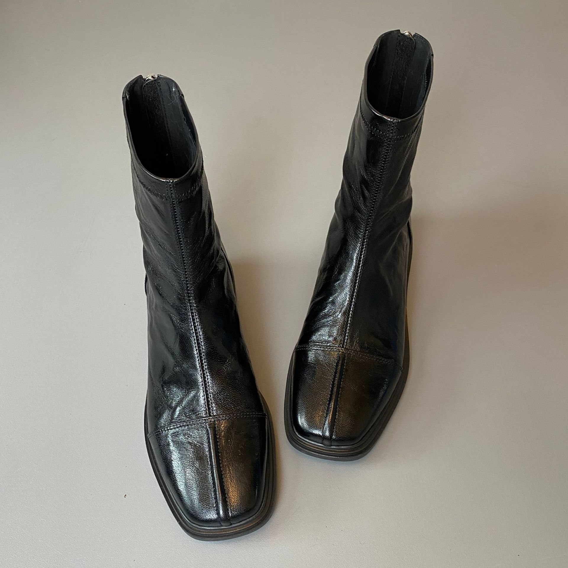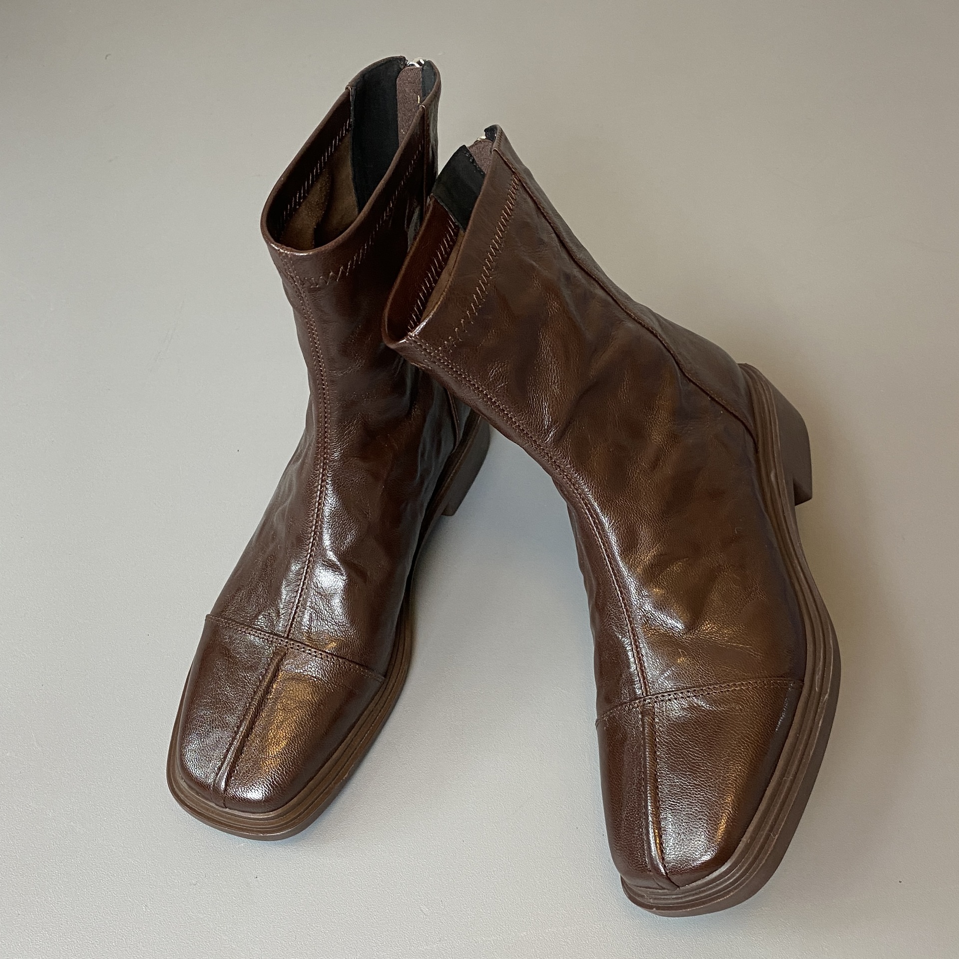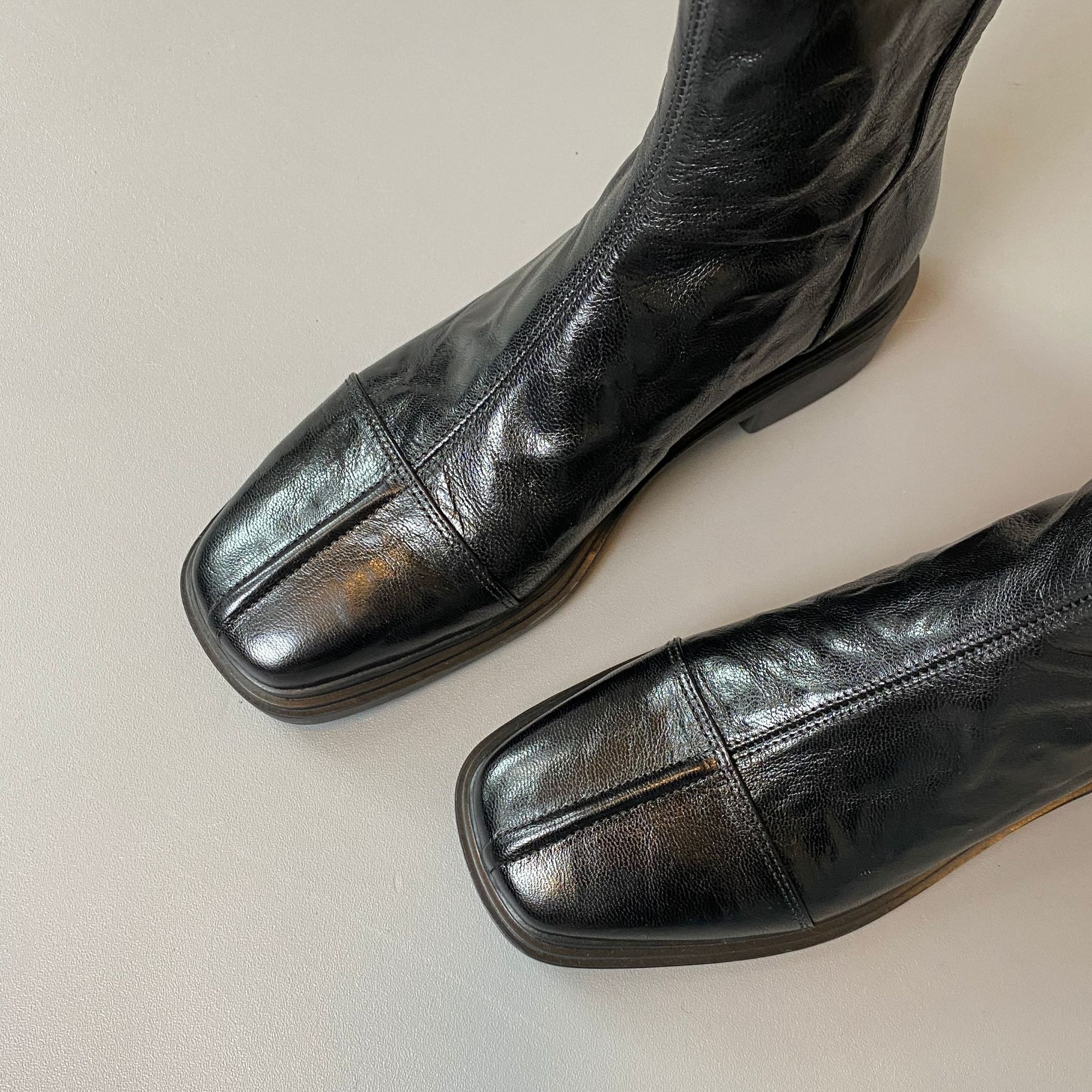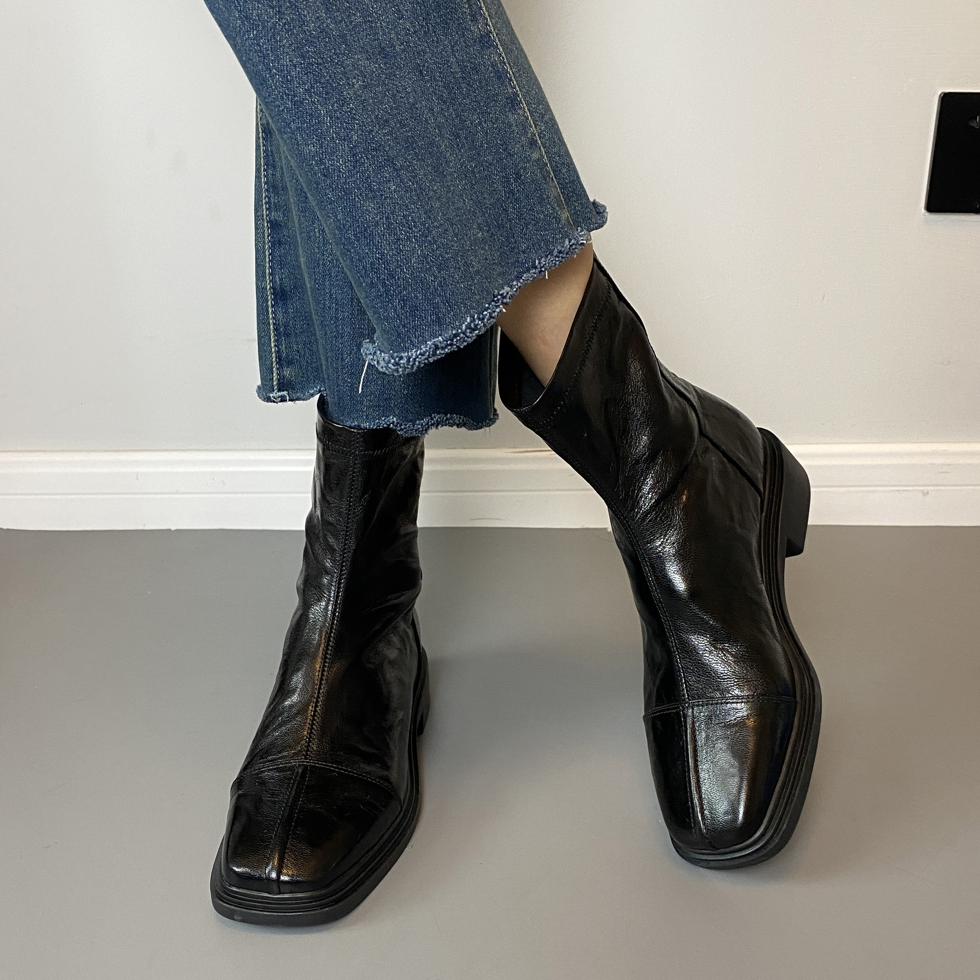 Cowhide 버전 ~ 부드러운 바닥 로우 힐 짧은 부츠 여성 스퀘어 헤드 백 지퍼 부츠 가을과 겨울 2024 새로운 빈티지 마틴 부츠