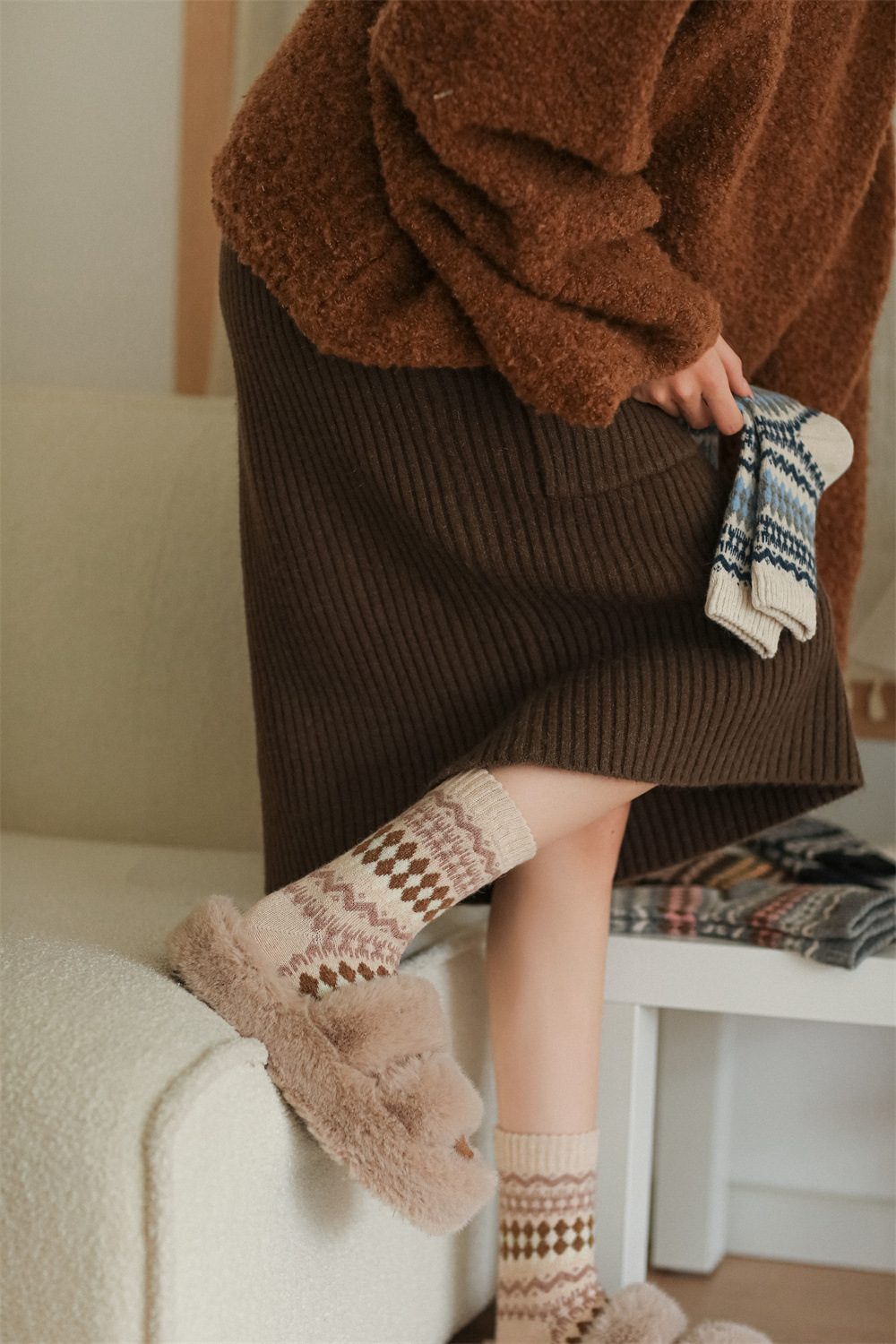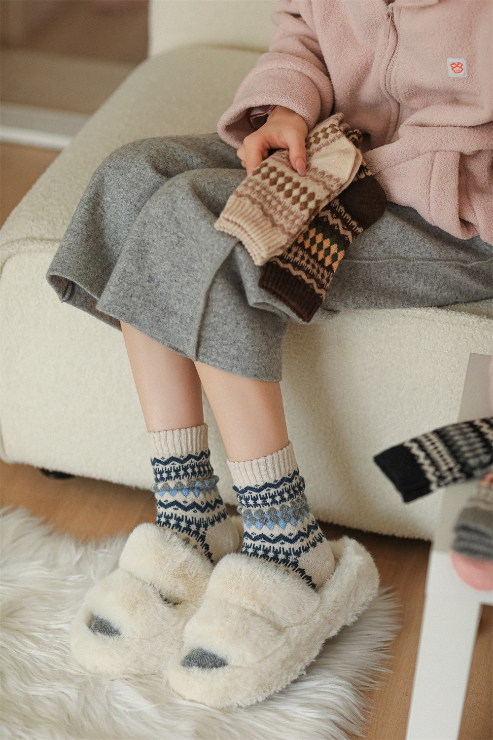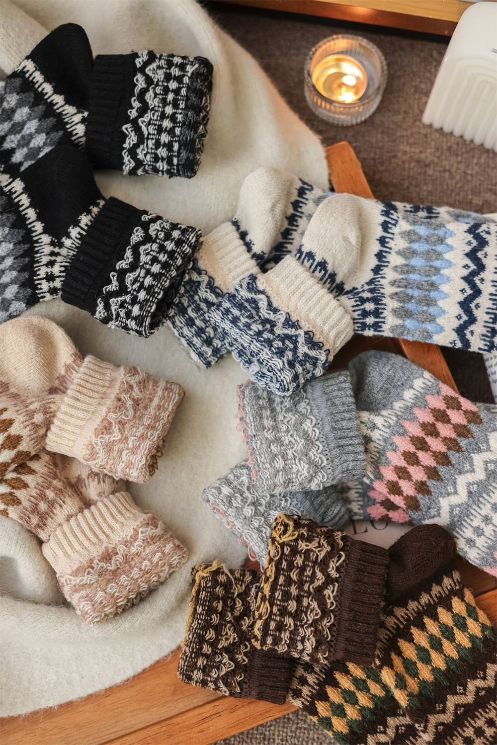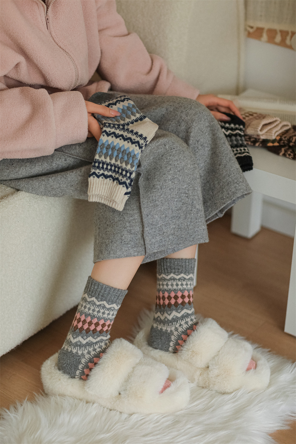 겨울철 여성을 위한 페어 아일 울 양말, 따뜻하고 두꺼운 양말, 마름모 복고풍 한국 블로거 스타일 대비 색상 종아리 양말스토어 가기