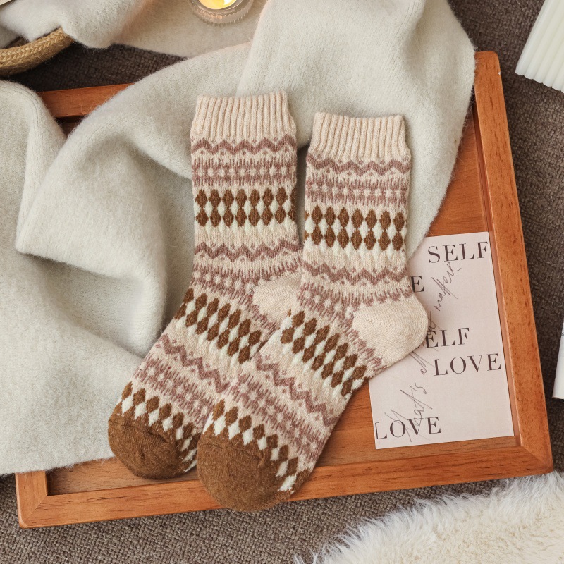 겨울철 여성을 위한 페어 아일 울 양말, 따뜻하고 두꺼운 양말, 마름모 복고풍 한국 블로거 스타일 대비 색상 종아리 양말