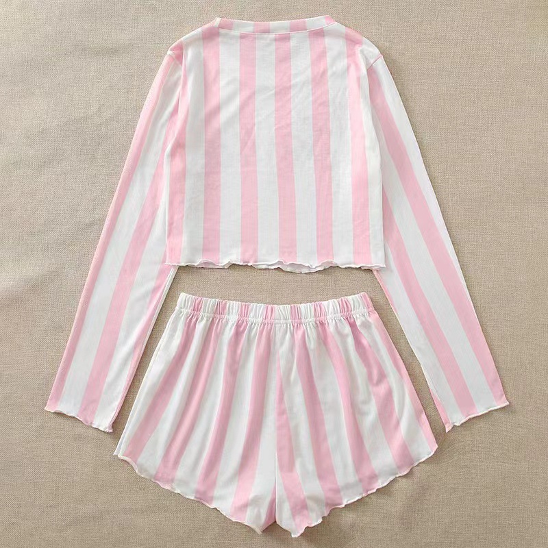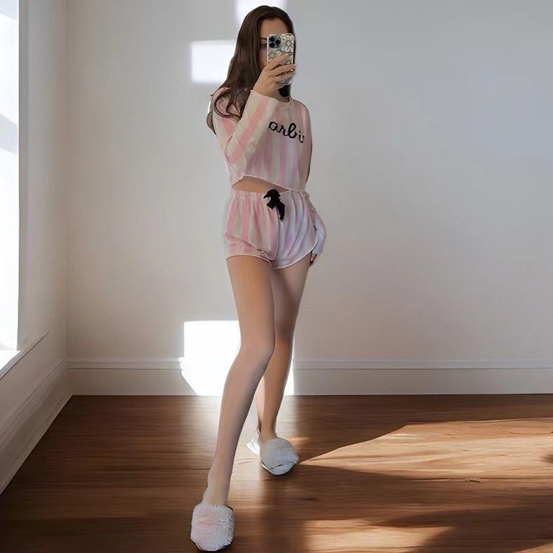 유럽과 미국의 폭발 국경 간 소녀 핑크 화이트 스트라이프 파자마 풀오버 캐주얼 긴 소매 반바지 홈 웨어