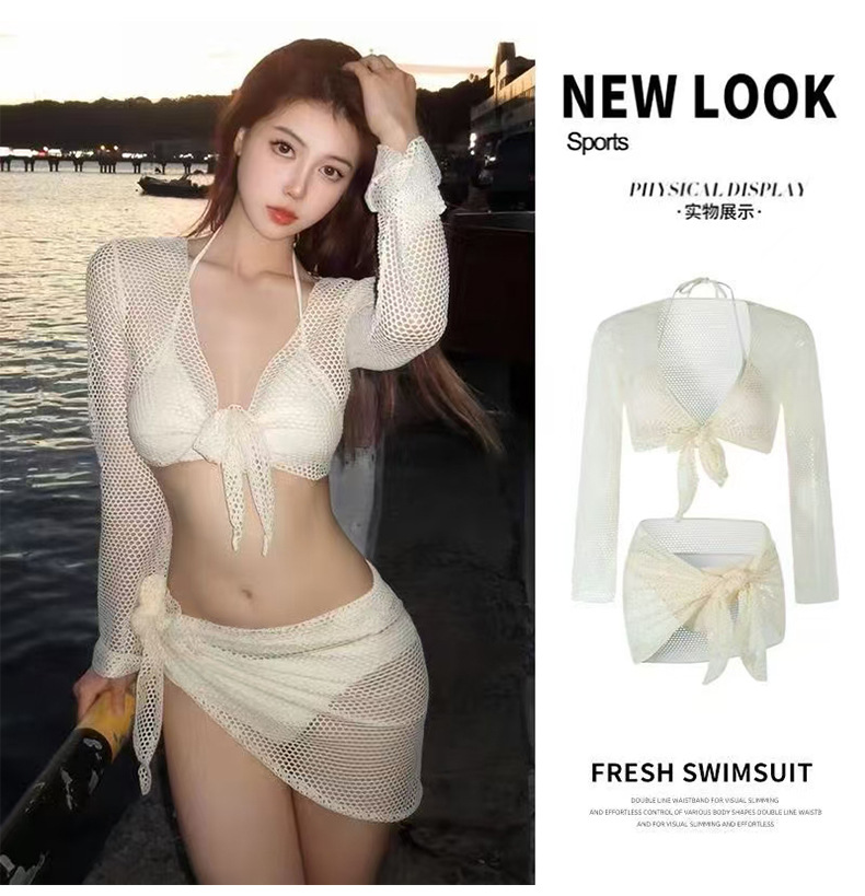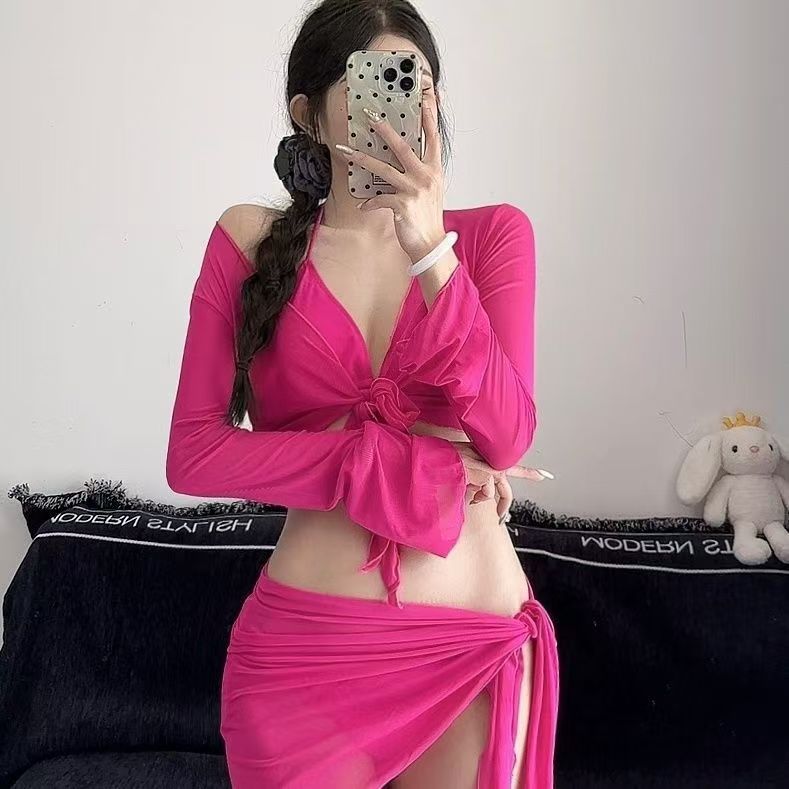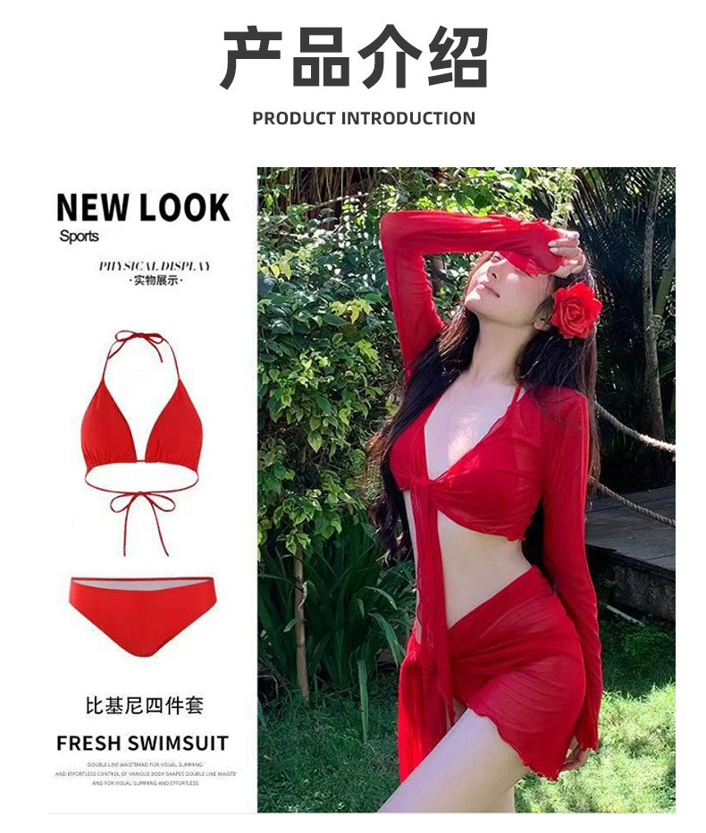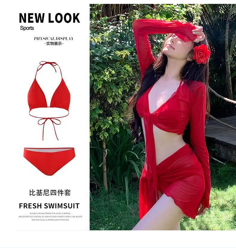 인터넷 레드 핫 2025 새로운 비키니 수영복 여성 스플릿 4 피스 세트 긴 소매 선스크린 레드 휴가 온천스토어 가기