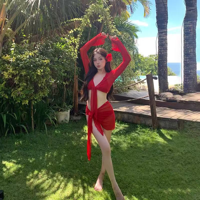 인터넷 레드 핫 2025 새로운 비키니 수영복 여성 스플릿 4 피스 세트 긴 소매 선스크린 레드 휴가 온천