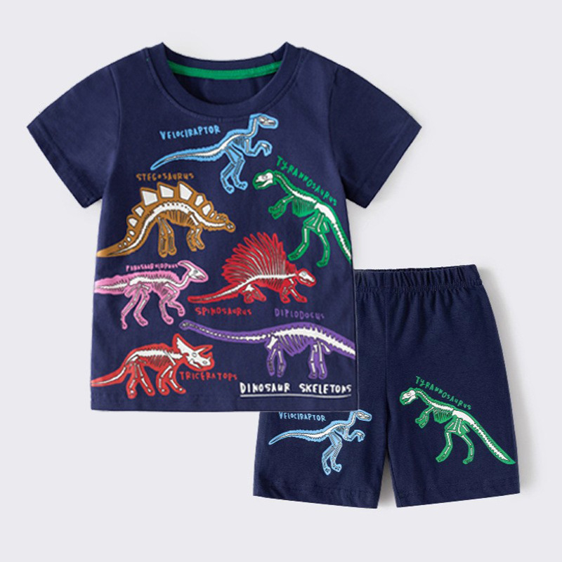 2025년 여름 신상 아동 만화 공룡 반팔 티셔츠 세트 남아 패션 트렌드