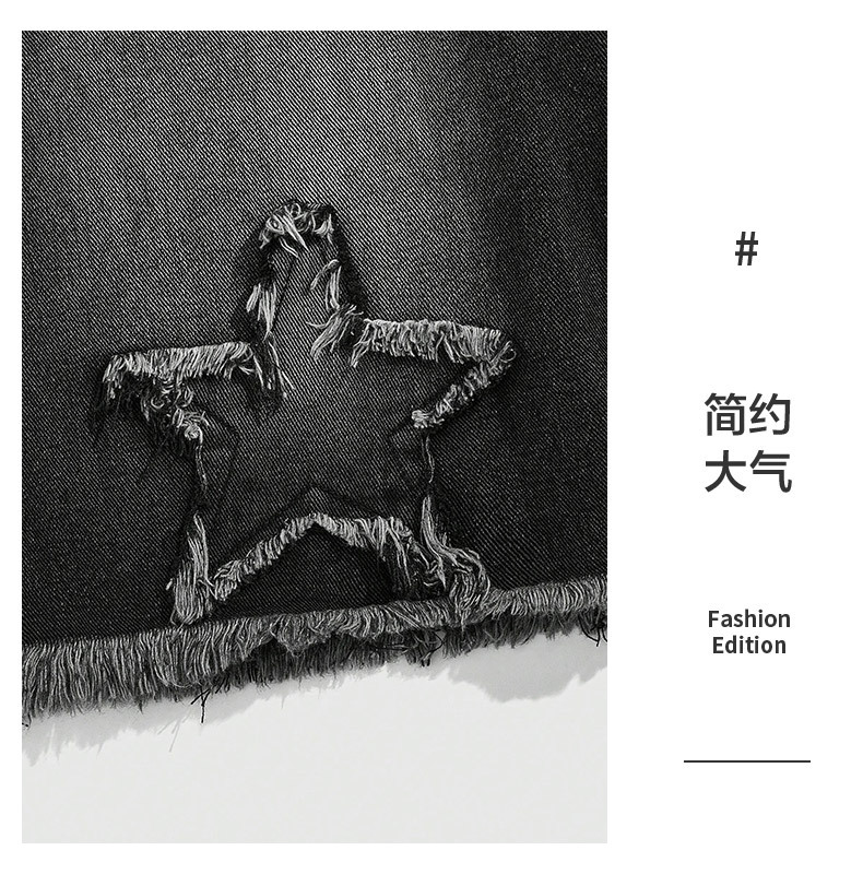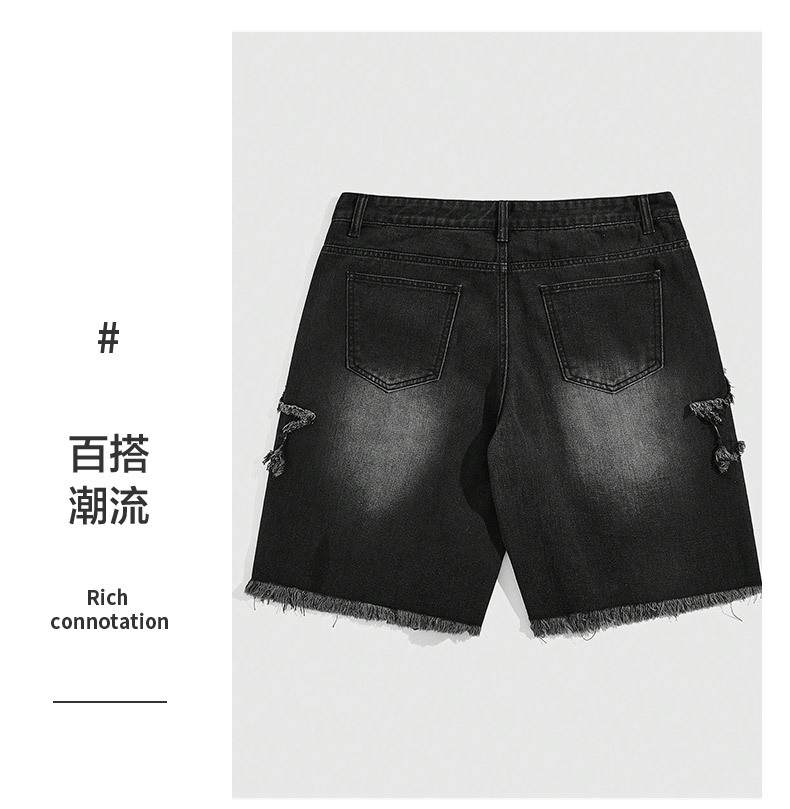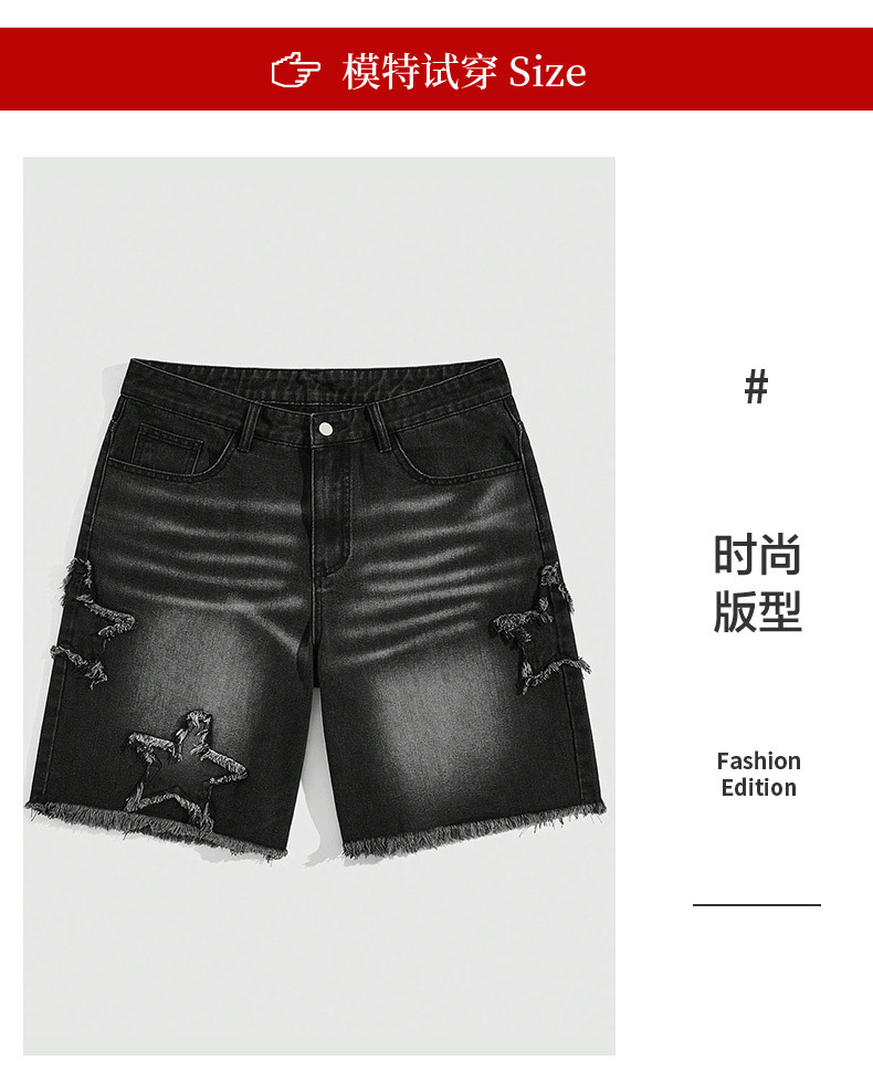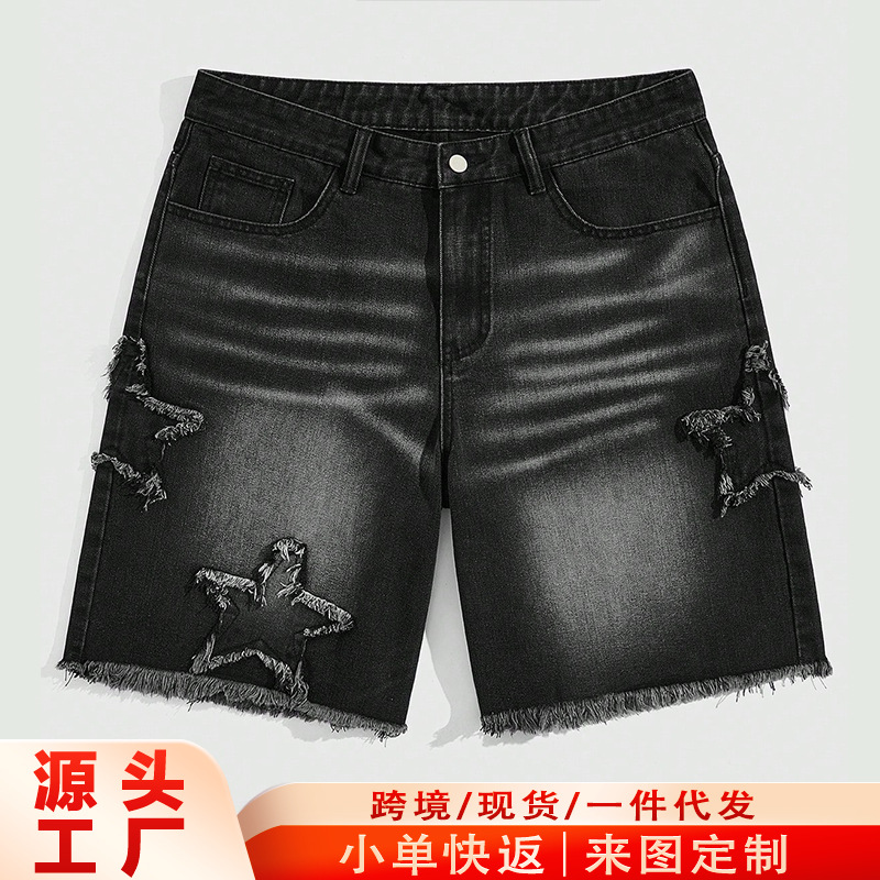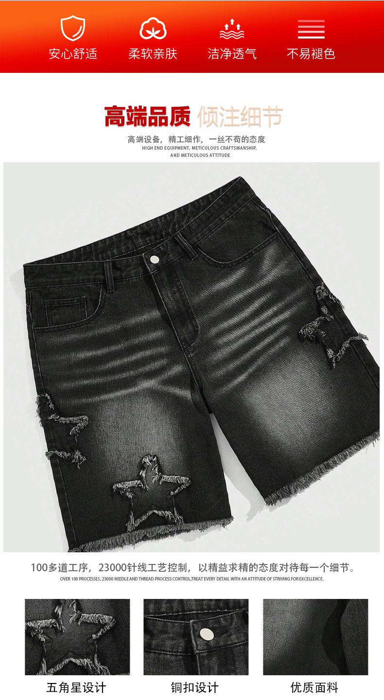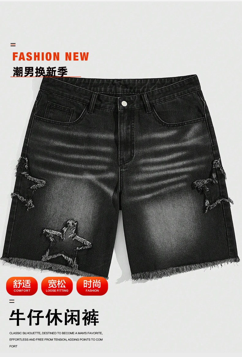 남자 데님 반바지 고양이 수염 모든 경기 새로운 도착 데님 바지 빈티지 5 점 스타 패치 스티칭 캐주얼 바지스토어 가기
