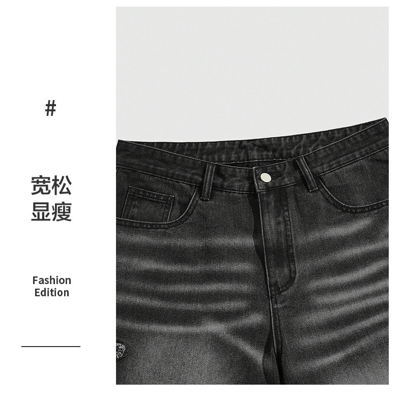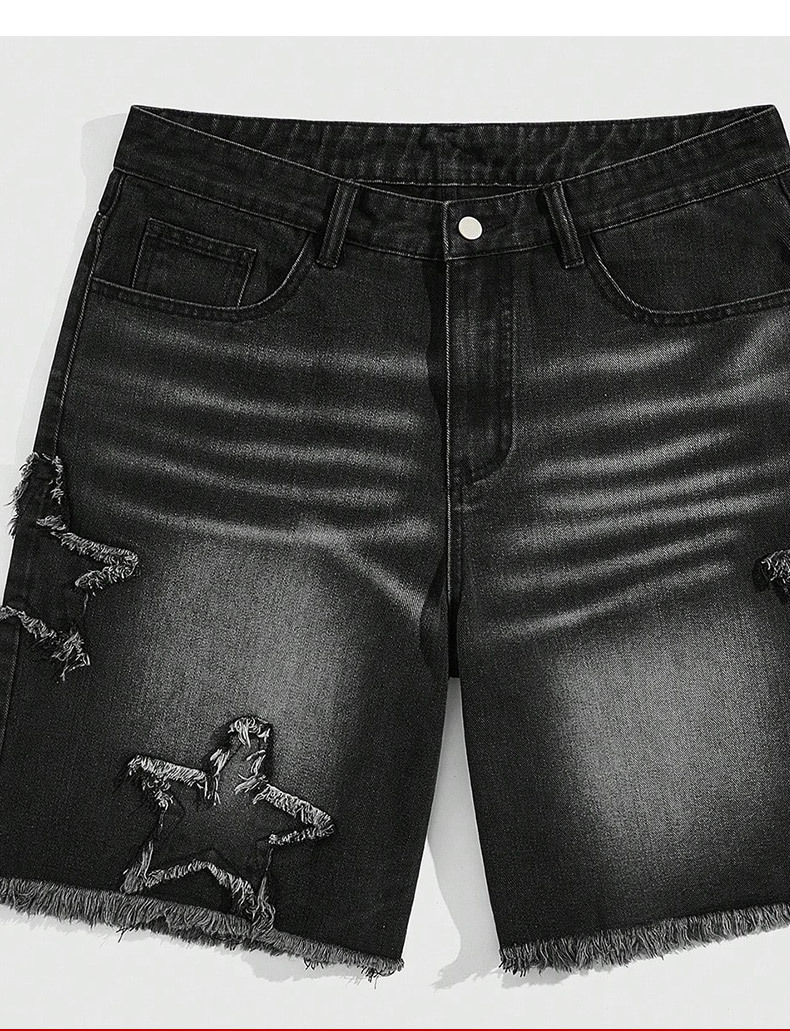 남자 데님 반바지 고양이 수염 모든 경기 새로운 도착 데님 바지 빈티지 5 점 스타 패치 스티칭 캐주얼 바지
