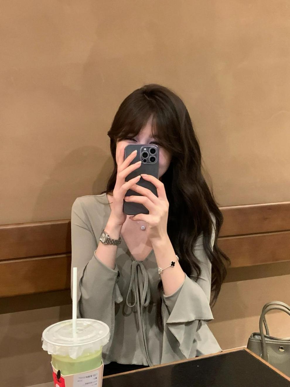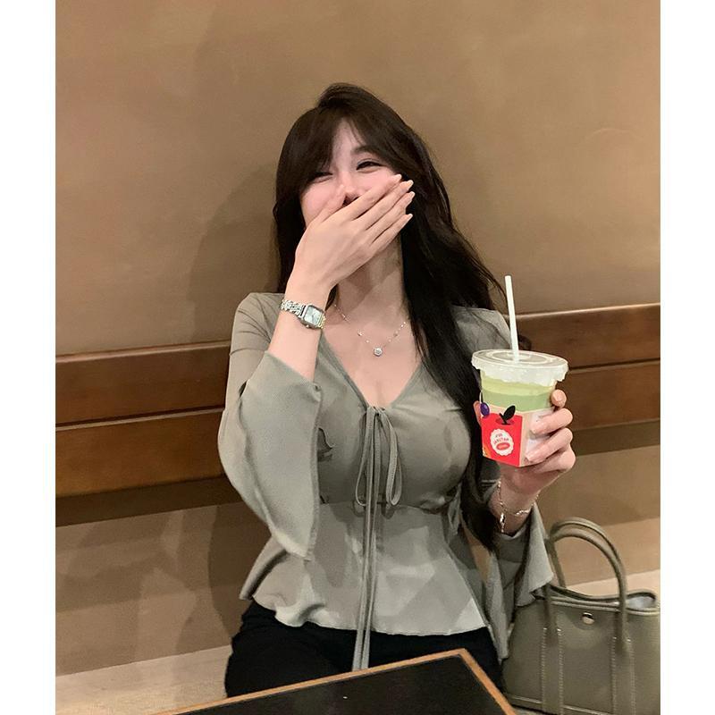 플러스 사이즈 300 진 봄과 가을 순수한 욕망 바람으로 뒤덮인 뿔 소매 셔츠 통통녀 슬림 핏 스트랩 긴 소매 탑 여성 220스토어 가기