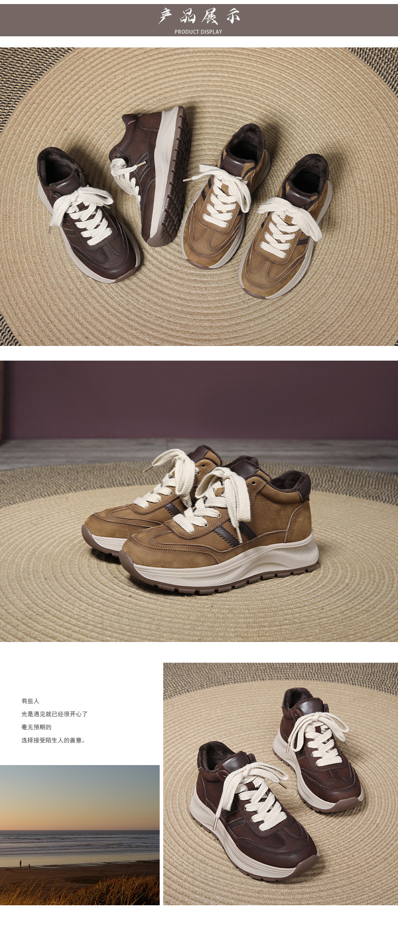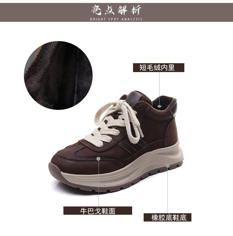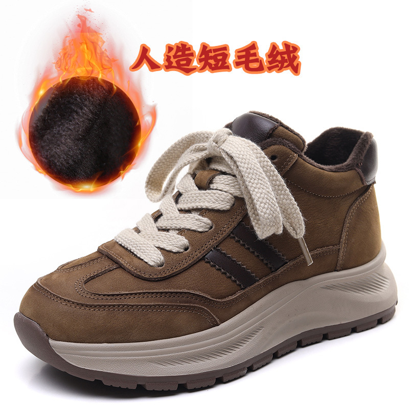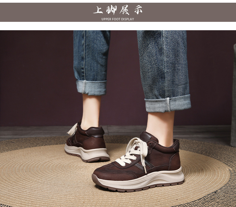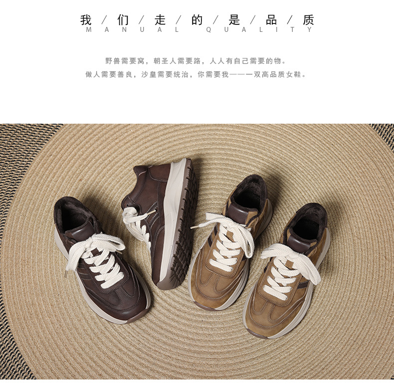 레트로 캐주얼 신발 여성 2024 년 겨울 새로운 도착 헤드 레이어 Cowhide Frosted 가죽 웨지 라운드 토 스포츠 기모 여성 신발스토어 가기