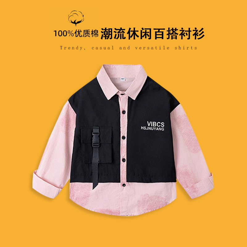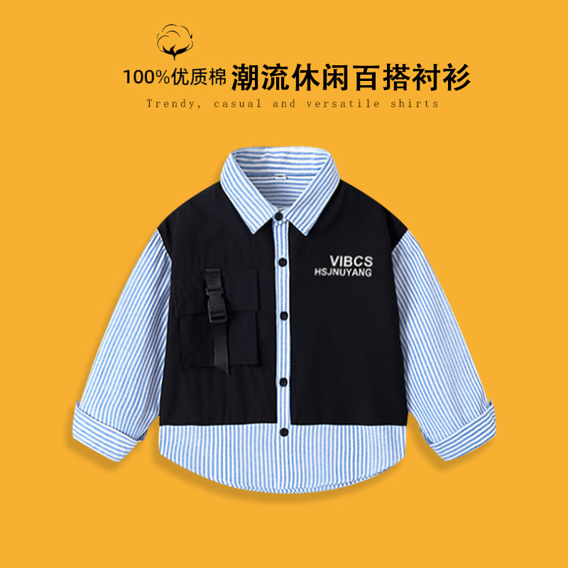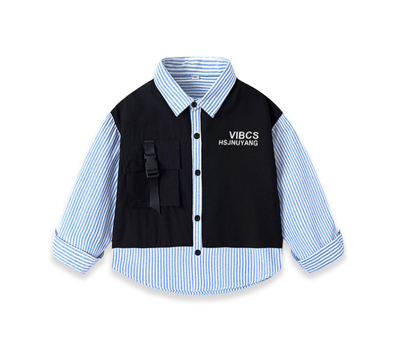 새로운 봄과 가을 긴 소매 셔츠 소년의 줄무늬 패치 워크 셔츠 세련된 인쇄 옷깃 탑 블루 올 매치 유행 한국어스토어 가기