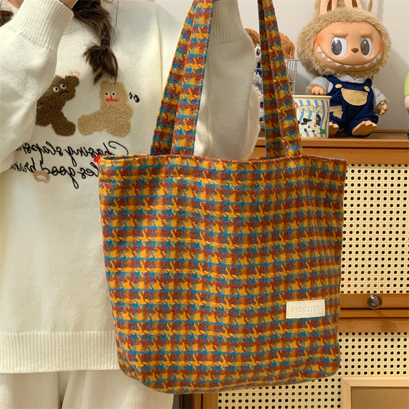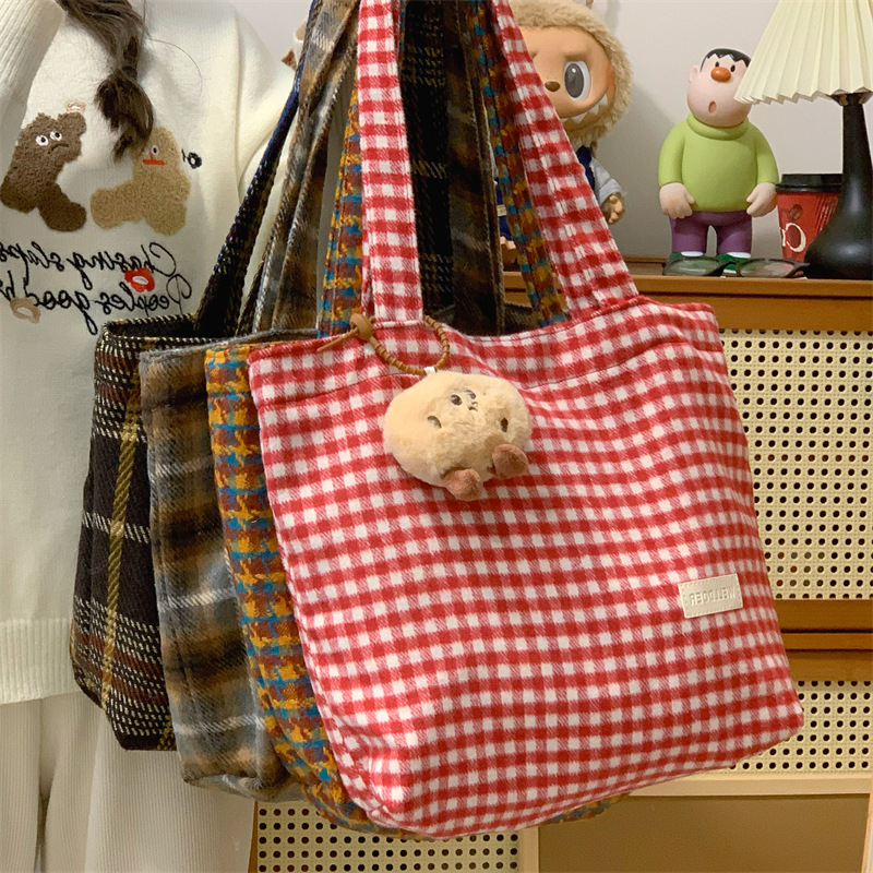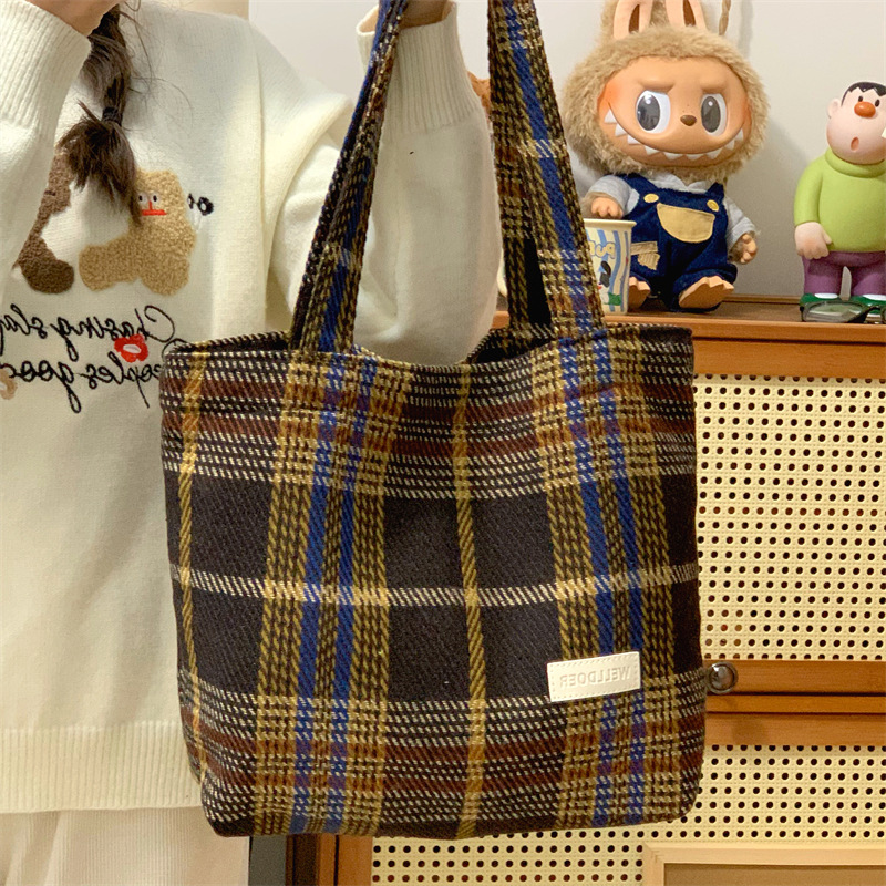 게으른 스타일 이른 가을 새 스타일 체크 무늬 모직 어깨 가방 캐주얼 쇼핑백 레트로 트렌디 한 올 매치 통근 속옷 가방스토어 가기