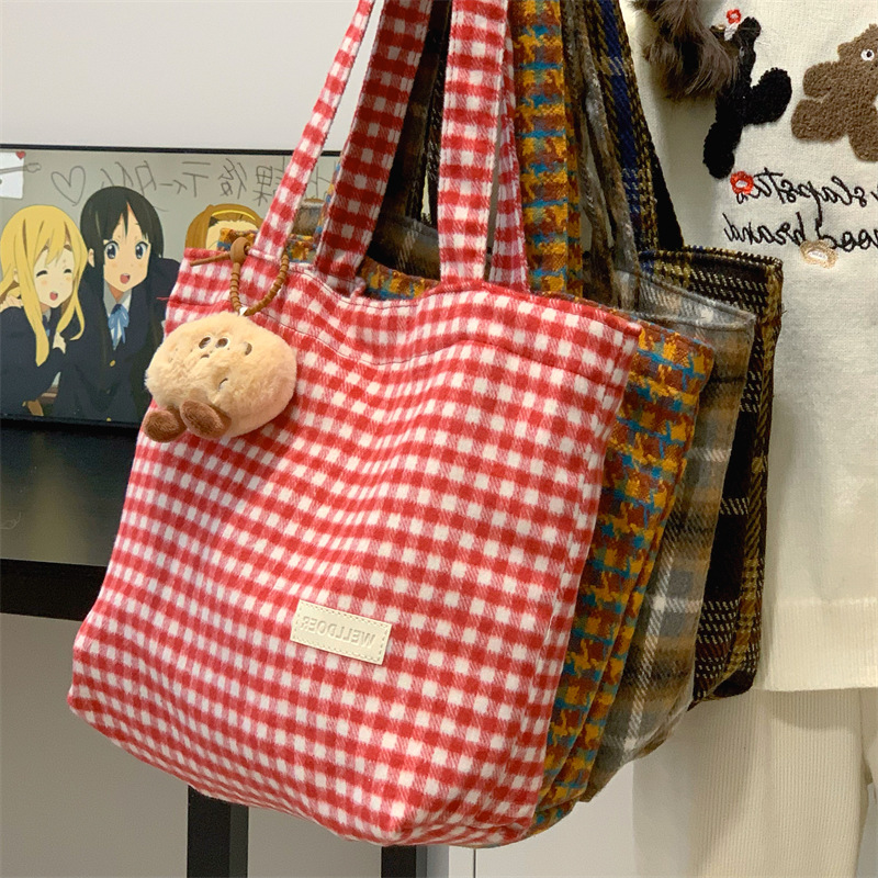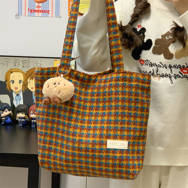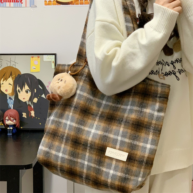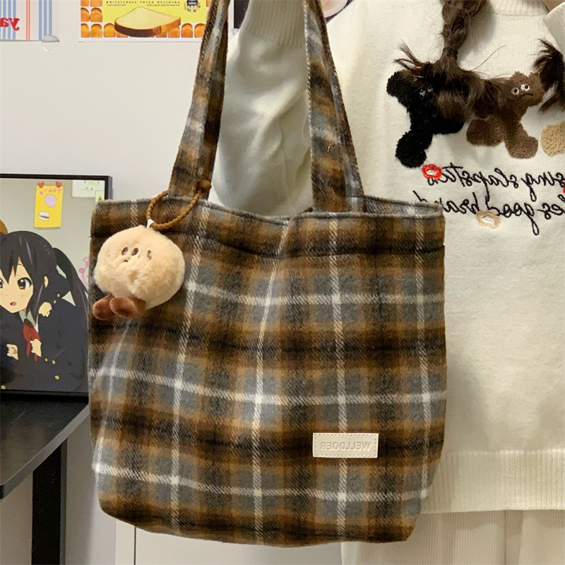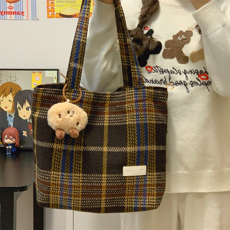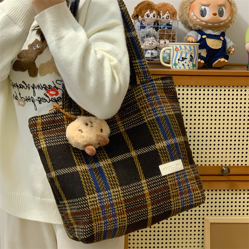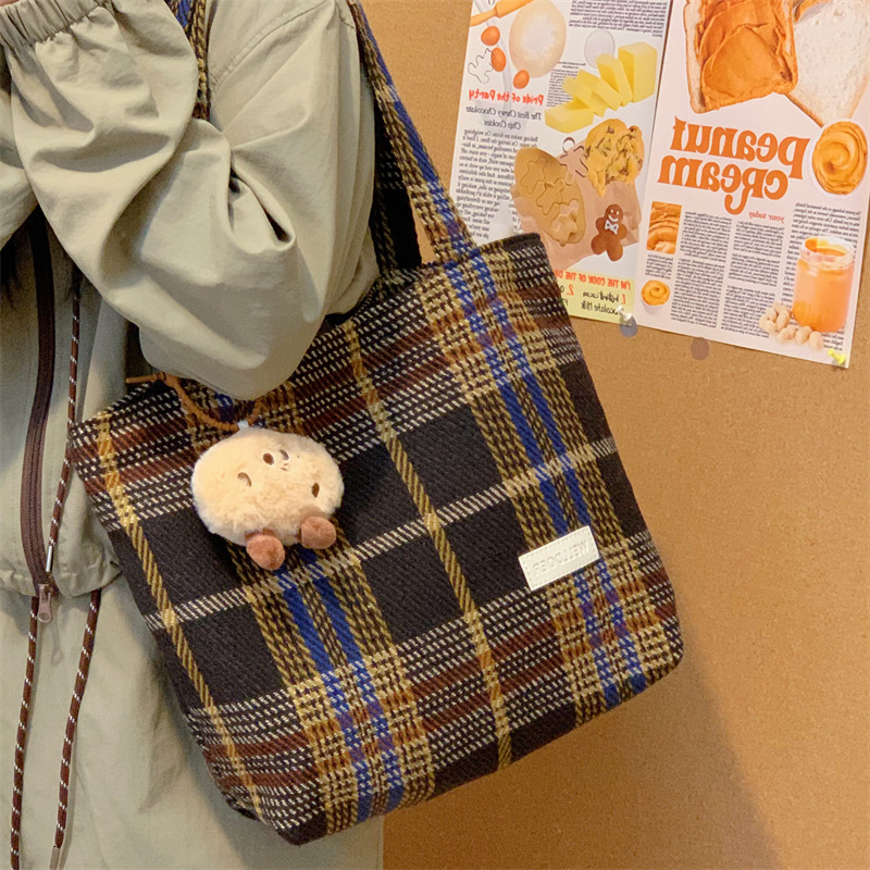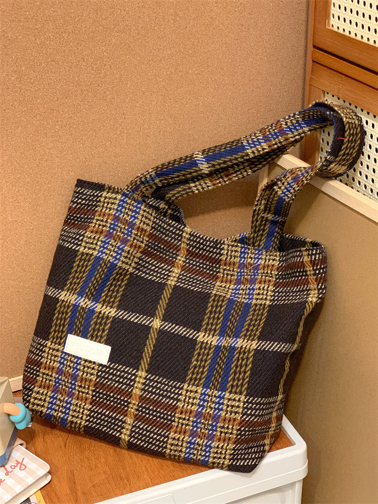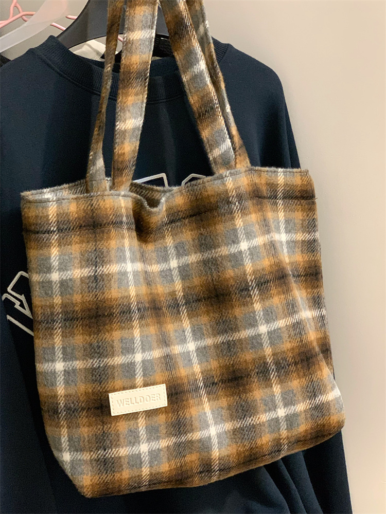 게으른 스타일 이른 가을 새 스타일 체크 무늬 모직 어깨 가방 캐주얼 쇼핑백 레트로 트렌디 한 올 매치 통근 속옷 가방