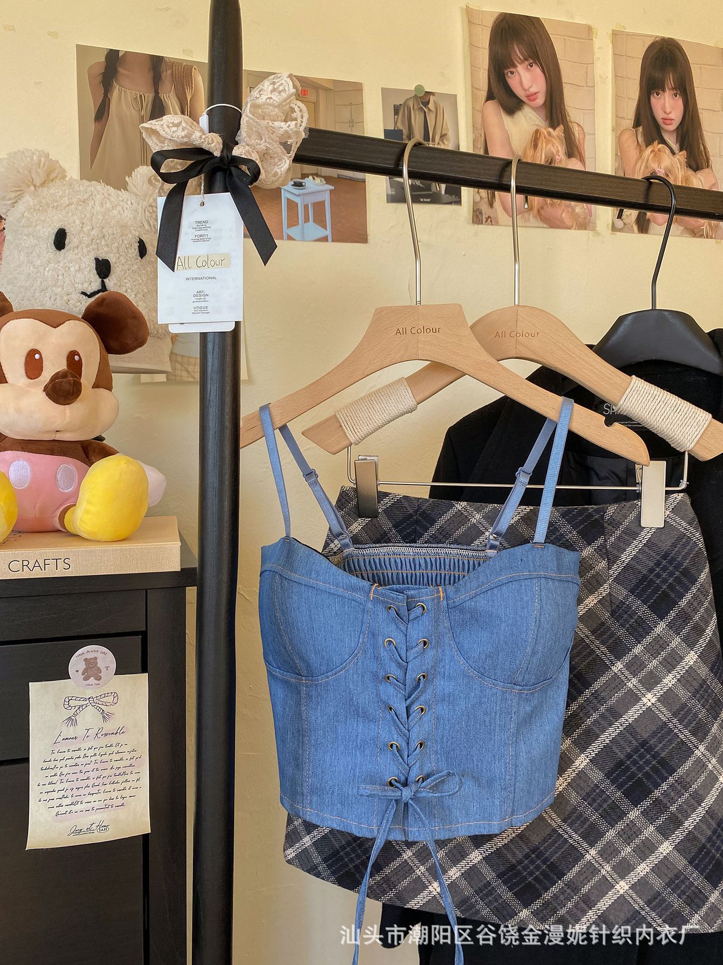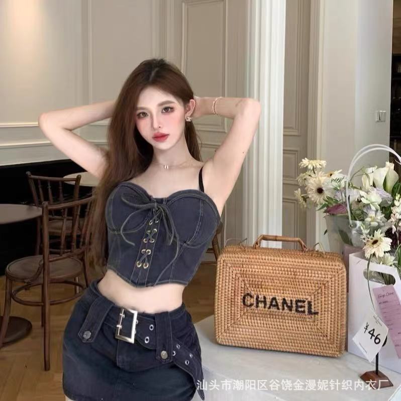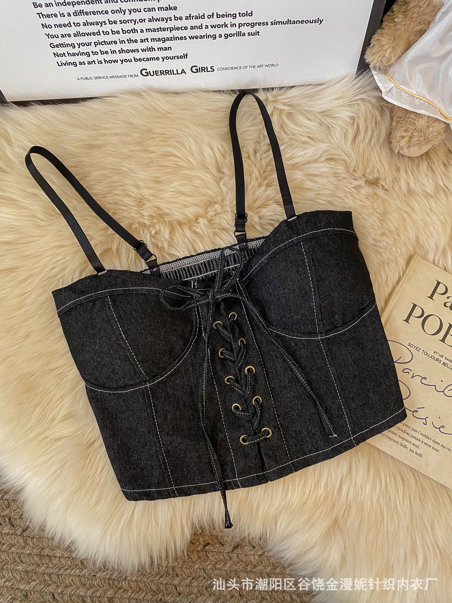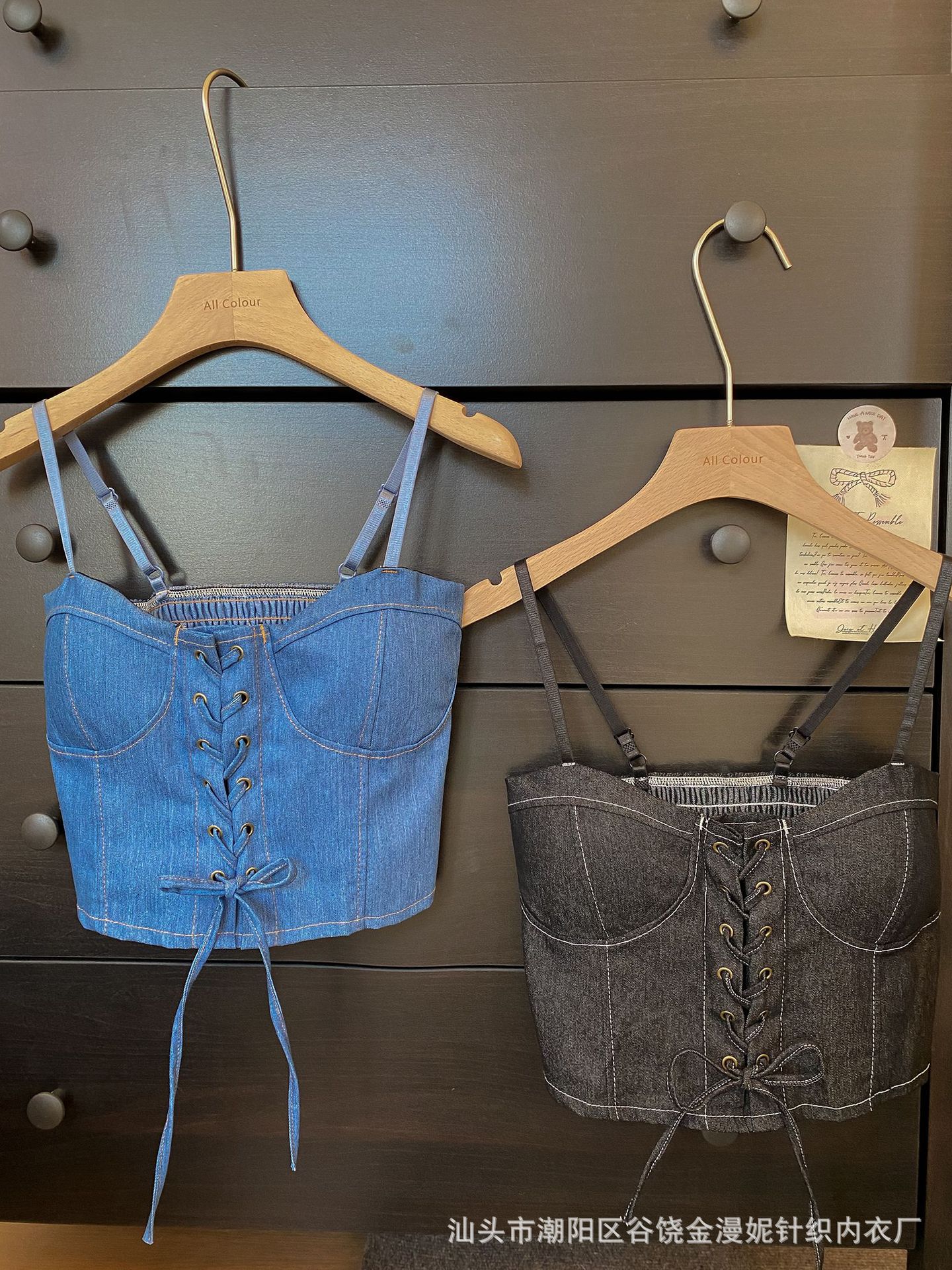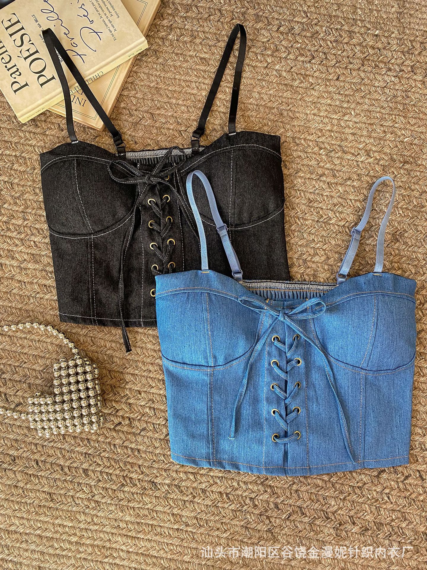 데님 작은 Camisole 여성용 내부 스트랩 슬림핏 핫 걸 섹스 벨트 가슴 패드 디자인 짧은 튜브 탑