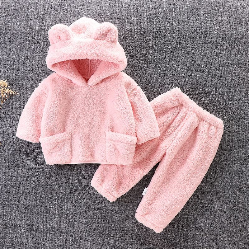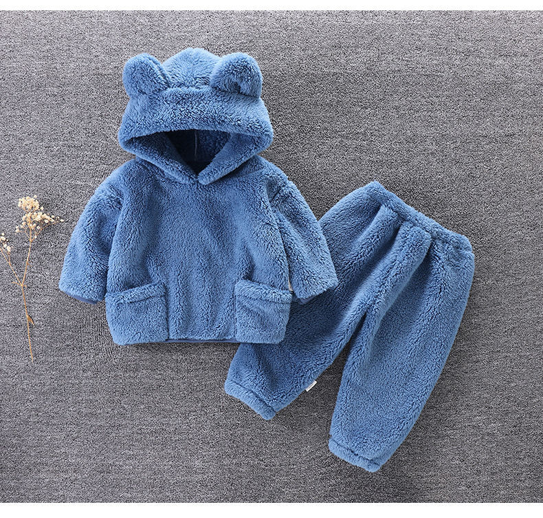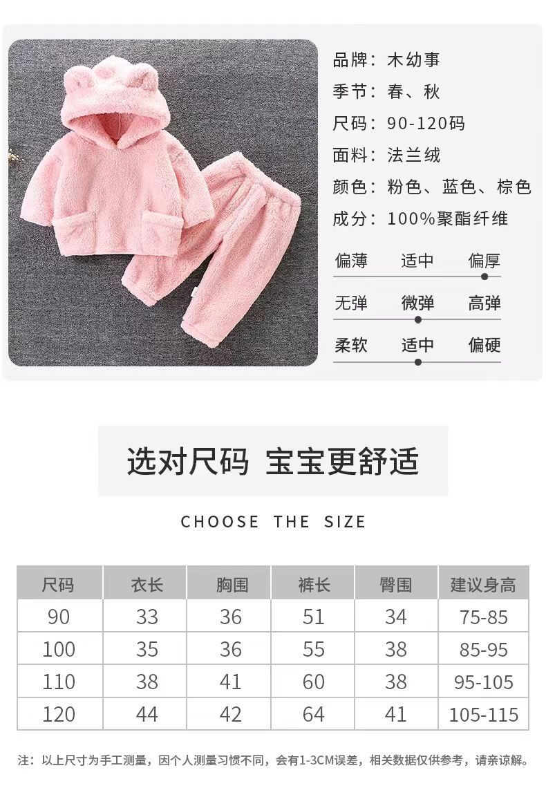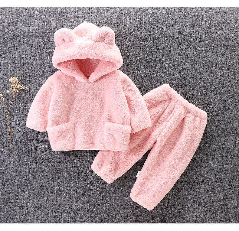 어린이의 가을과 겨울 플란넬 세트 아기의 귀여운 잠옷 홈 옷 따뜻한 두꺼운 후드 외부 착용 투피스 세트스토어 가기