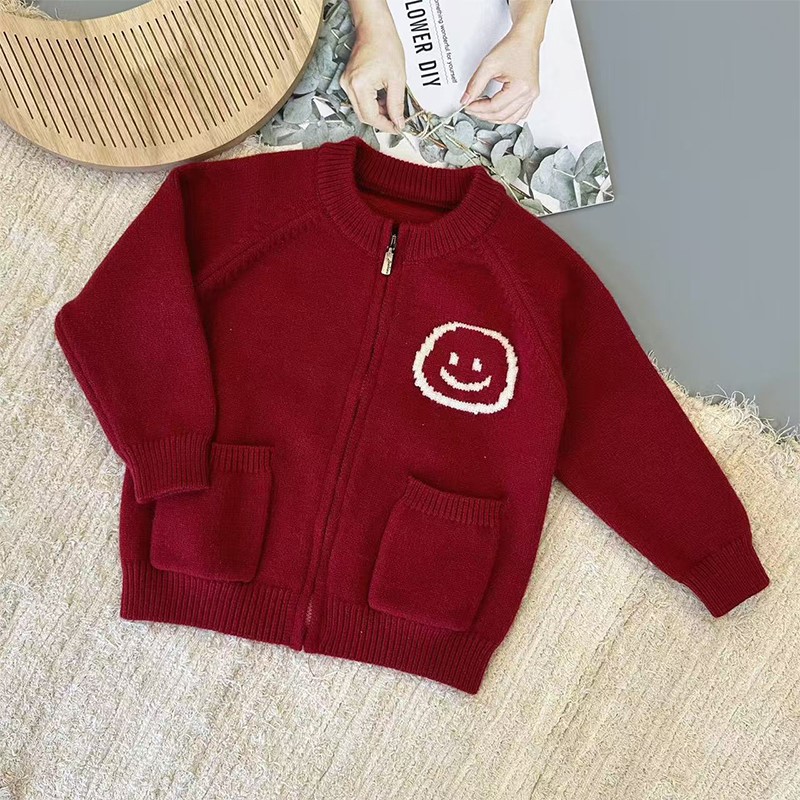 2024 소년 소녀를위한 편지가 달린 겨울 어린이 두꺼운 스마일리 니트웨어 새해 레드 홀리데이 스웨터 코트 트렌디 카디건