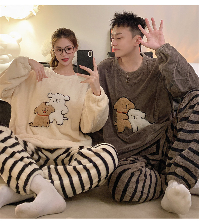 커플 잠옷 여성용 가을 겨울 산호 벨벳 두꺼운 만화 캐릭터 외출 가능 캐주얼 따뜻한 홈웨어 세트 겨울용