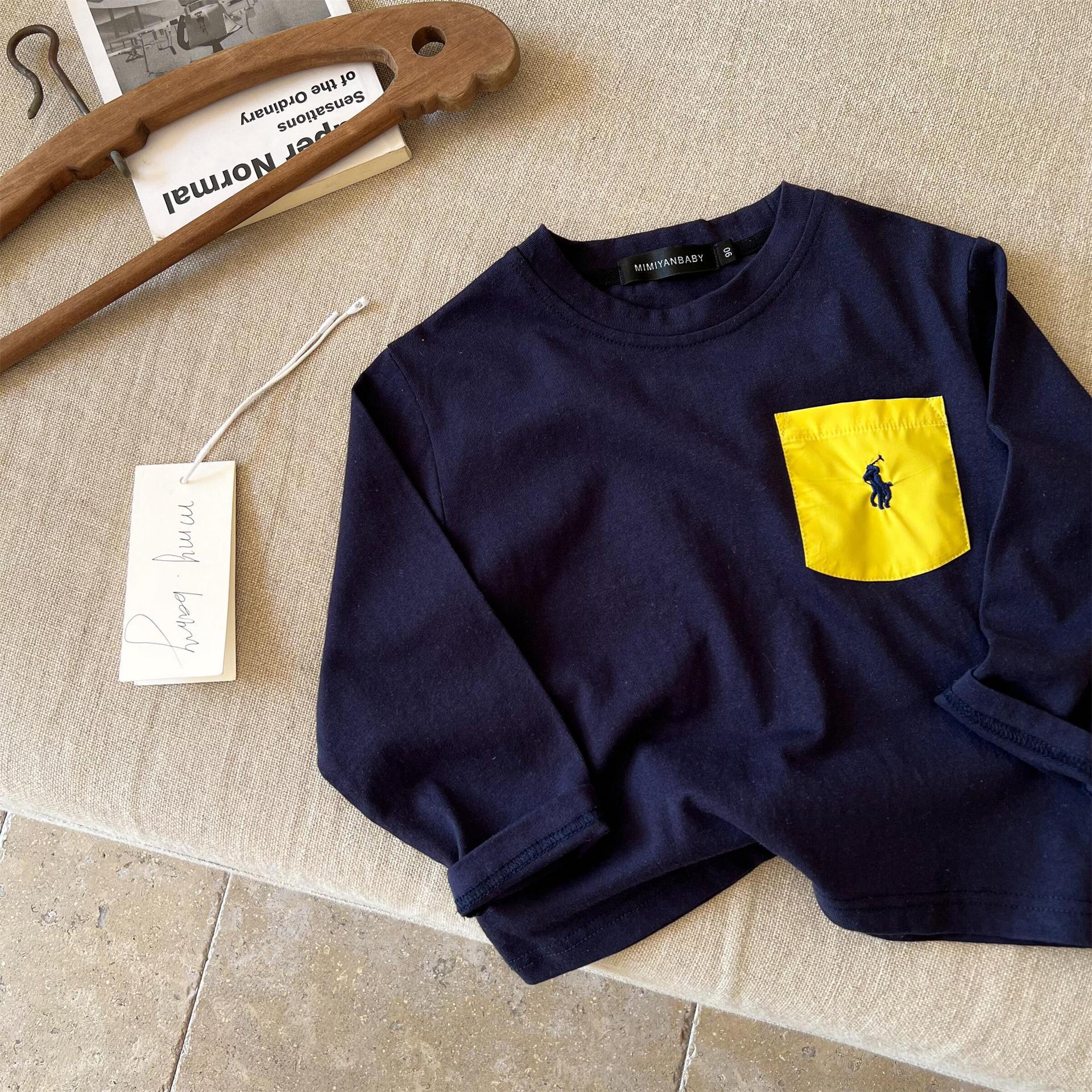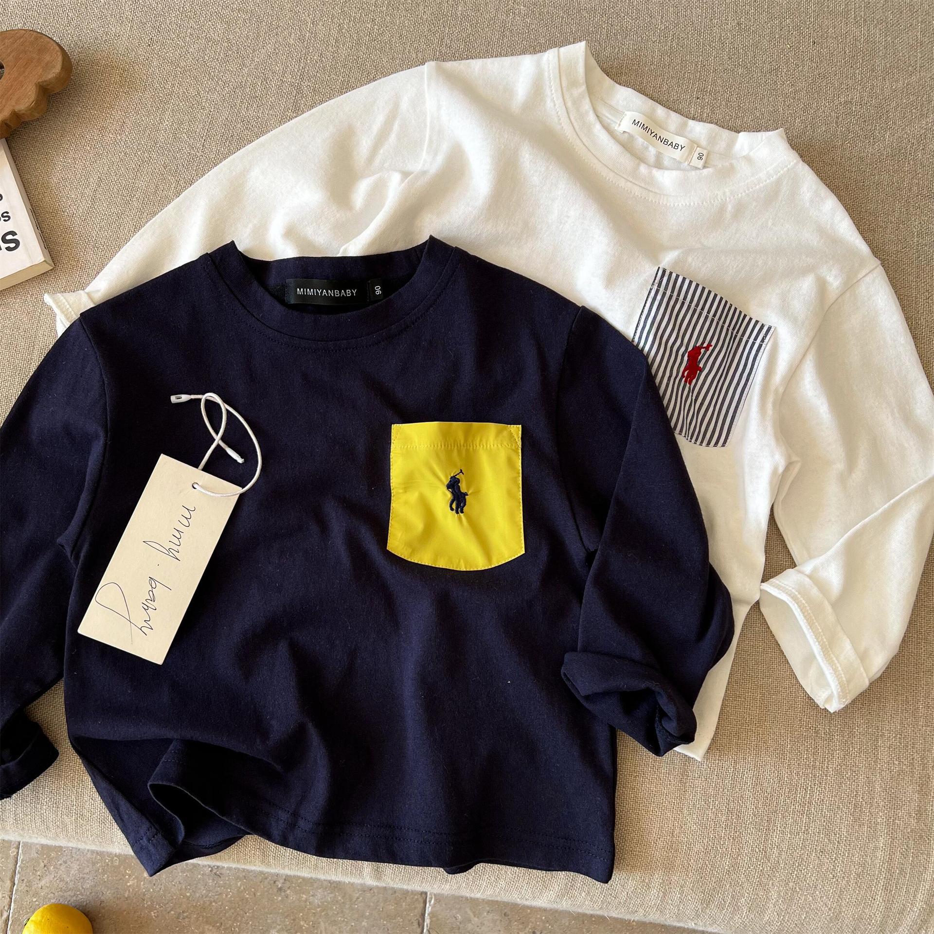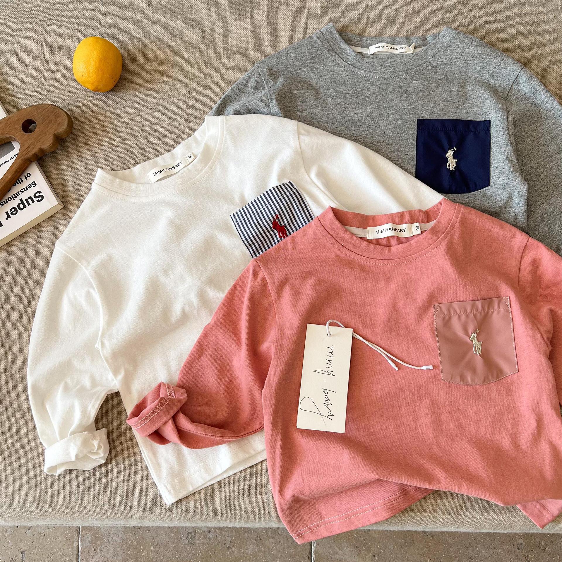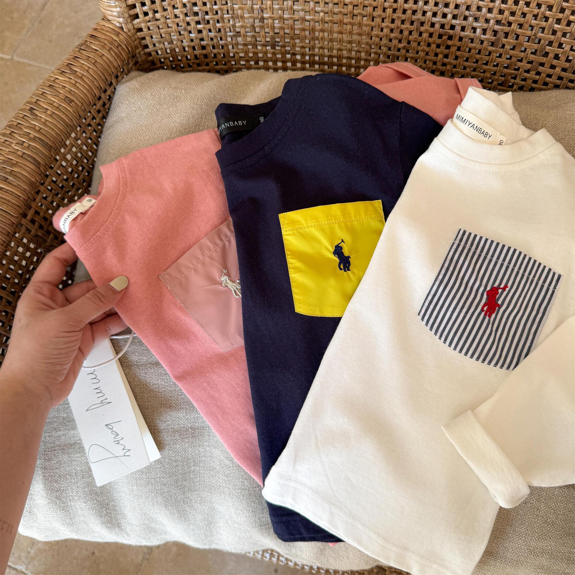 재고 어린이 티셔츠 2025 봄 새로운 남녀 아동복 컬러 포켓 베이스 셔츠 아기 올 매치 티셔츠 조수스토어 가기