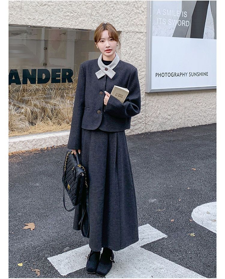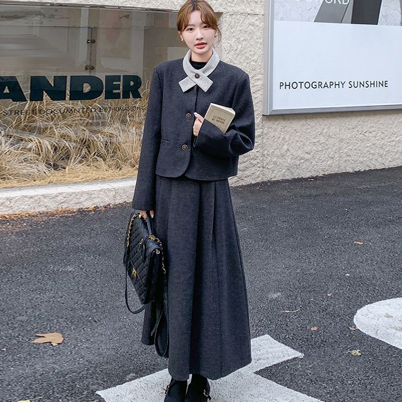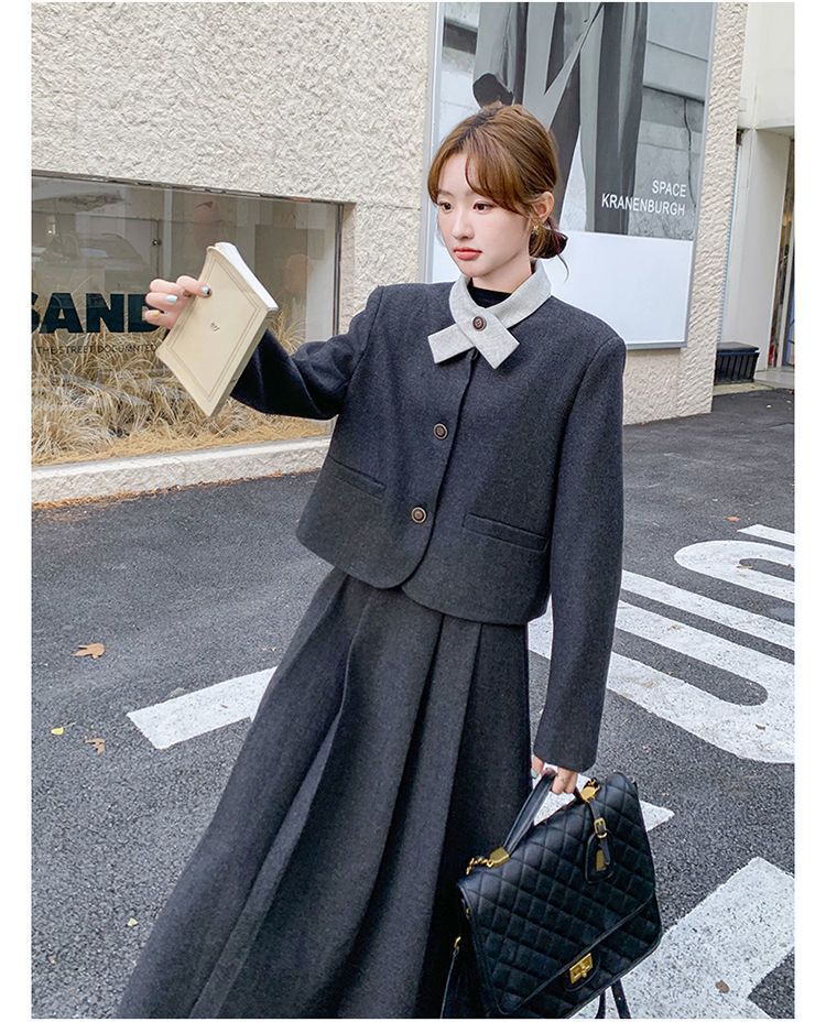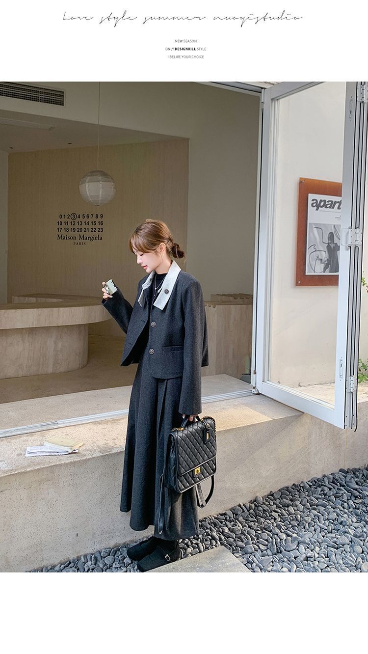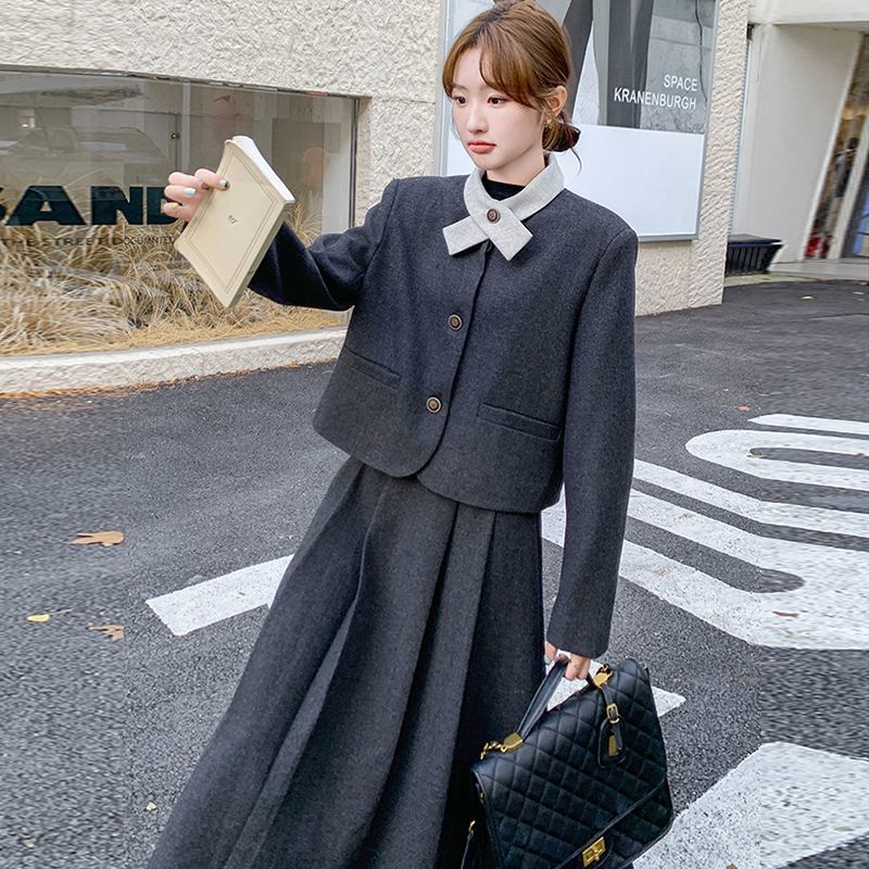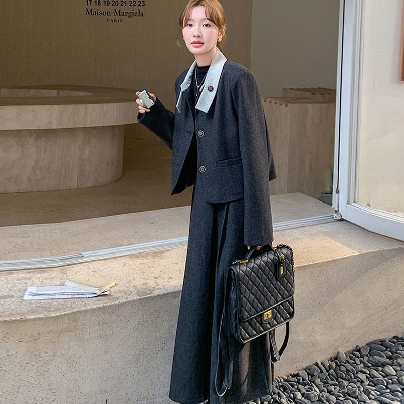원래 품질 모직 원피스 새로운 스타일 우아한 짧은 재킷 여성 스커트 투피스 세트스토어 가기
