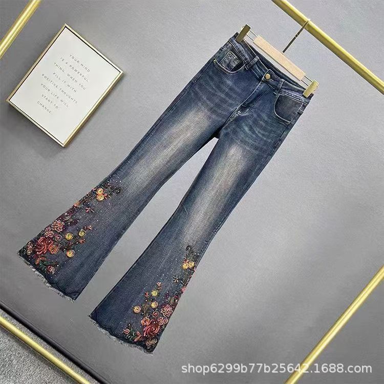 자수 데님 플레어 팬츠 여성의 2024 년 겨울 새로운 높은 허리 슬림 핏 슬리밍 민족 중공업 기모 바지스토어 가기