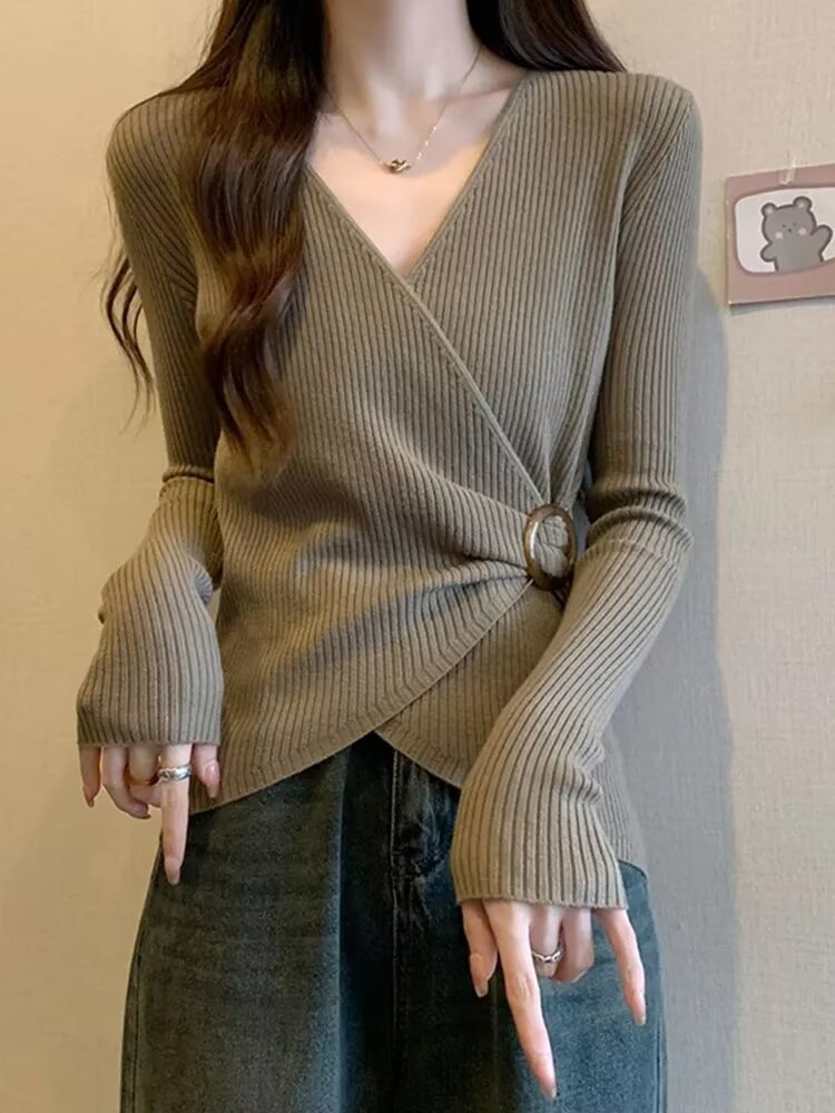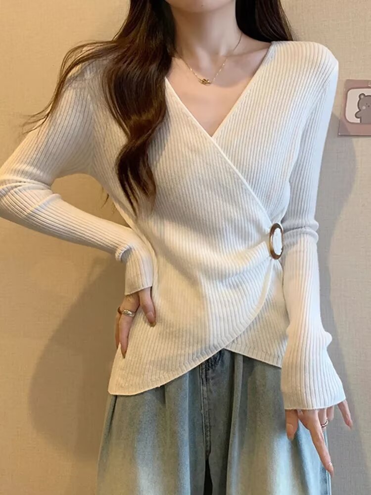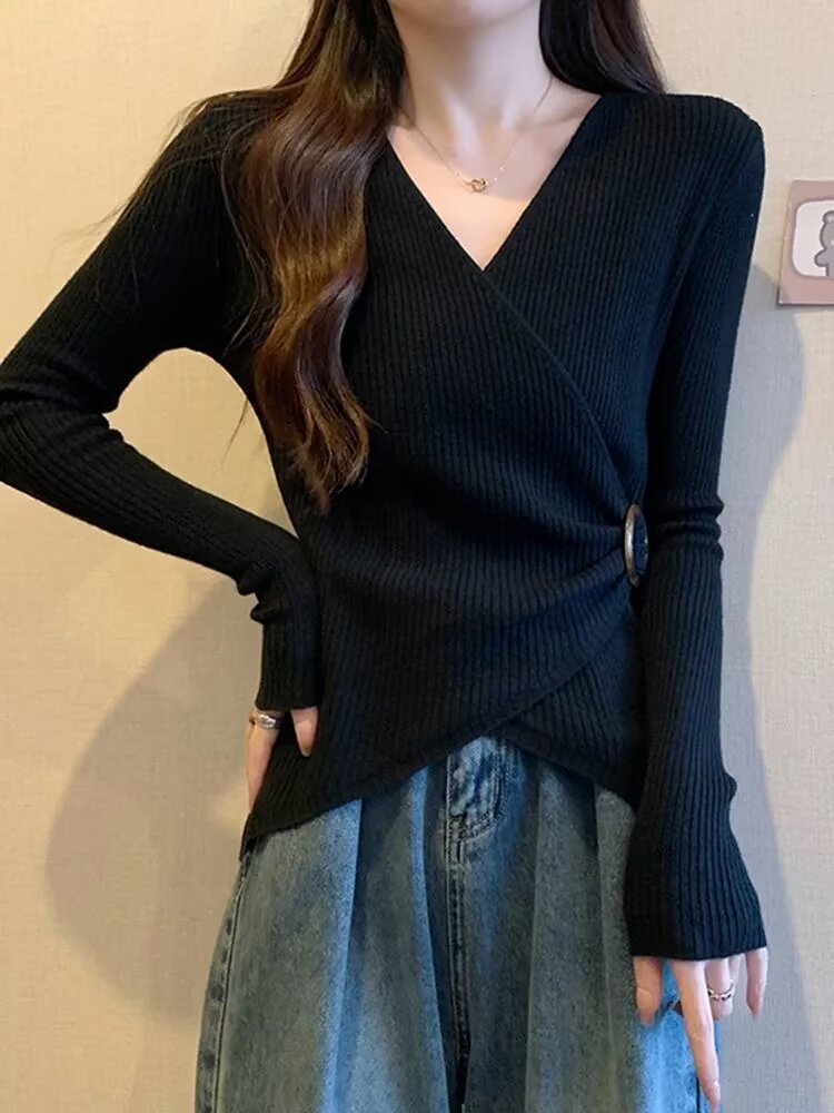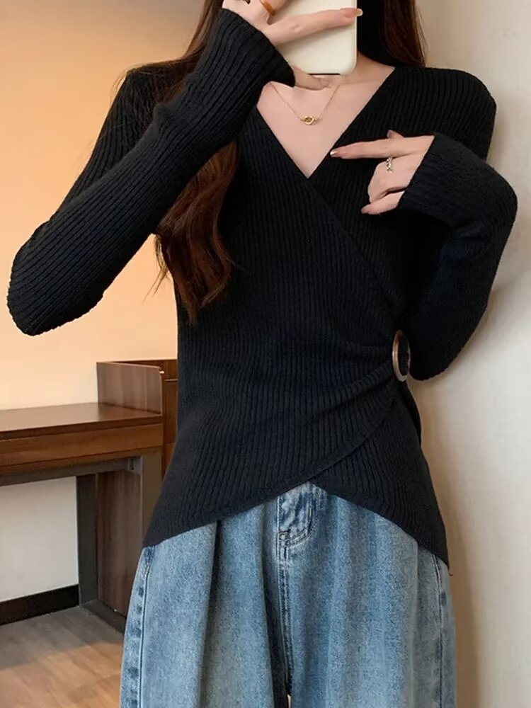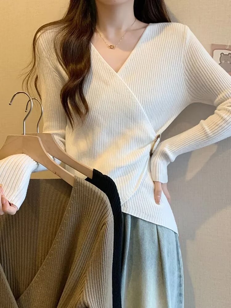 플러스 사이즈 디자인 센스 어깨 긴팔 니트 스웨터 여성의 이른 가을 불규칙한 통통녀 육체 덮개 슬림 내베이스 탑