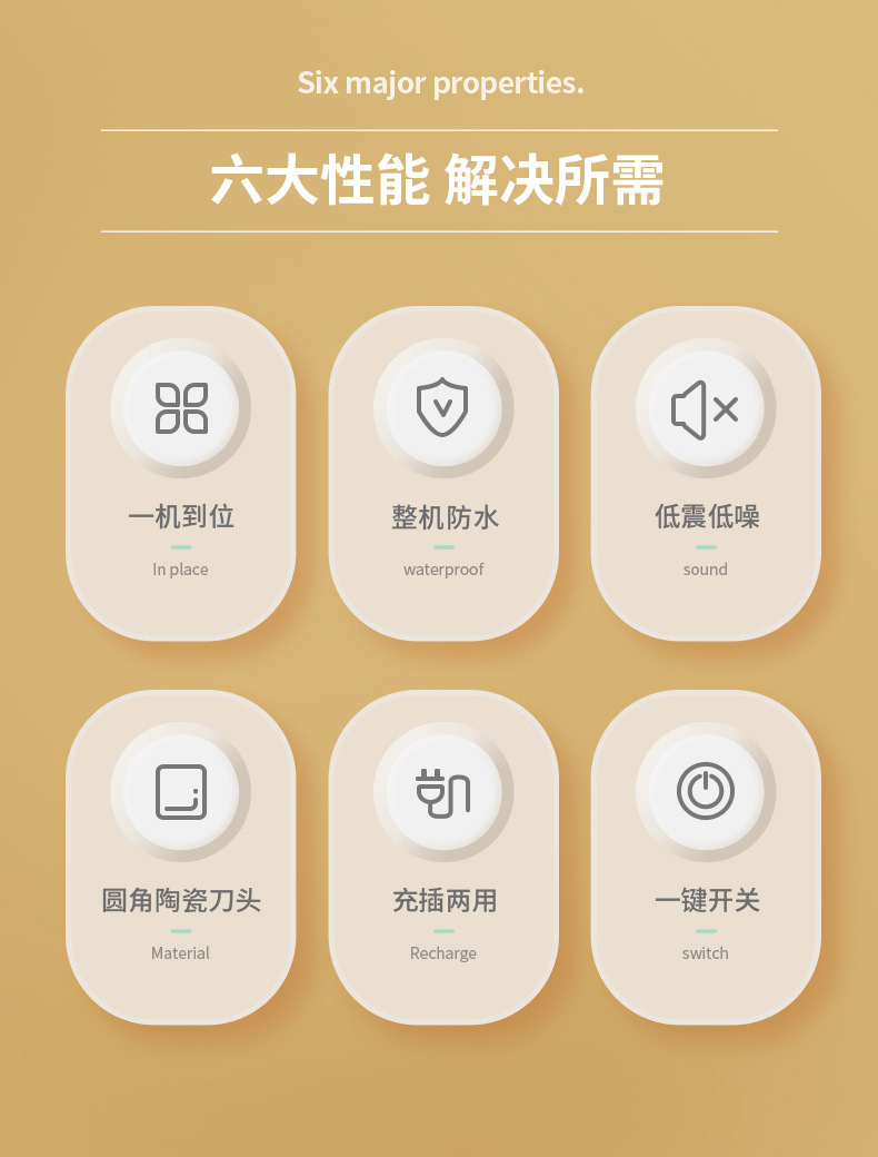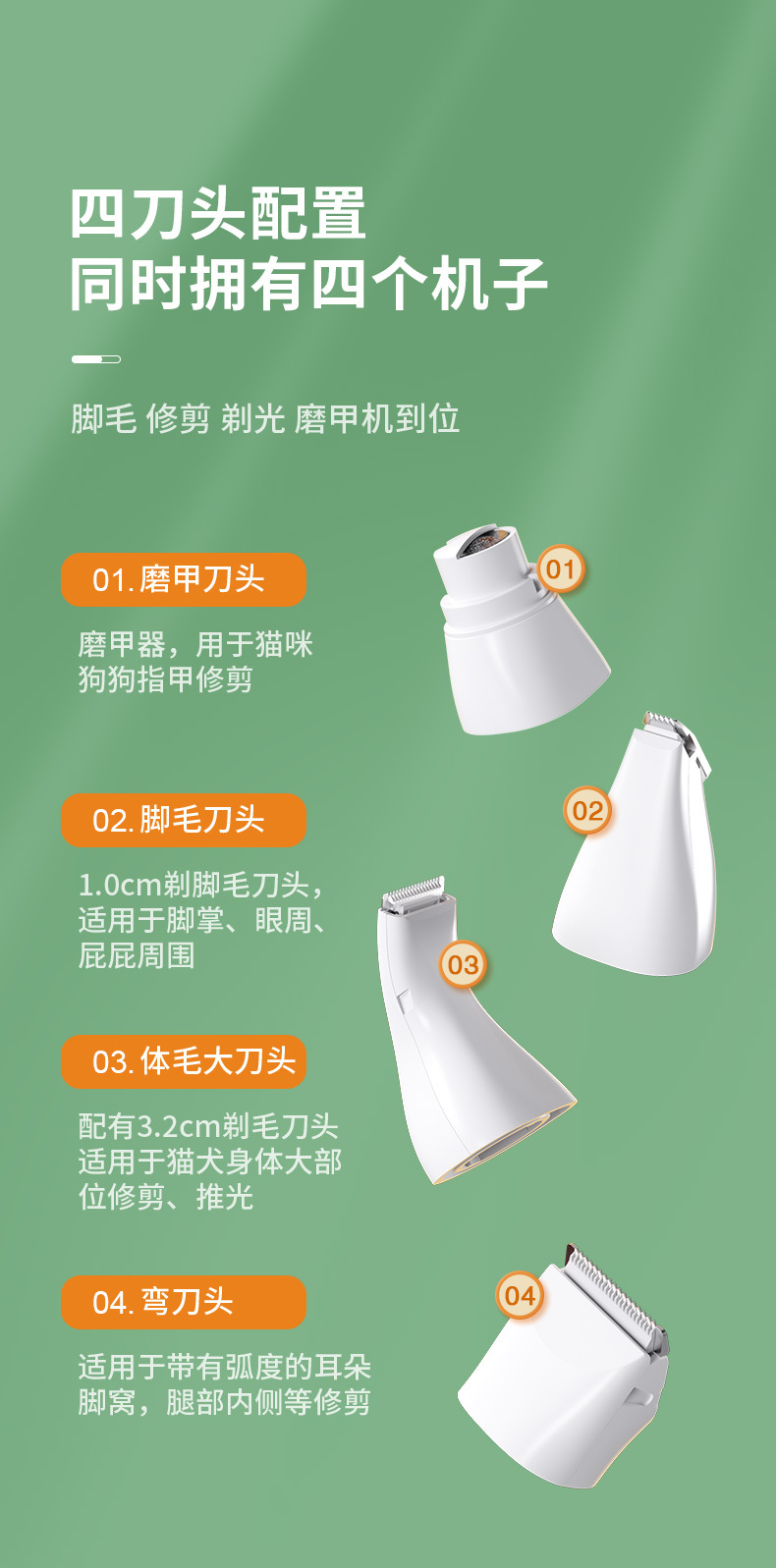 产品配件:包装盒、说明书、3个限位梳、一个USB充电线、一瓶润滑油、一只清洁刷