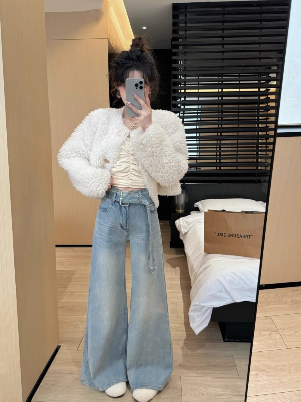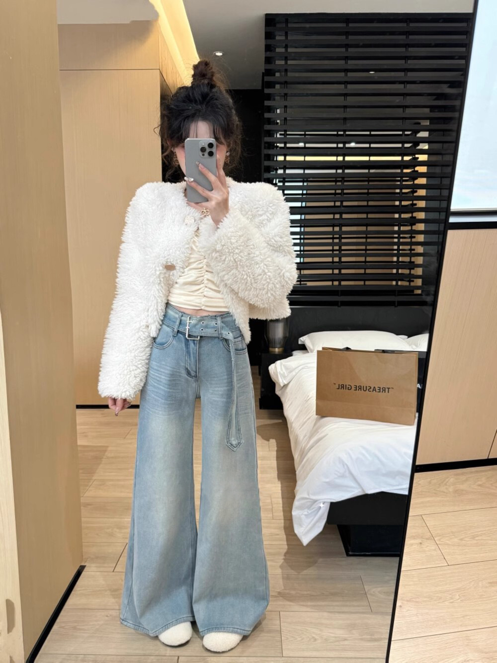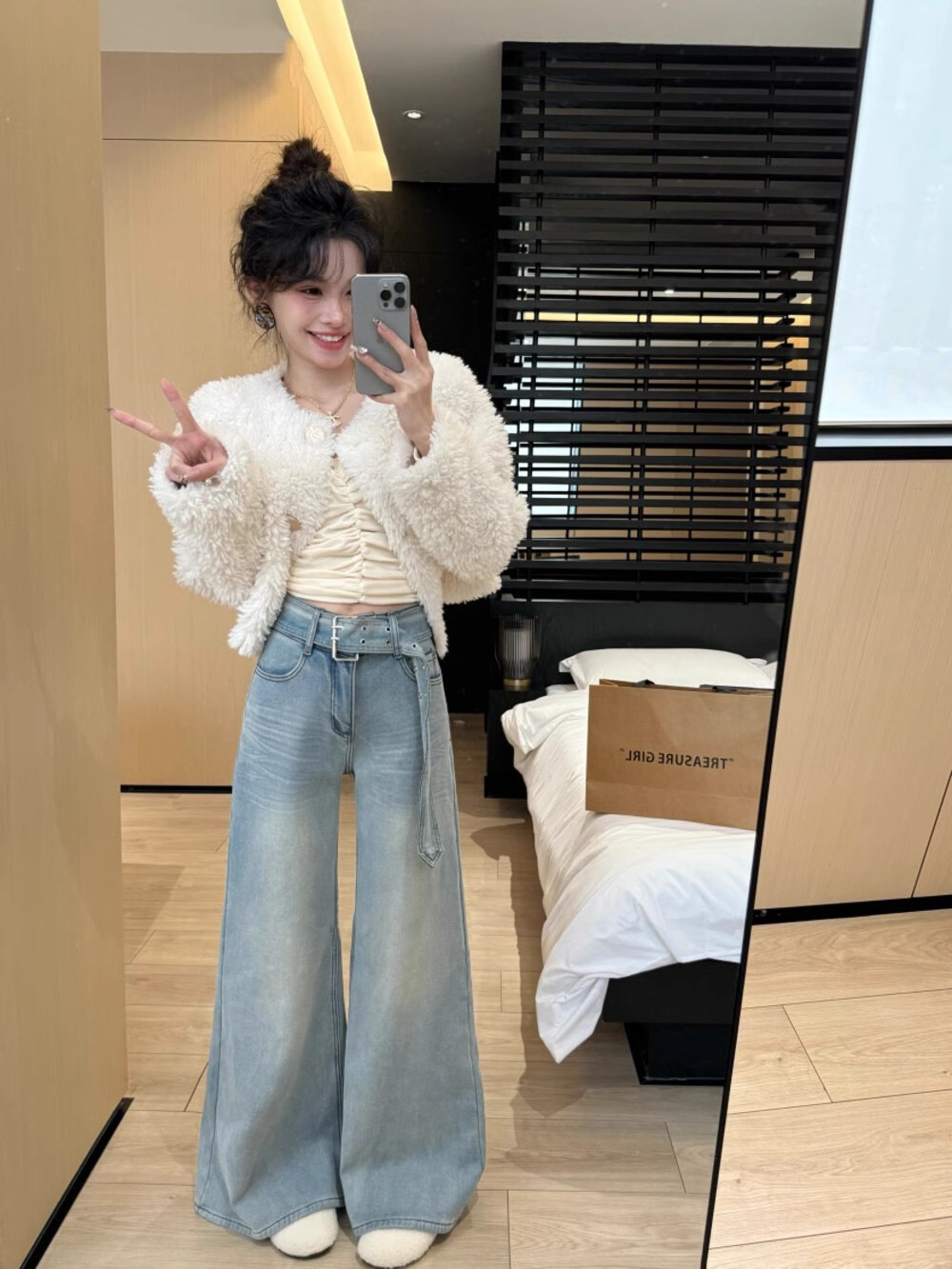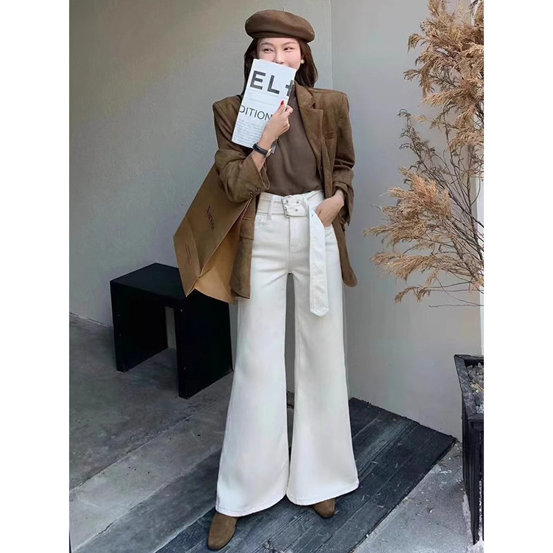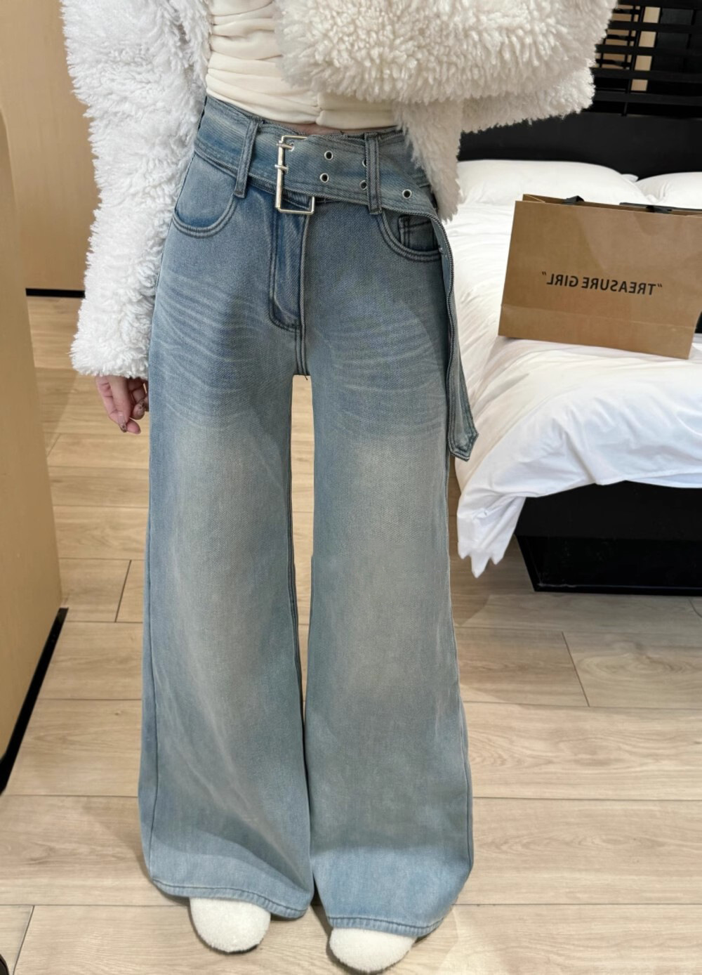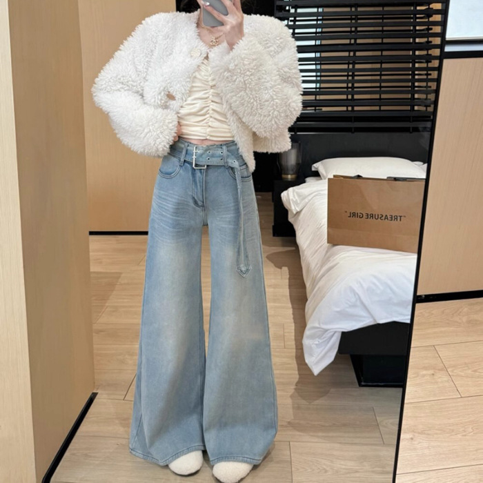봄 2025 새로운 도착 높은 허리 유행 스트레치 넓은 다리 청바지 여성용 복고풍 느슨한 슬림 핏 다리가없는 걸레 바지스토어 가기