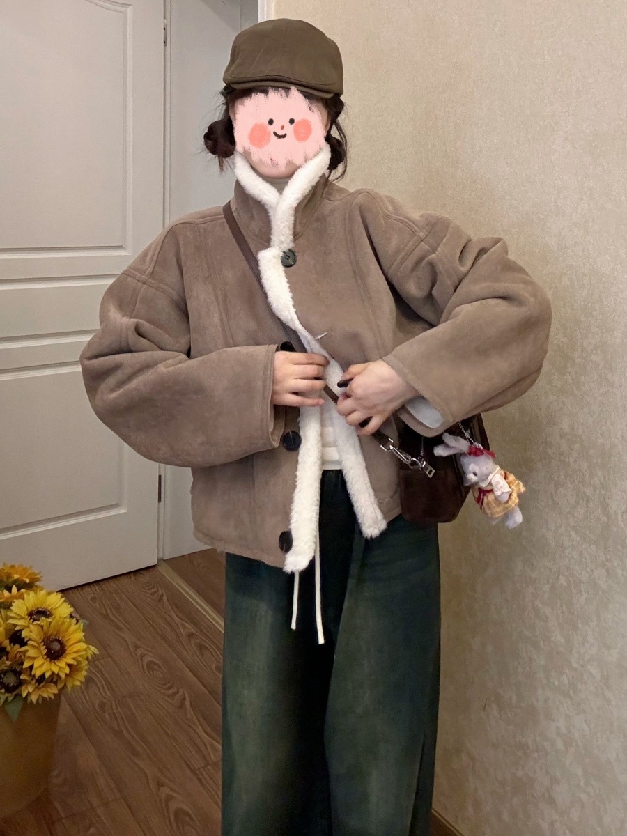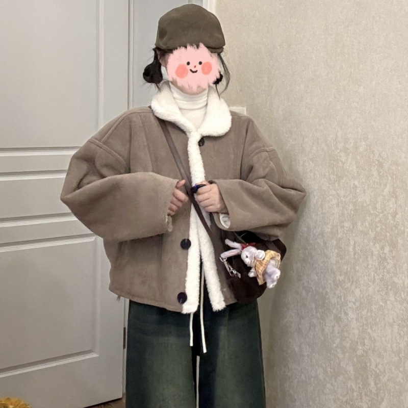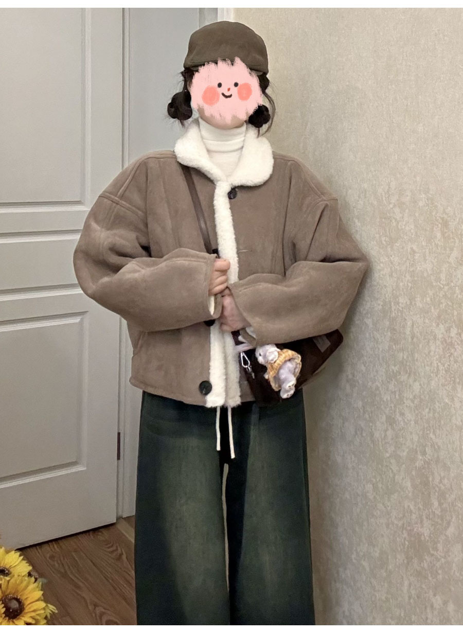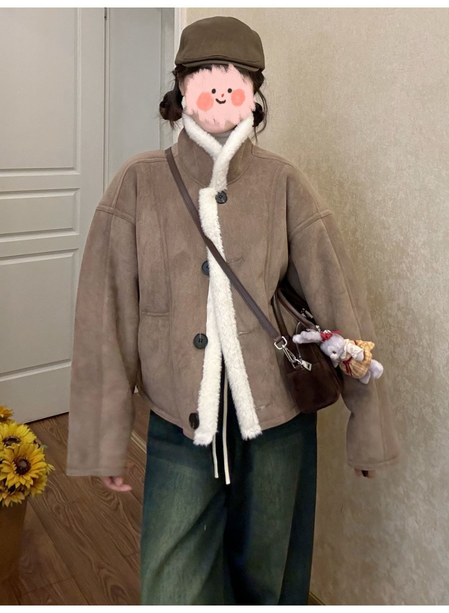 스웨이드 겉옷 코트 여성용 가을과 겨울 모피 원피스 두꺼운 레트로 느슨한 슬리밍 짧은 카디건 탑