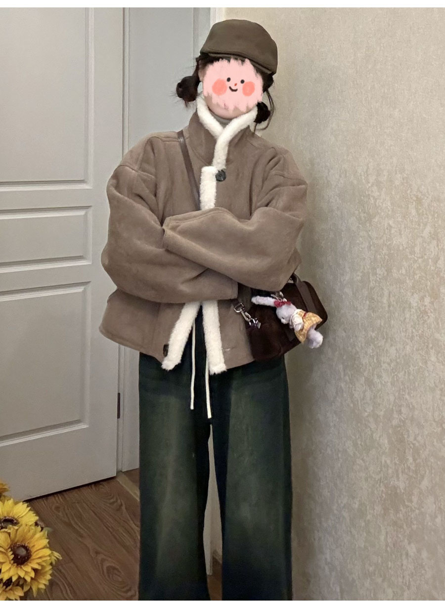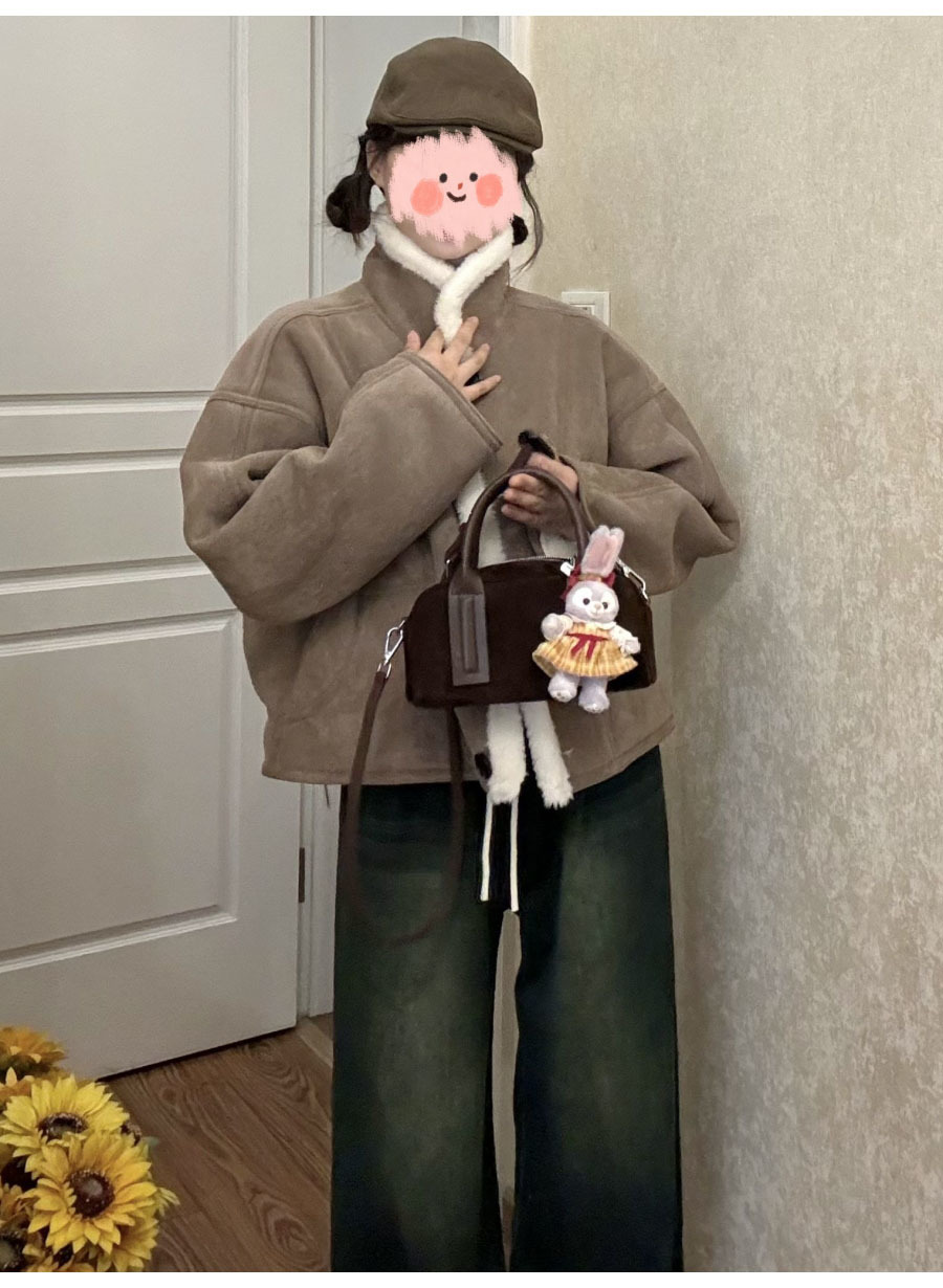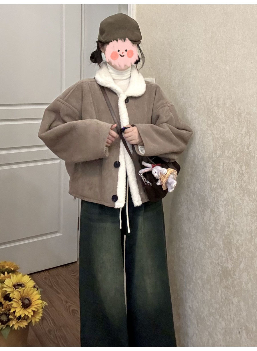 스웨이드 겉옷 코트 여성용 가을과 겨울 모피 원피스 두꺼운 레트로 느슨한 슬리밍 짧은 카디건 탑