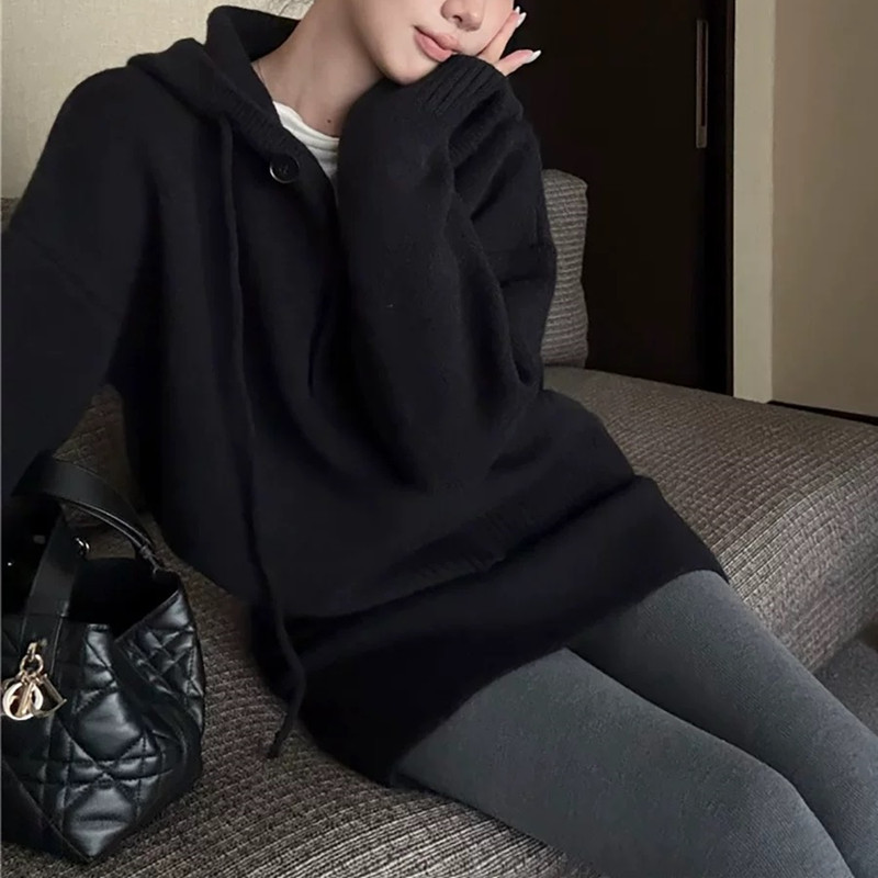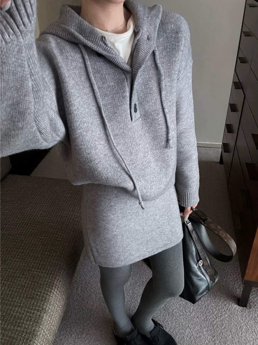 캐주얼 세트 게으른 스타일 후드 긴팔 풀오버 스웨터 여성용 가을 및 겨울 착용 니트 스커트 그레이 투피스 세트 착용
