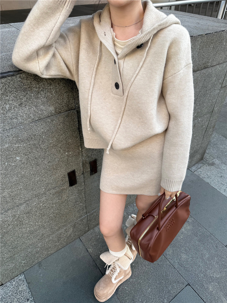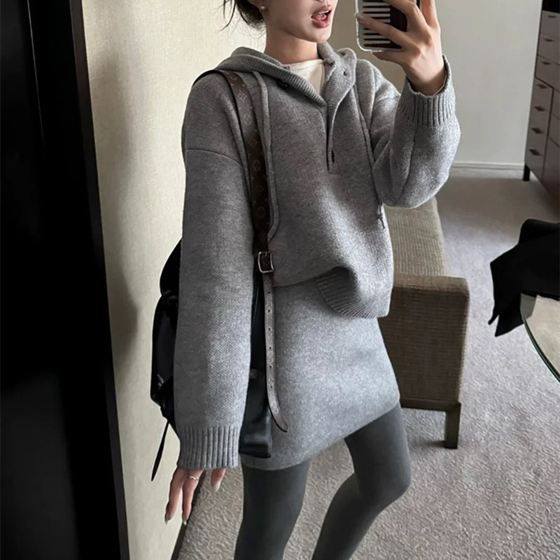 캐주얼 세트 게으른 스타일 후드 긴팔 풀오버 스웨터 여성용 가을 및 겨울 착용 니트 스커트 그레이 투피스 세트 착용스토어 가기