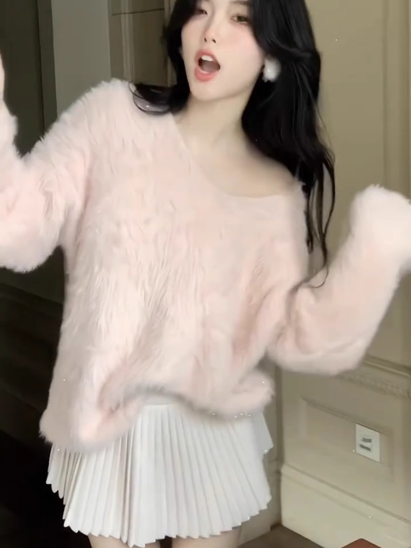 가을과 겨울 새로운 화이트 스웨터 여성의 풀오버 V-넥 긴 머리 안티 밍크 헤어 중간 길이의 스웨터 게으른 루즈 탑
