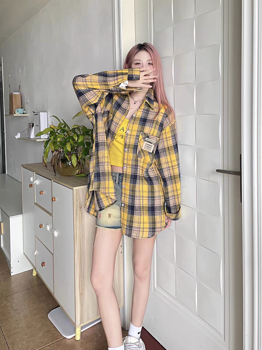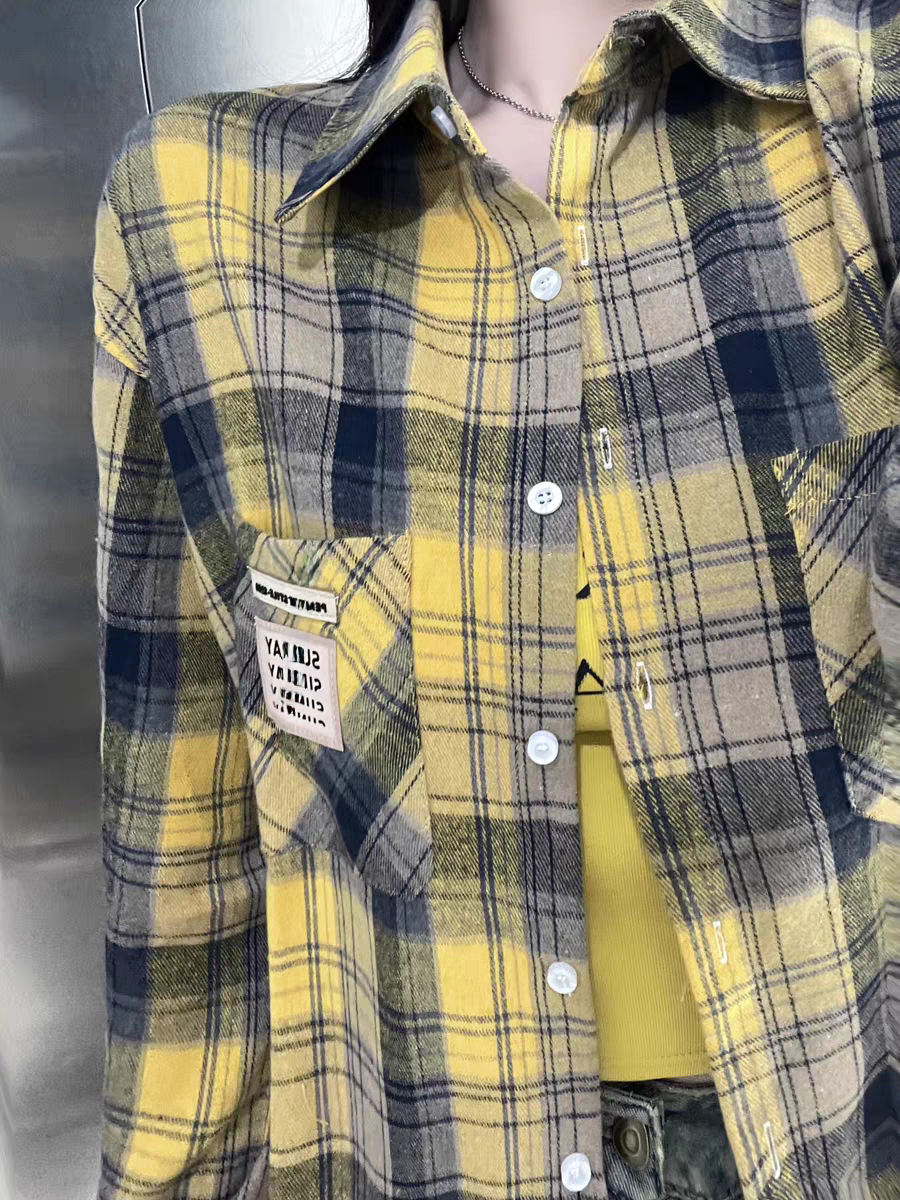노란색 미국 복고풍 컬러 대비 격자 무늬 선스크린 셔츠 남성과 여성의 긴 소매 캐주얼 느슨한 얇은 재킷 셔츠스토어 가기