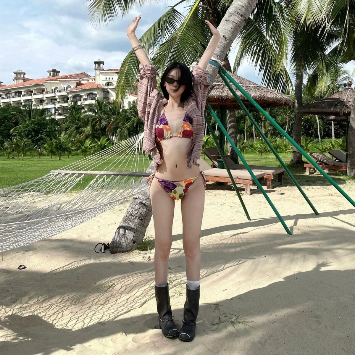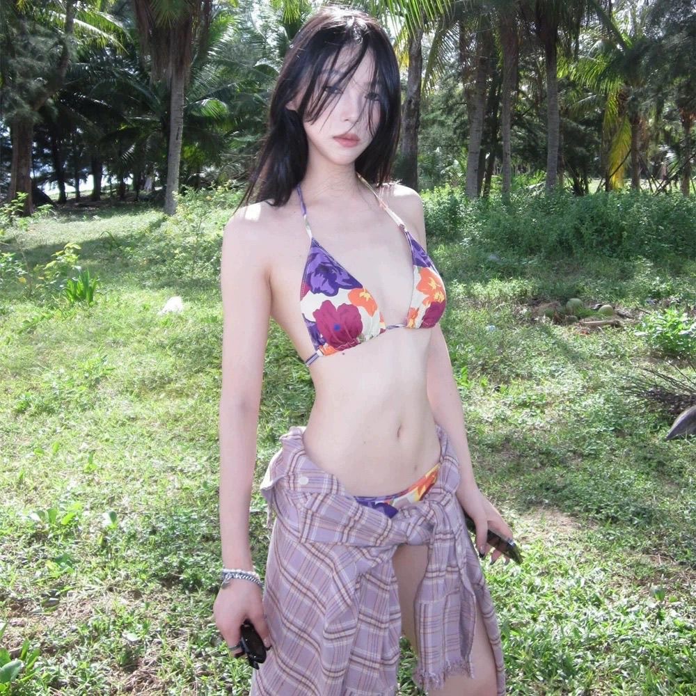 수영복 여성용 복고풍 인쇄 스파이스 소녀 3 점 스트랩 비키니 인 온천 섬 홀리데이 스타일 작은 가슴 모임