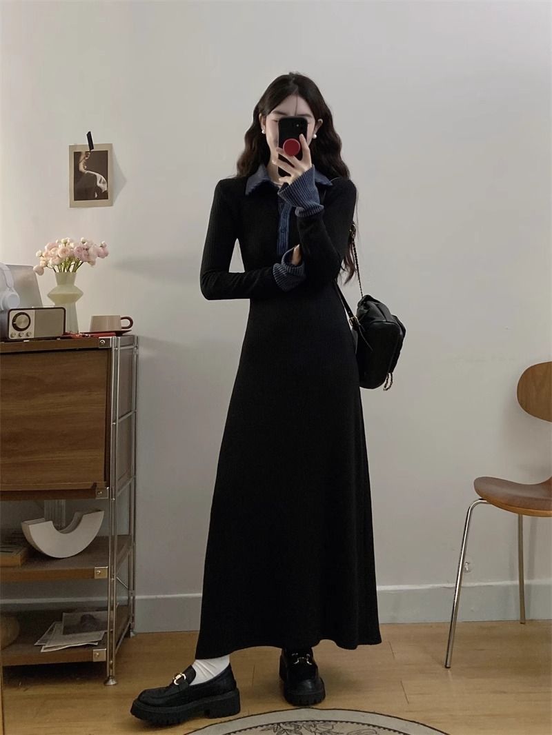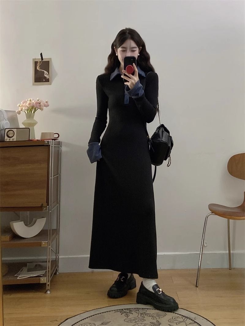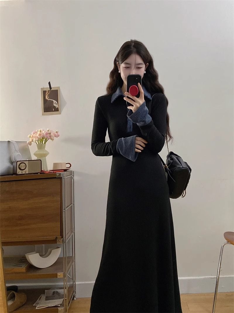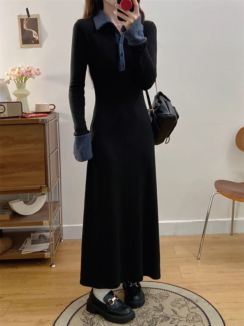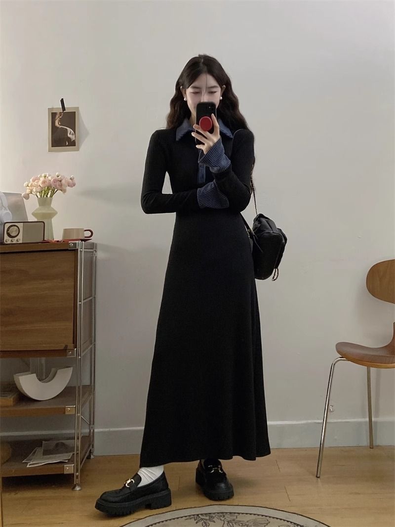바느질 옷깃 니트 원피스 여성용 2024 겨울 새 패션 슬림핏 우아한 슬림 A 라인 허리 긴 원피스