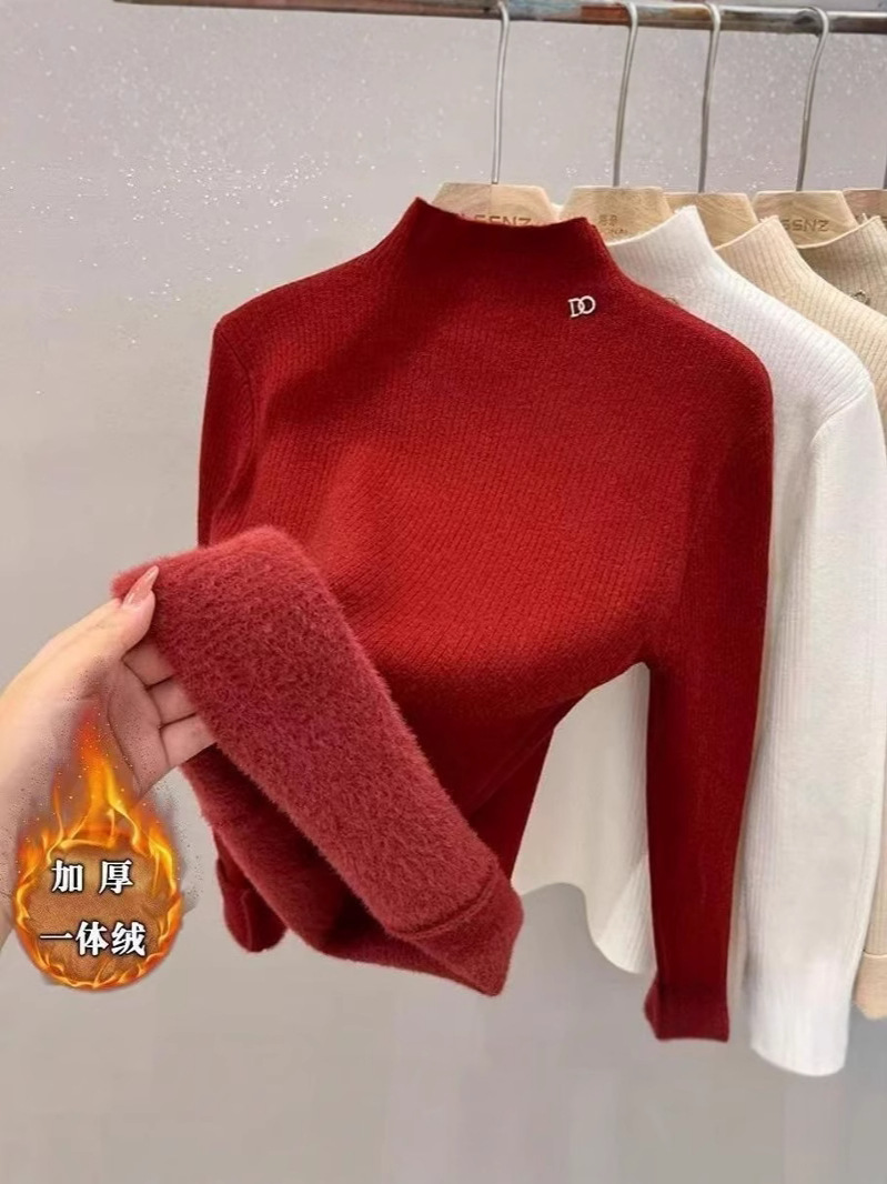 기모 두꺼운 원피스 반터틀넥 스웨터 여성의 가을과 겨울 2024 새로운 니트 내베이스 셔츠 탑