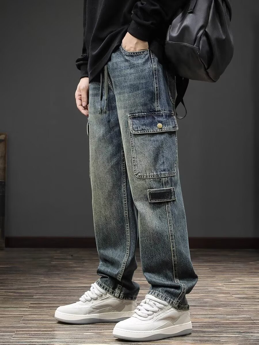 봄과 가을 트렌디 브랜드 빈티지 스트레이트 청바지 남성용 느슨한 캐주얼 엘라스토 허리 바지 넓은 다리스토어 가기