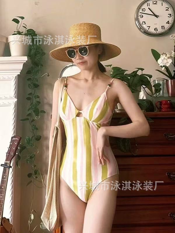 국경 간 한국 인 스타일 온천 휴가 슬리밍 줄무늬 순수한 욕망 작은 향기로운 스타일 작은 가슴 여성을위한 간단한 결합 된 수영복스토어 가기