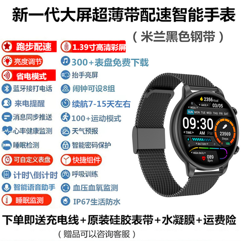 • 블랙 색상의 2세대 밀라노 스틸 고급 버전( 1.39inch HD 대형 화면/스포츠 속도 구성/메시지 푸시/음성 도우미/건강 모니터링)