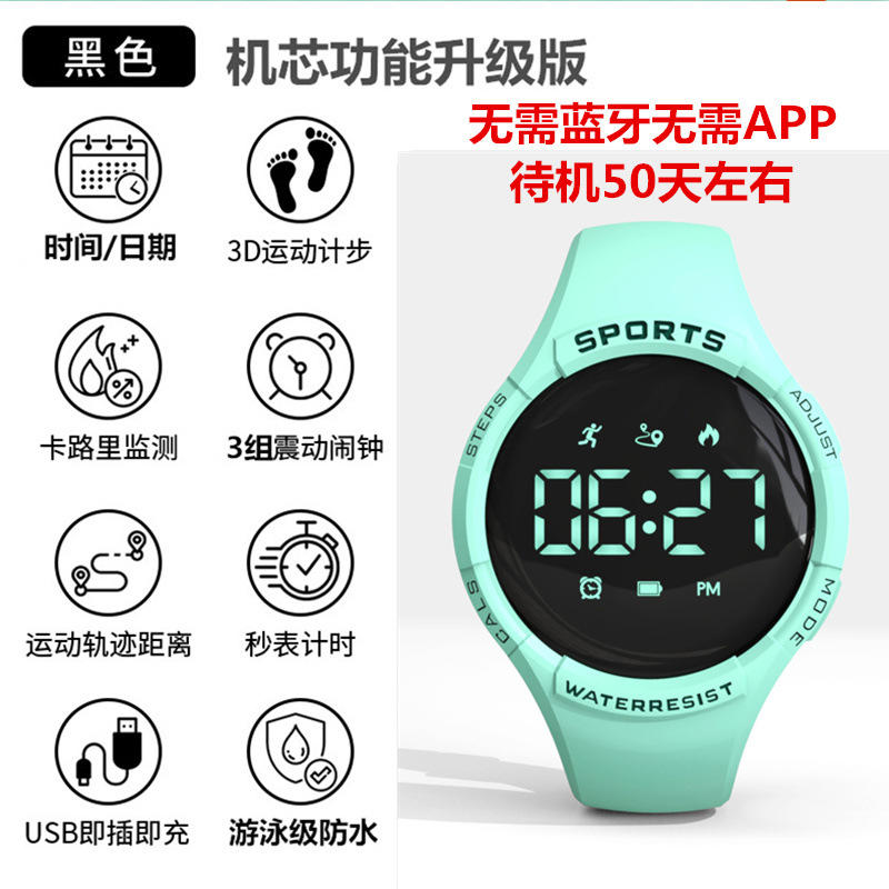 • 청소년 녹색 수영 등급 방수 Bluetooth 연결 없음 3D 걸음 수 계산/칼로리/3 세트 알람 시계/수영 방수
