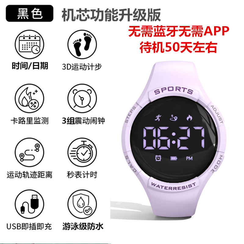 • 우아한 보라색 수영 등급 방수 Bluetooth 연결 없음 3D 걸음 수 계산/칼로리/3 세트 알람 시계/수영 방수