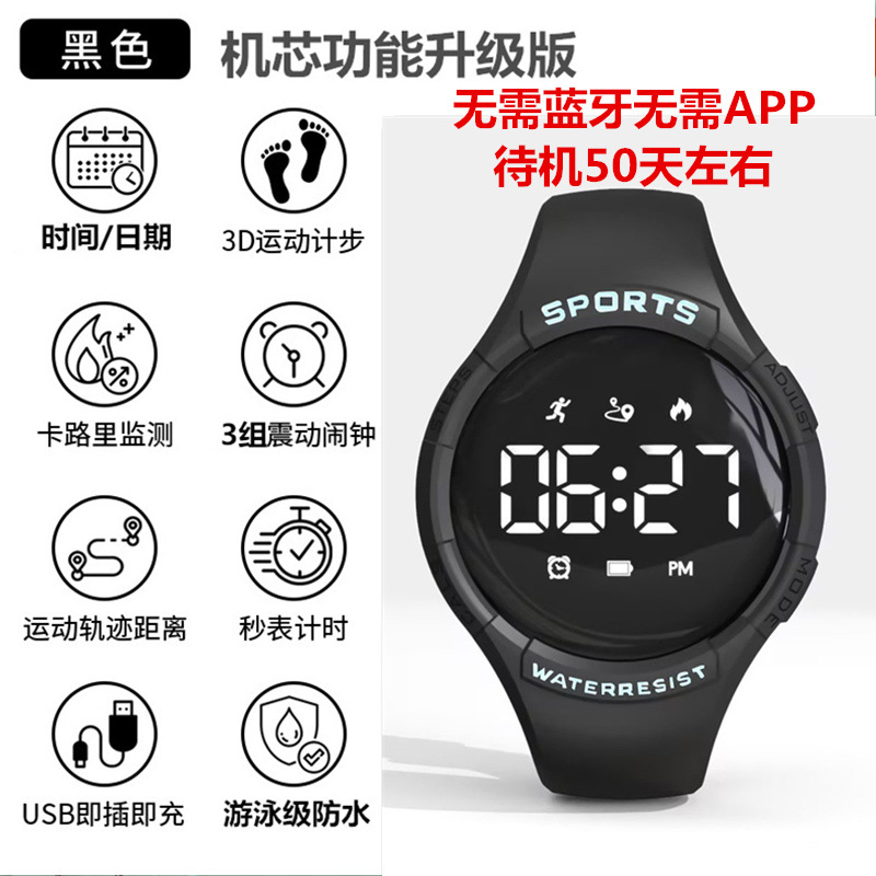 • 멋진 검정색 수영 등급 방수 Bluetooth 연결 없음 버전 3D 걸음 수 계산/칼로리/3 세트 알람 시계/수영 방수