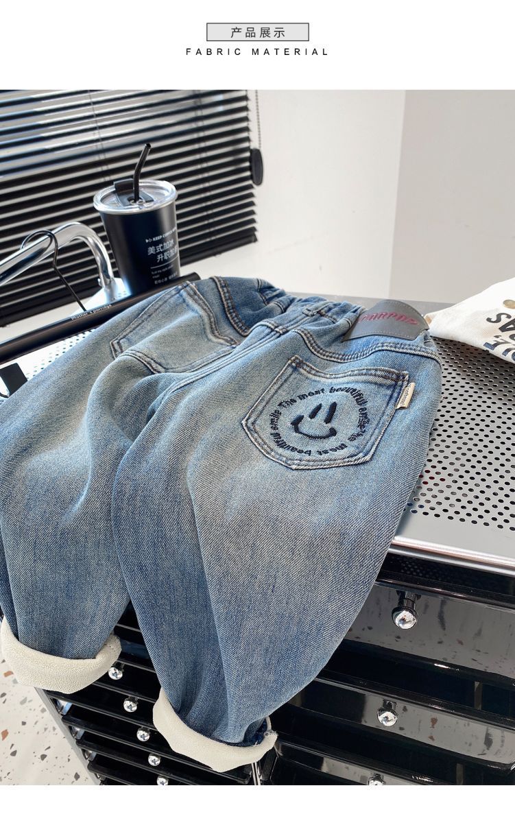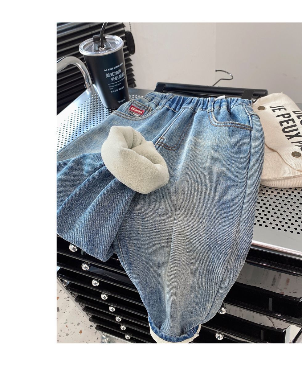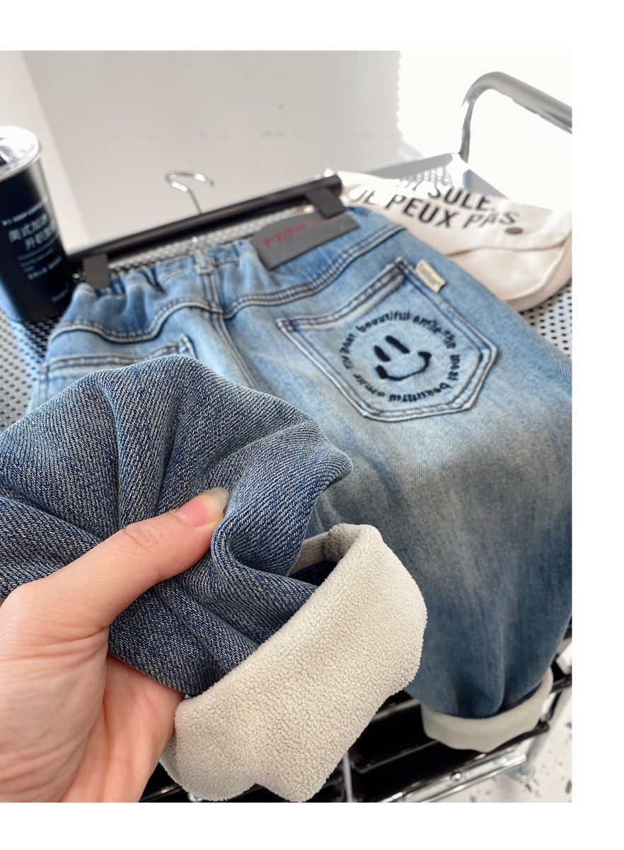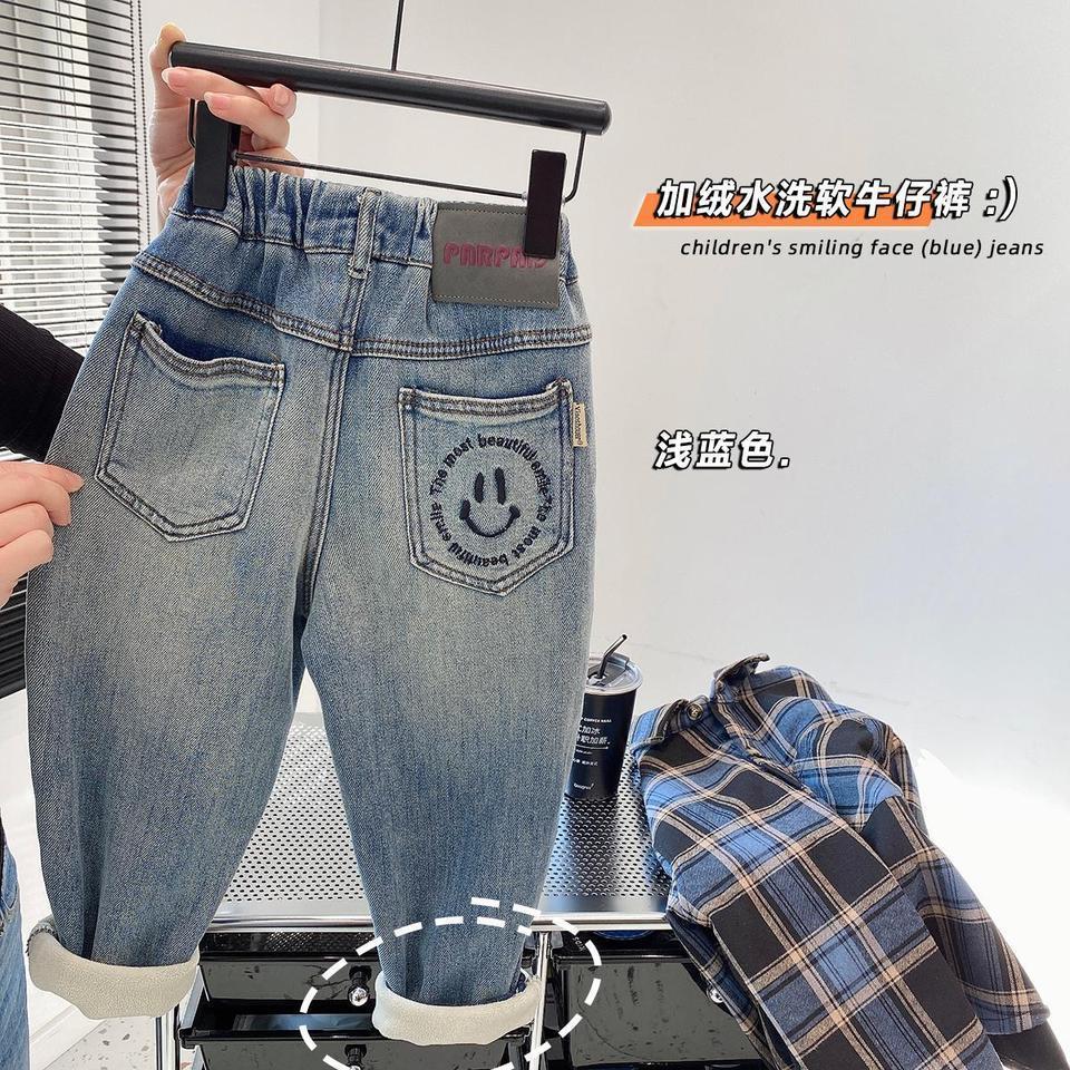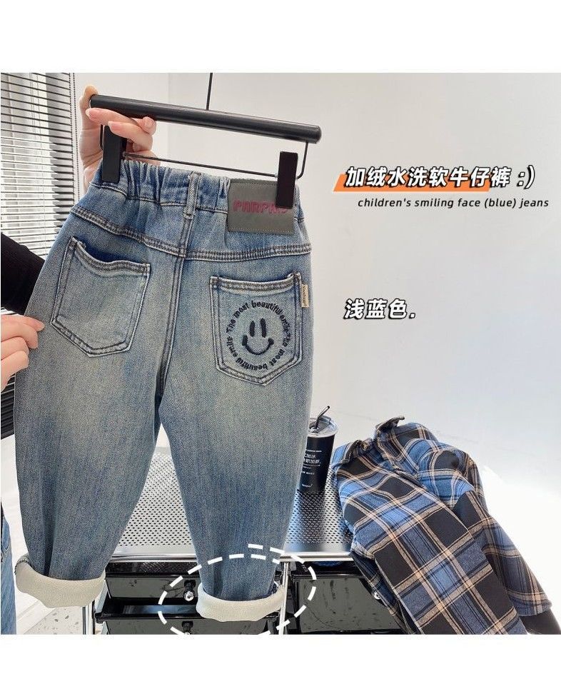 소년 청바지 아동 겨울 의류 2024 새로운 겨울 따뜻한 올인원 벨벳 웃는 얼굴 플러스 벨벳 두꺼운 다용도 바지스토어 가기