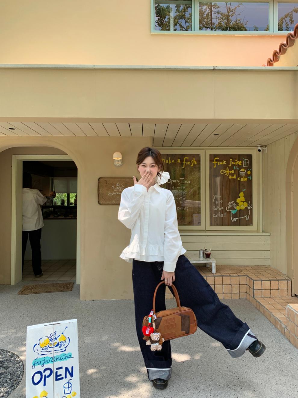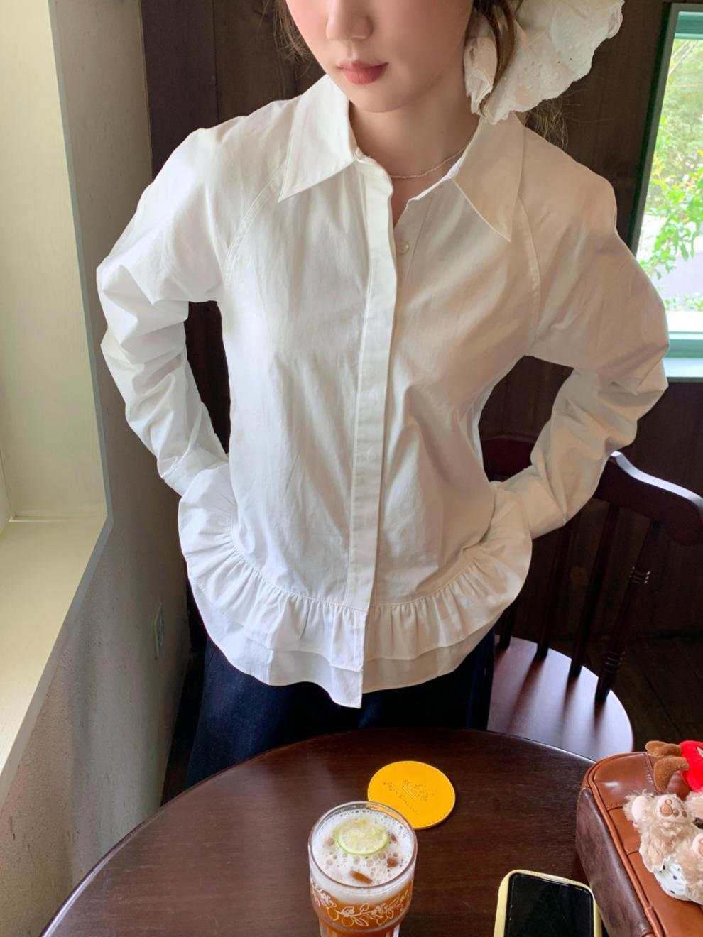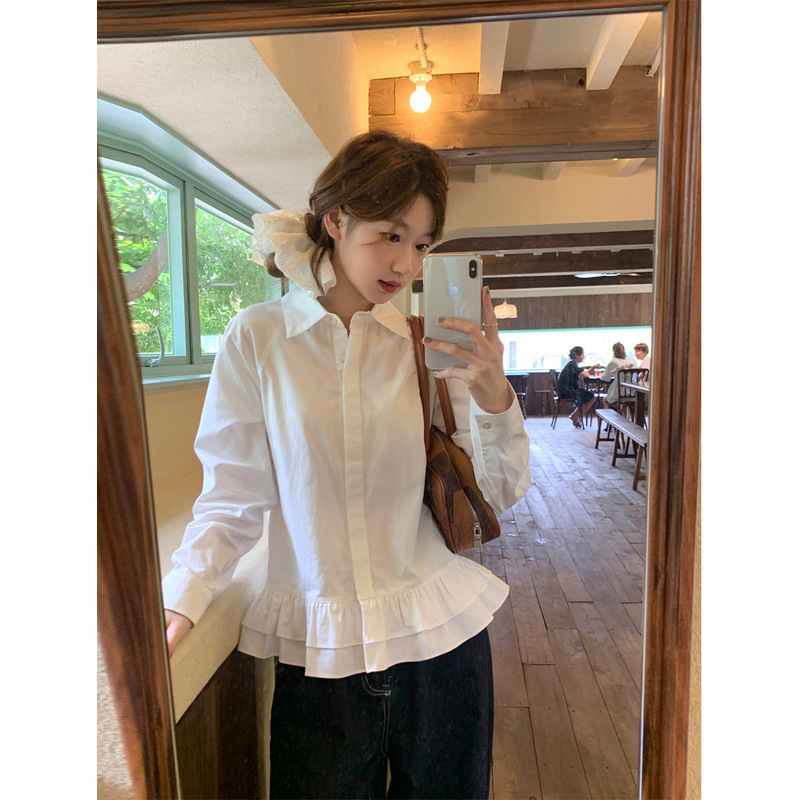 대학 스타일 화이트 셔츠 여성 디자인 센스 러플 달콤한 셔츠 작은 슈퍼 페어리 스택 탑 Ins 트렌디스토어 가기