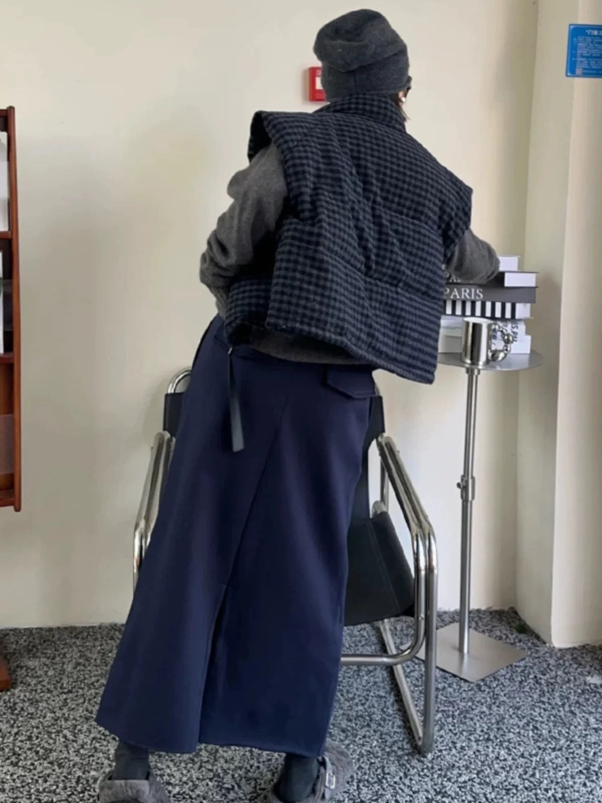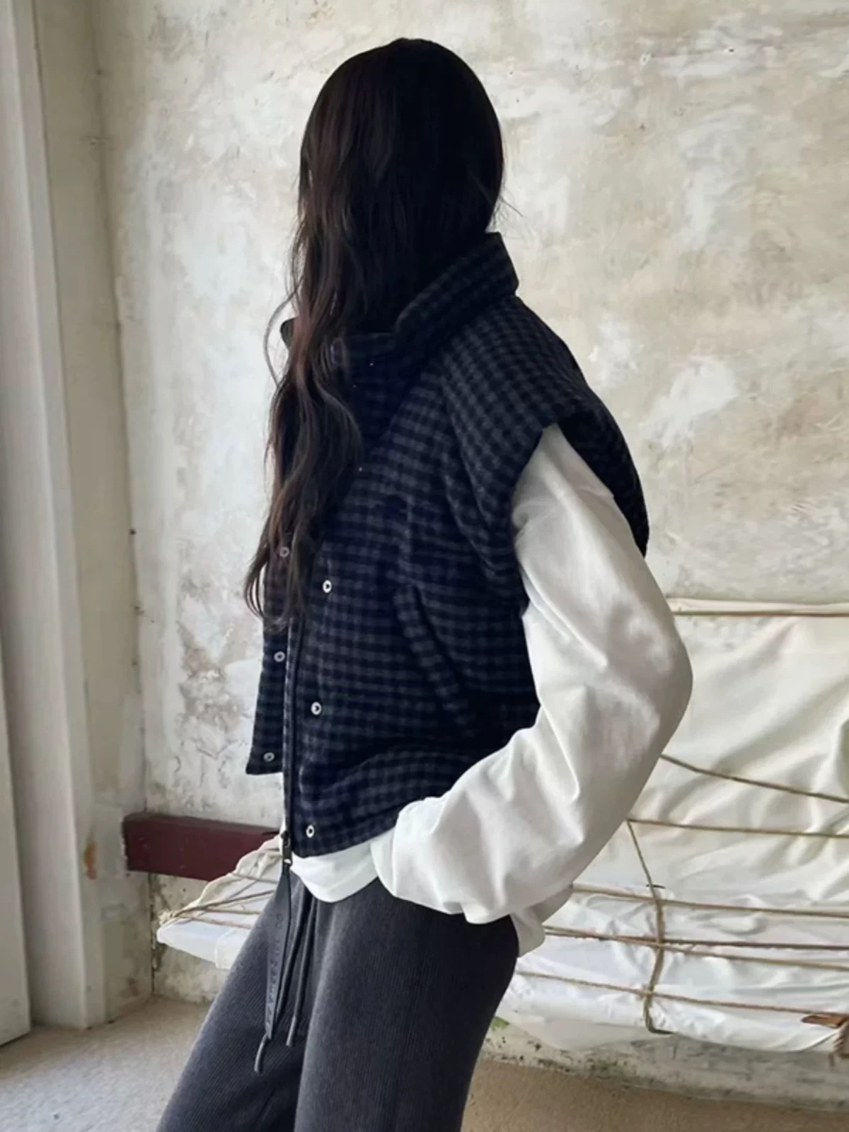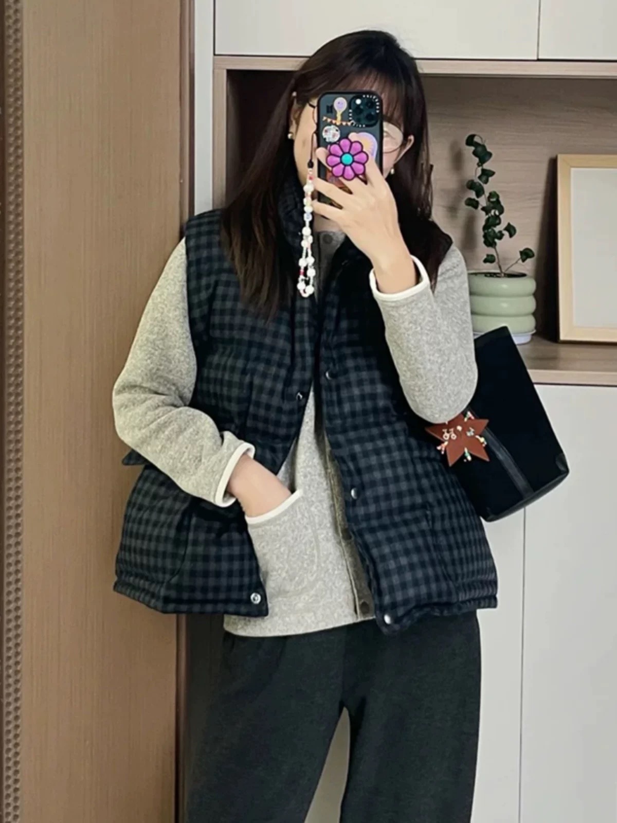 한국 없음 * 쓰기 * en 복고풍 격자 무늬 울 화이트 거위 다운 조끼 24 겨울 스탠드 칼라 조끼스토어 가기