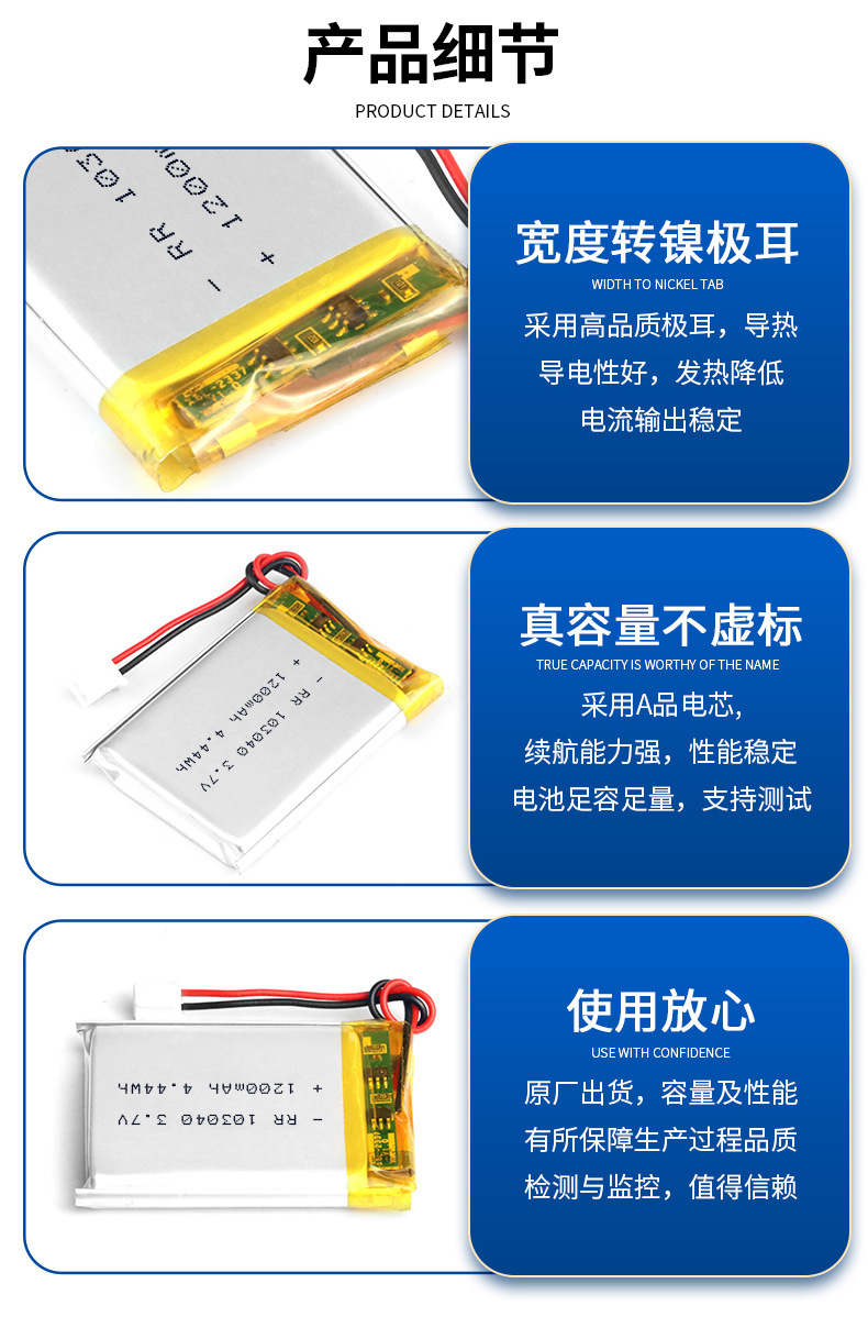 103040 폴리머 리튬 배터리 1200mAh 블루투스 오디오 미용기기 무전기 3.7V 배터리 셀